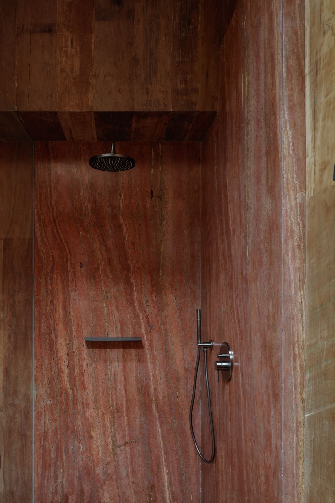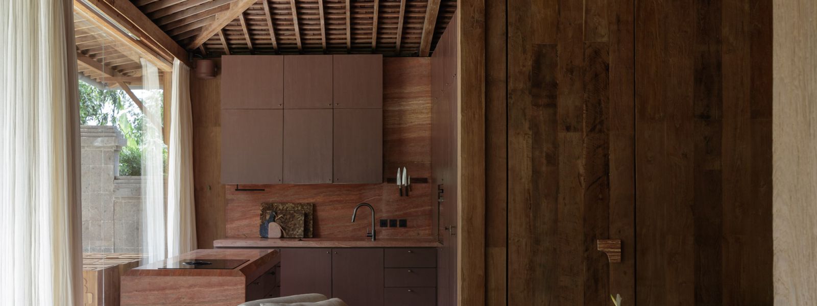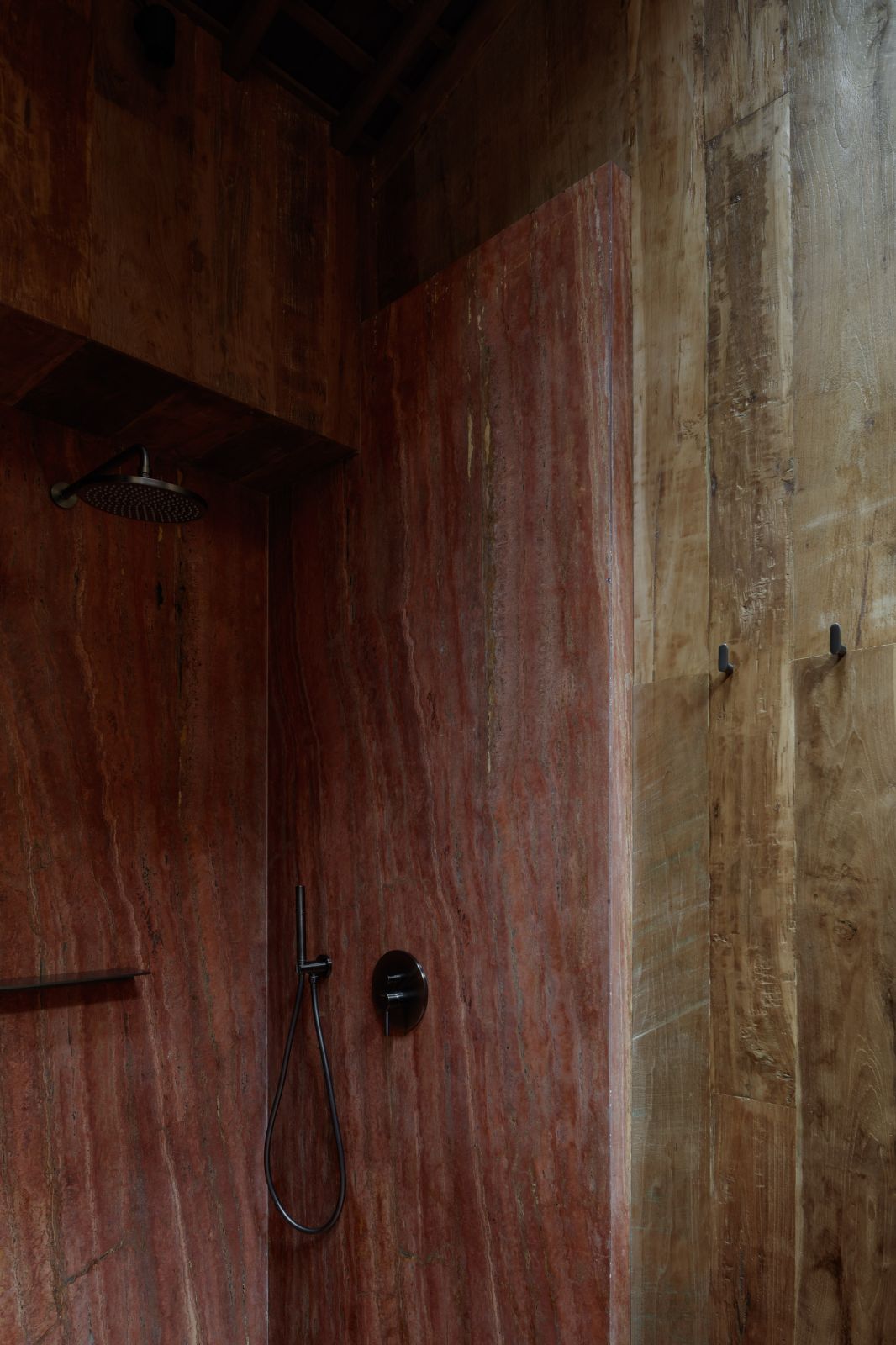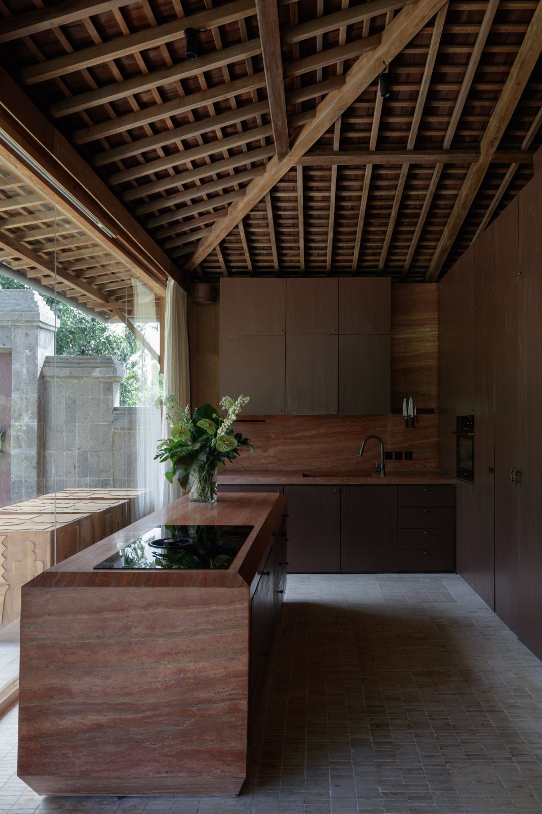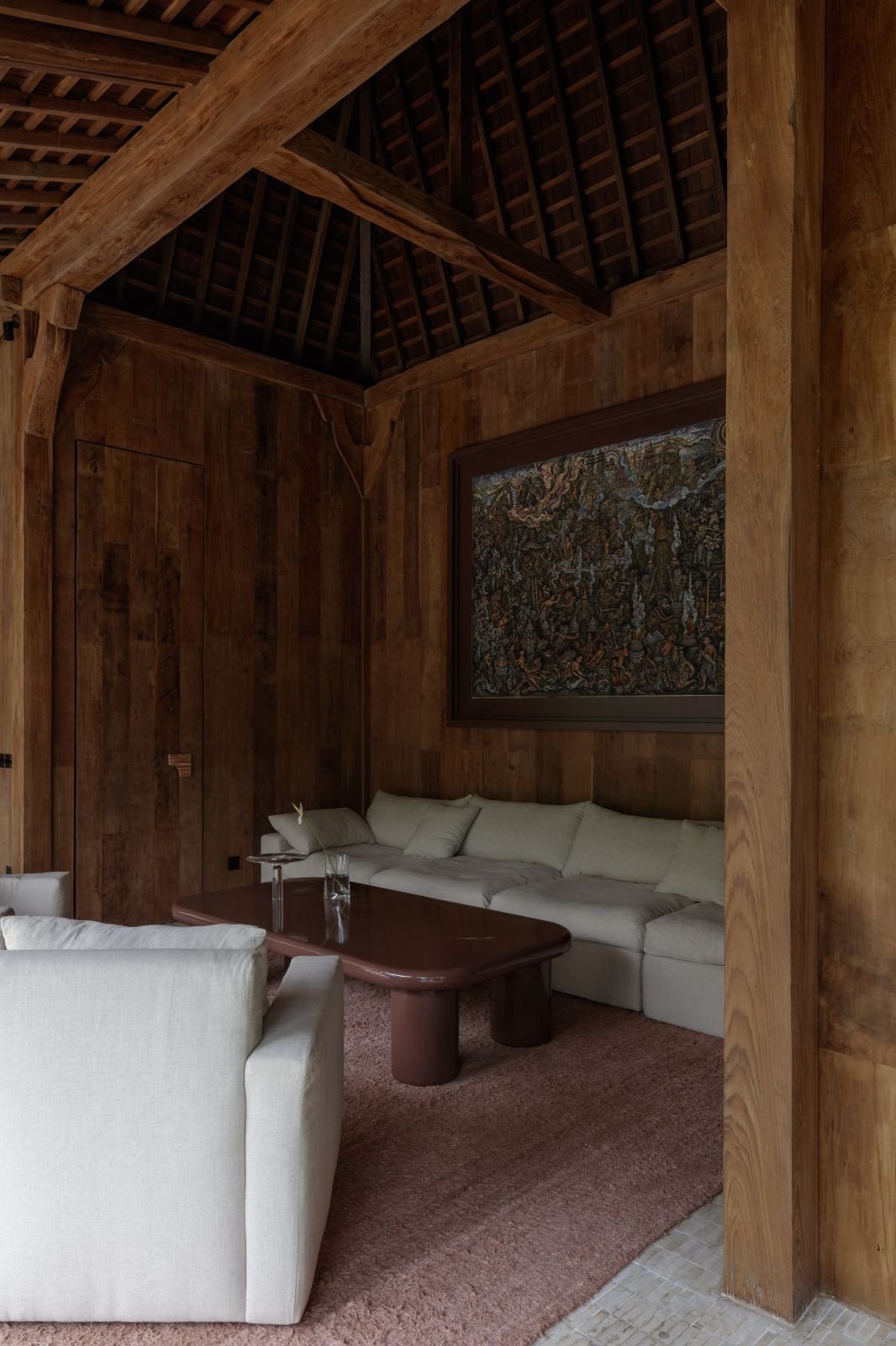 Joglo is a traditional Indonesian house that embodies the philosophy of openness and harmony with nature. Its architecture, with soaring ceilings and a distinctive roofline, symbolizes the unity of the spiritual and the material, while creating a sense of spaciousness and freedom. Inside, we combined rose travertine with the rich texture of aged wood, highlighting their natural beauty and contrast. The floor of local marble brings coolness and refinement, enhancing the sense of solidity and tranquility.