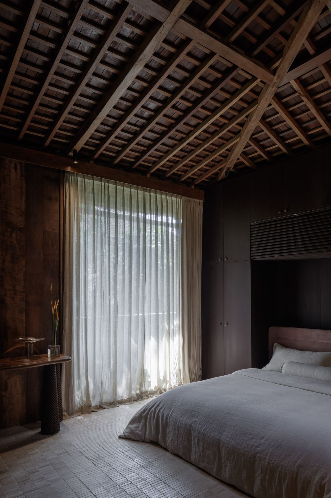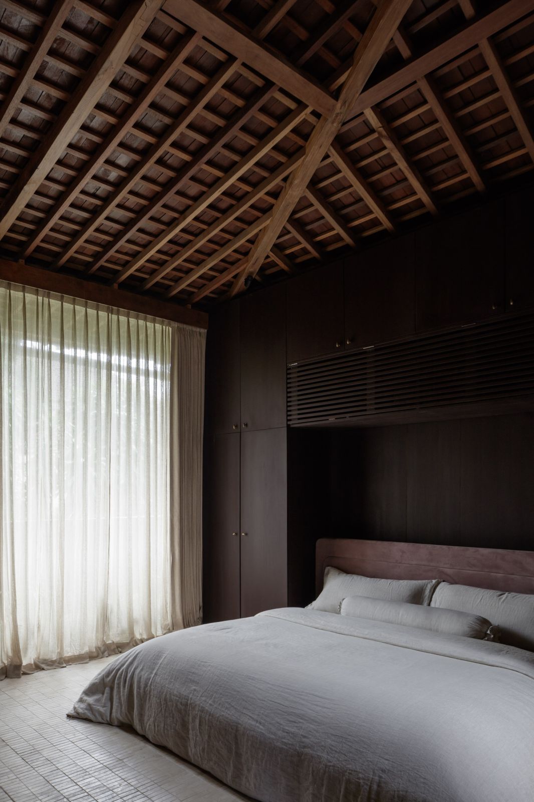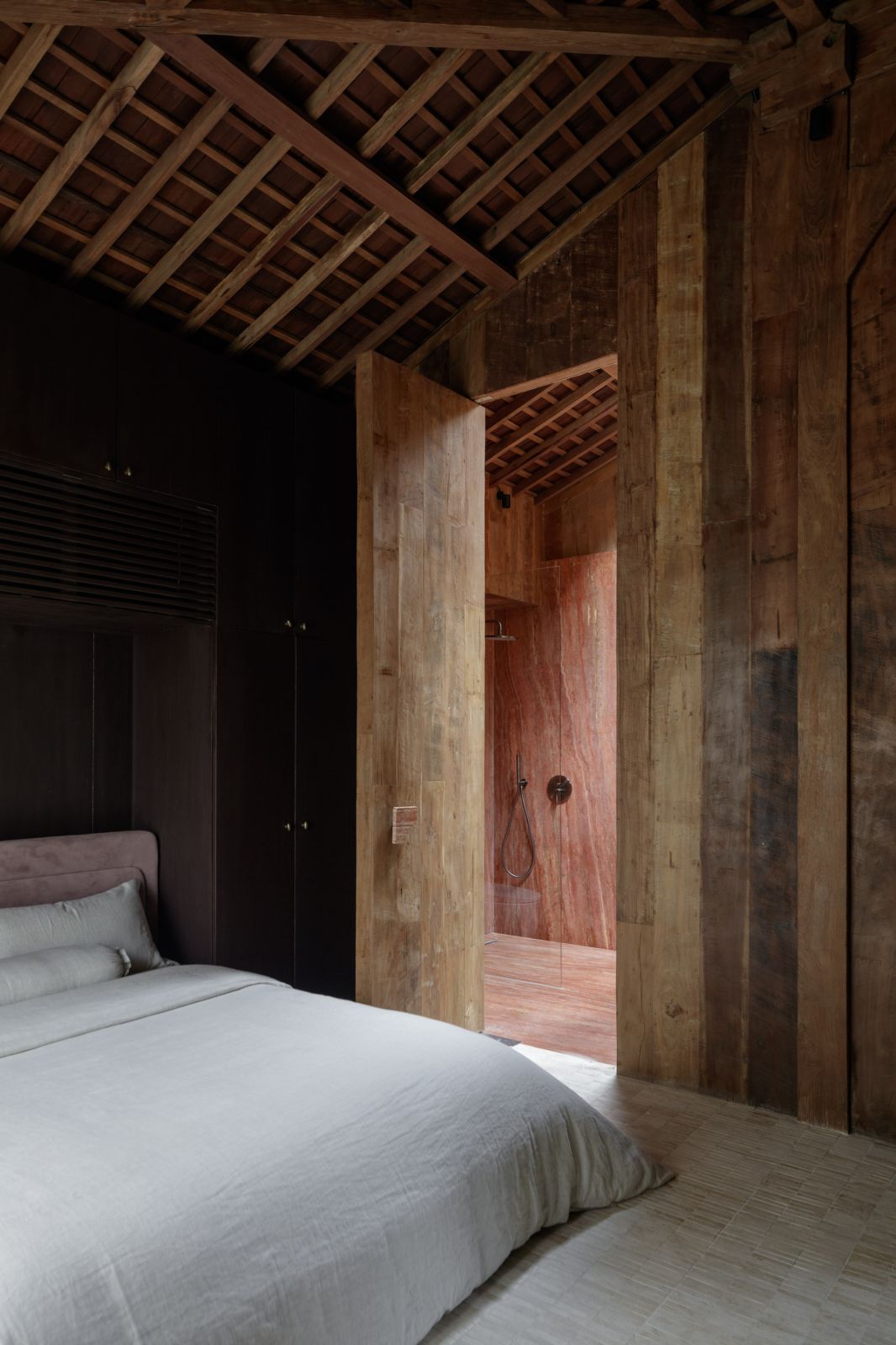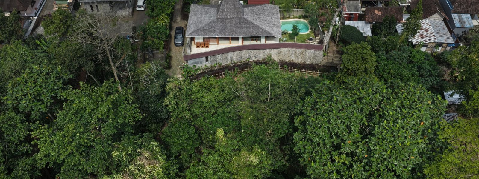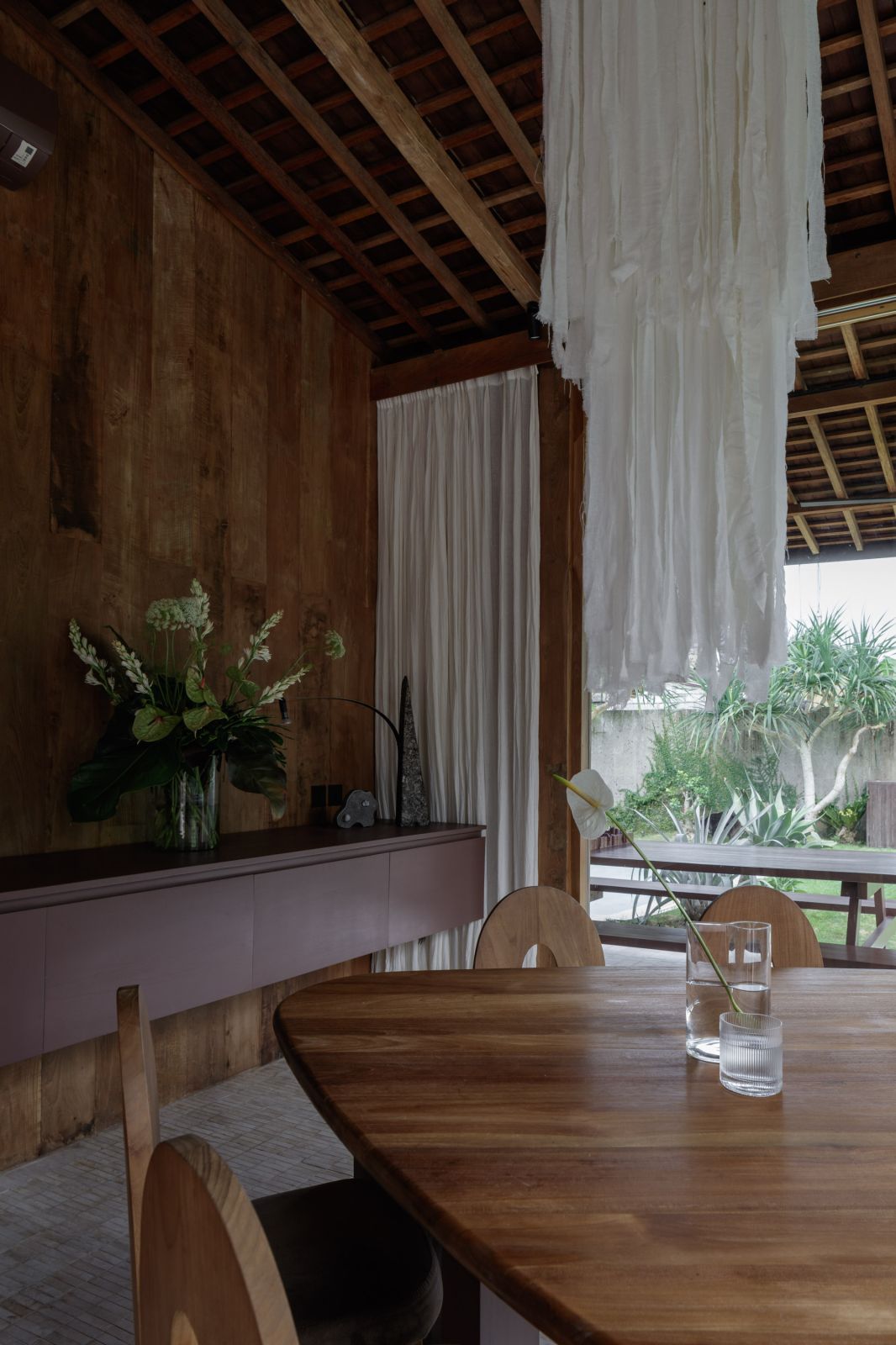 The house is built from recycled wood, carefully collected from several old joglo houses. These houses were dismantled in Java, and the wood was transported to Bali and assembled here. This choice of material is intentional: timber that has stood for decades is naturally protected from termites, exceptionally strong, and carries a noble, time-worn texture. It holds within it the history and energy of the past, giving the house depth and character.
