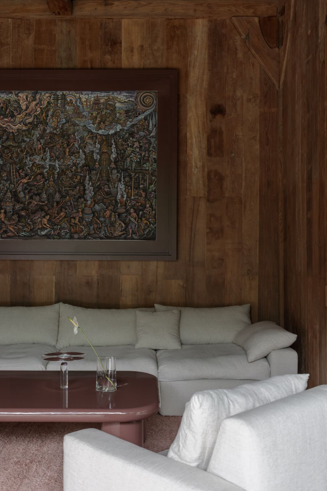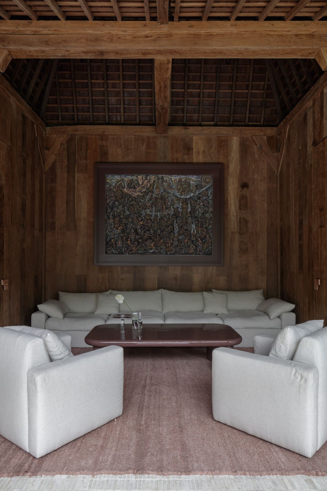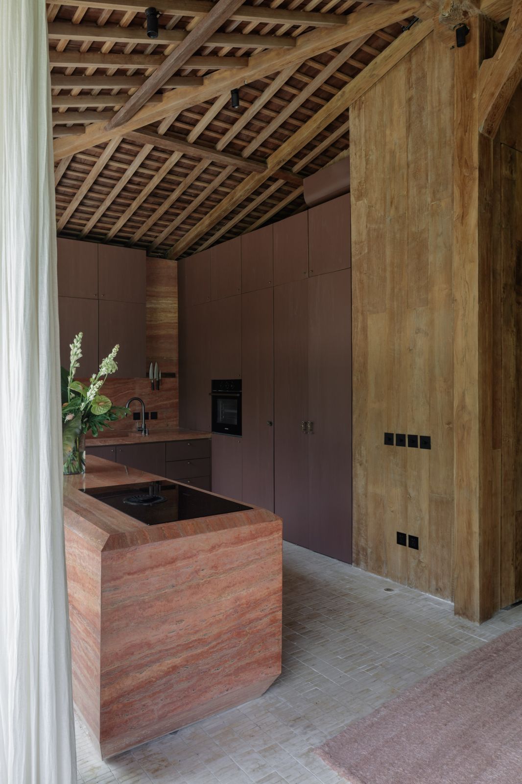 Joglo is a traditional Indonesian house that embodies the philosophy of openness and harmony with nature. Its architecture, with soaring ceilings and a distinctive roofline, symbolizes the unity of the spiritual and the material, while creating a sense of spaciousness and freedom. Inside, we combined rose travertine with the rich texture of aged wood, highlighting their natural beauty and contrast. The floor of local marble brings coolness and refinement, enhancing the sense of solidity and tranquility.