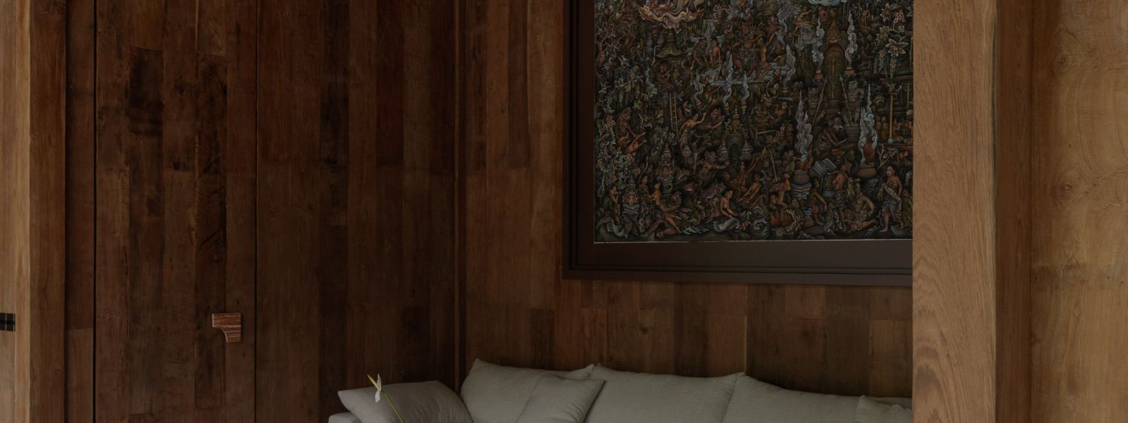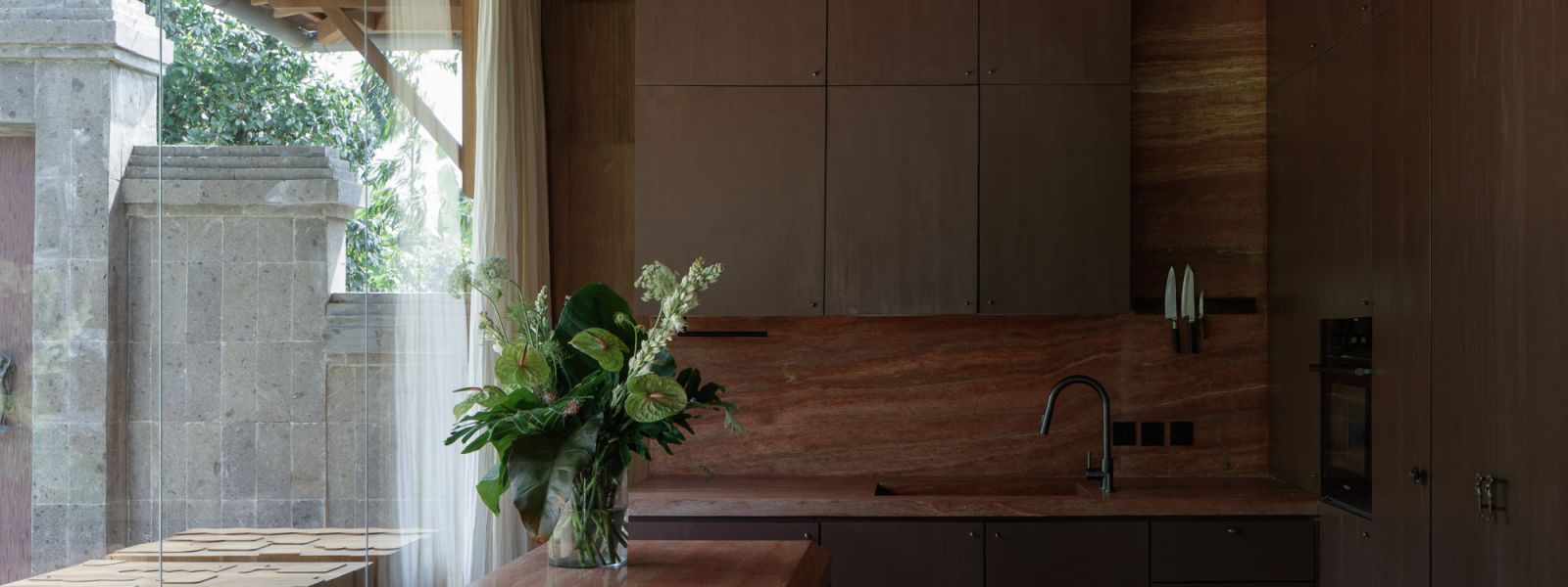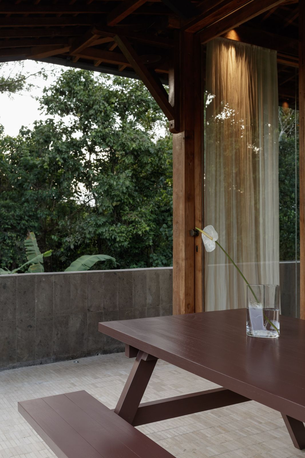 Joglo is a traditional Indonesian house that embodies the philosophy of openness and harmony with nature. Its architecture, with soaring ceilings and a distinctive roofline, symbolizes the unity of the spiritual and the material, while creating a sense of spaciousness and freedom. Inside, we combined rose travertine with the rich texture of aged wood, highlighting their natural beauty and contrast. The floor of local marble brings coolness and refinement, enhancing the sense of solidity and tranquility.