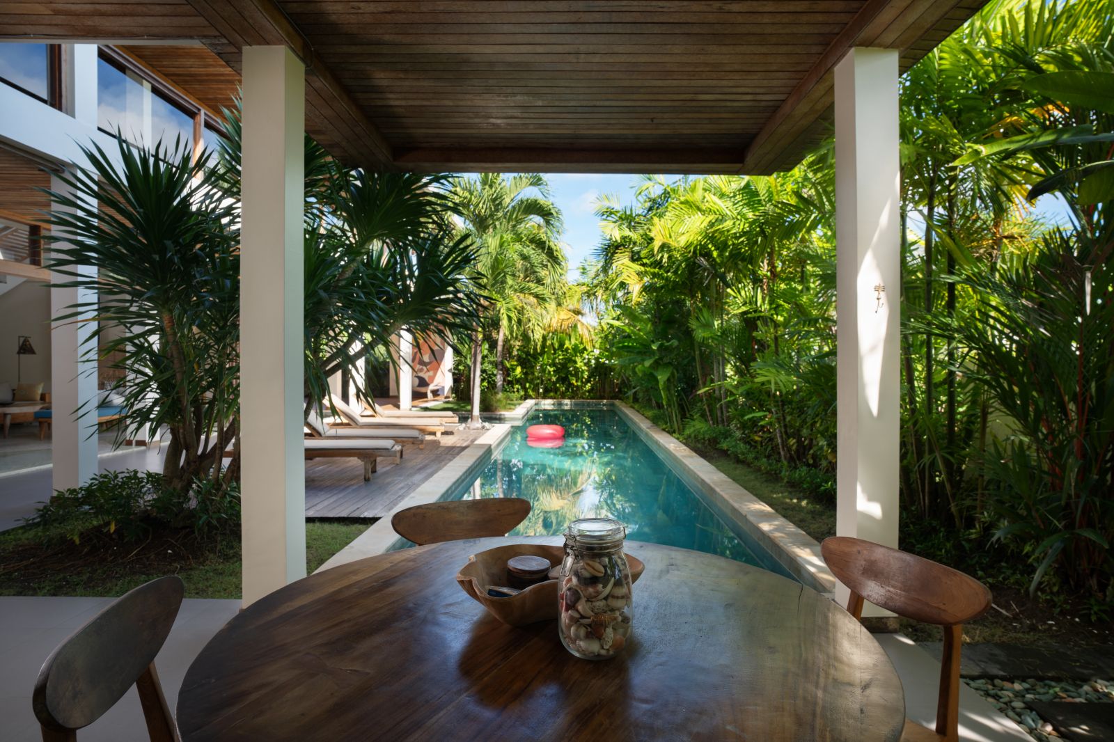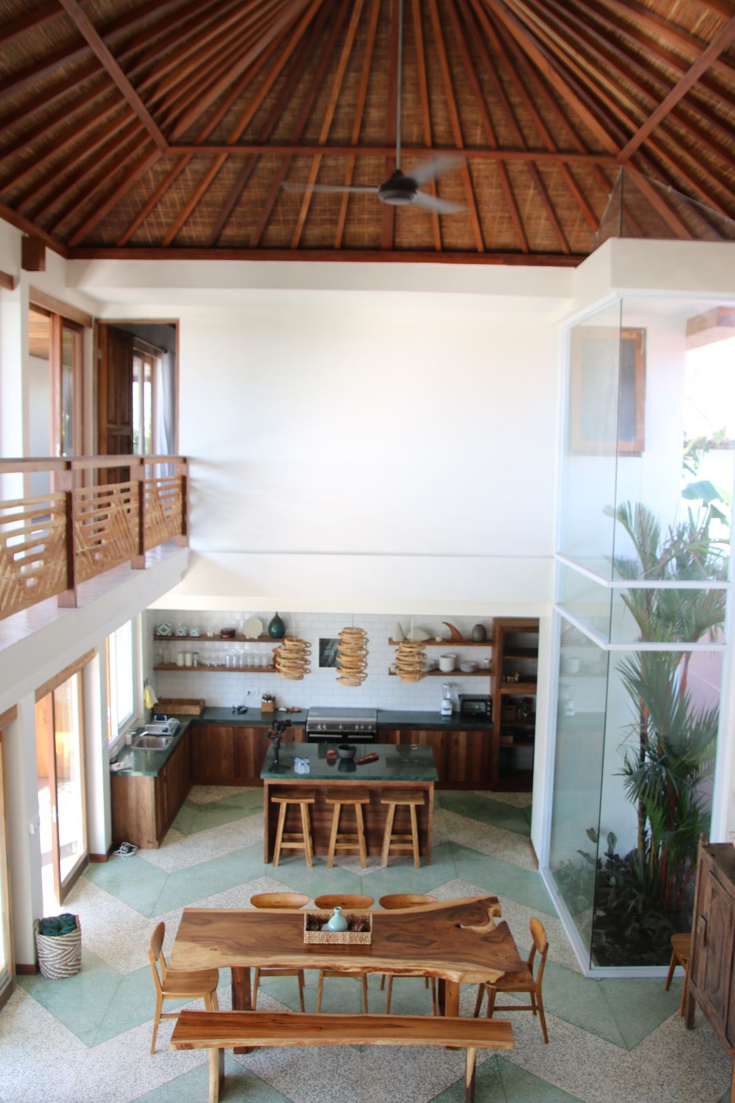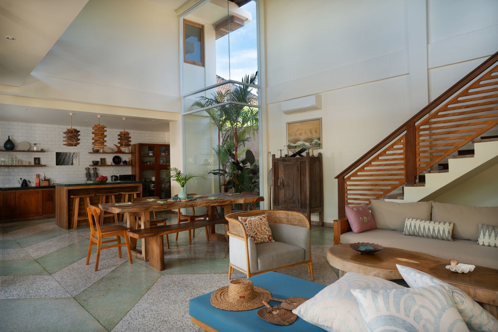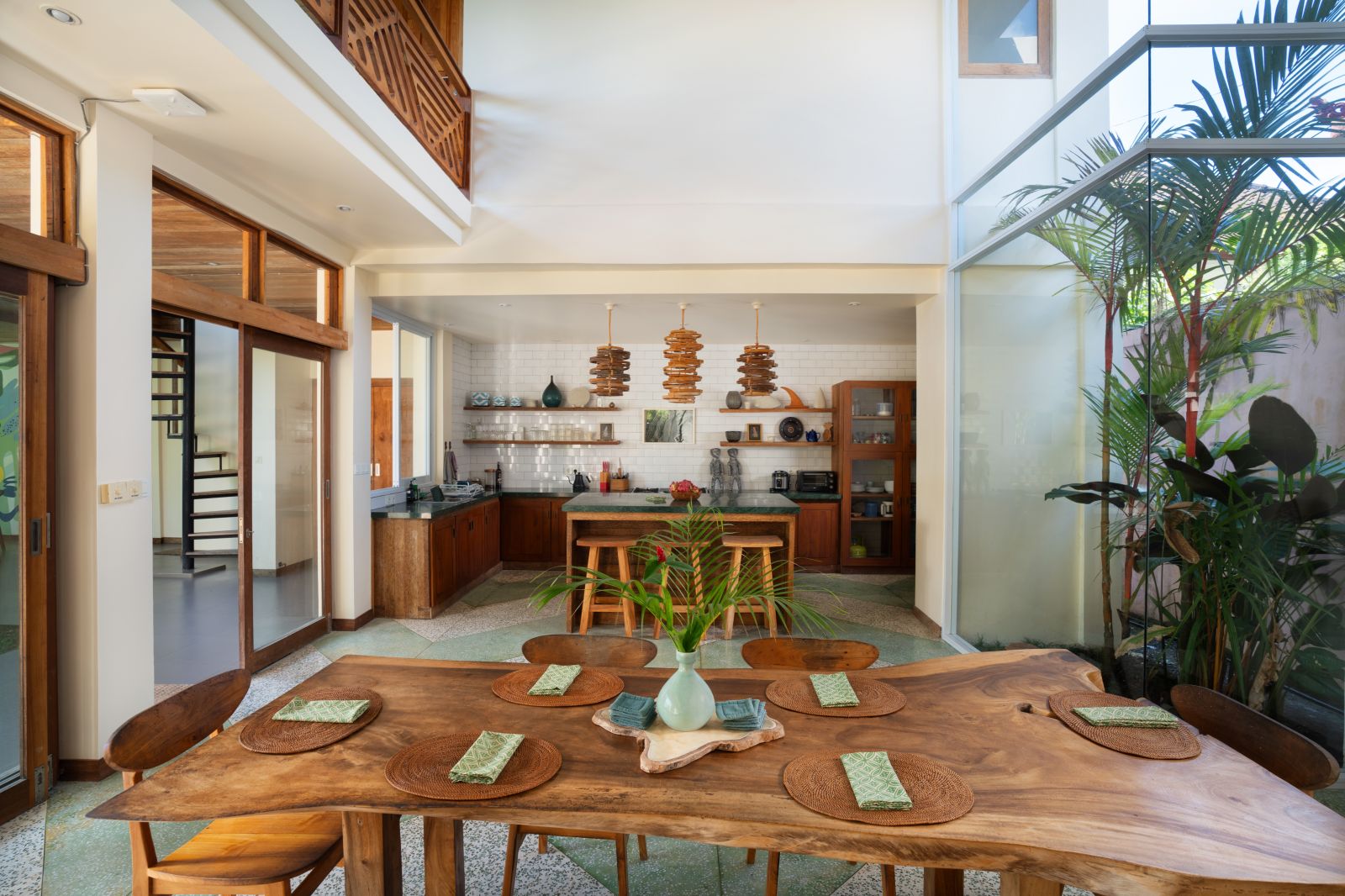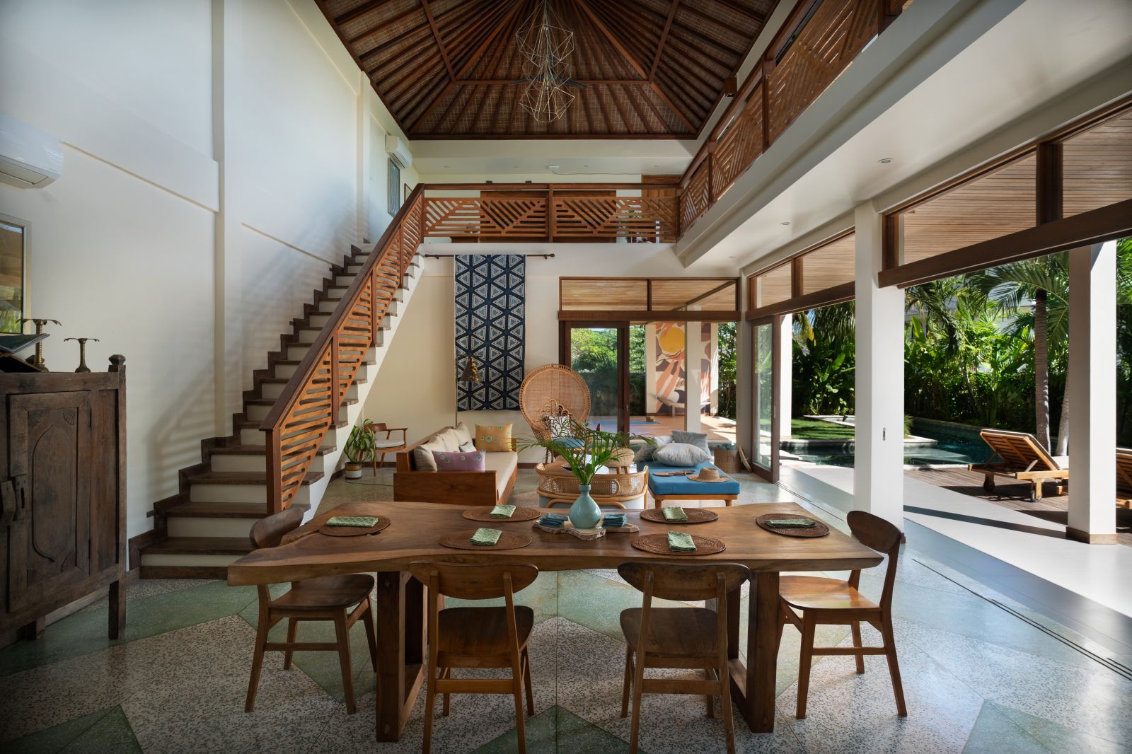 At its center lies a striking T-shaped swimming pool anchored by a 19-meter lap lane, separating the main living pavilion from a dedicated yoga shala. The open-plan living, dining, and kitchen area is defined by custom terrazzo floors, vaulted rattan ceilings, emerald marble countertops, and expansive glass that dissolves the boundary between indoors and out. A lofted workspace and TV area overlooks the great room, offering flexibility for work, rest, or extended stays.