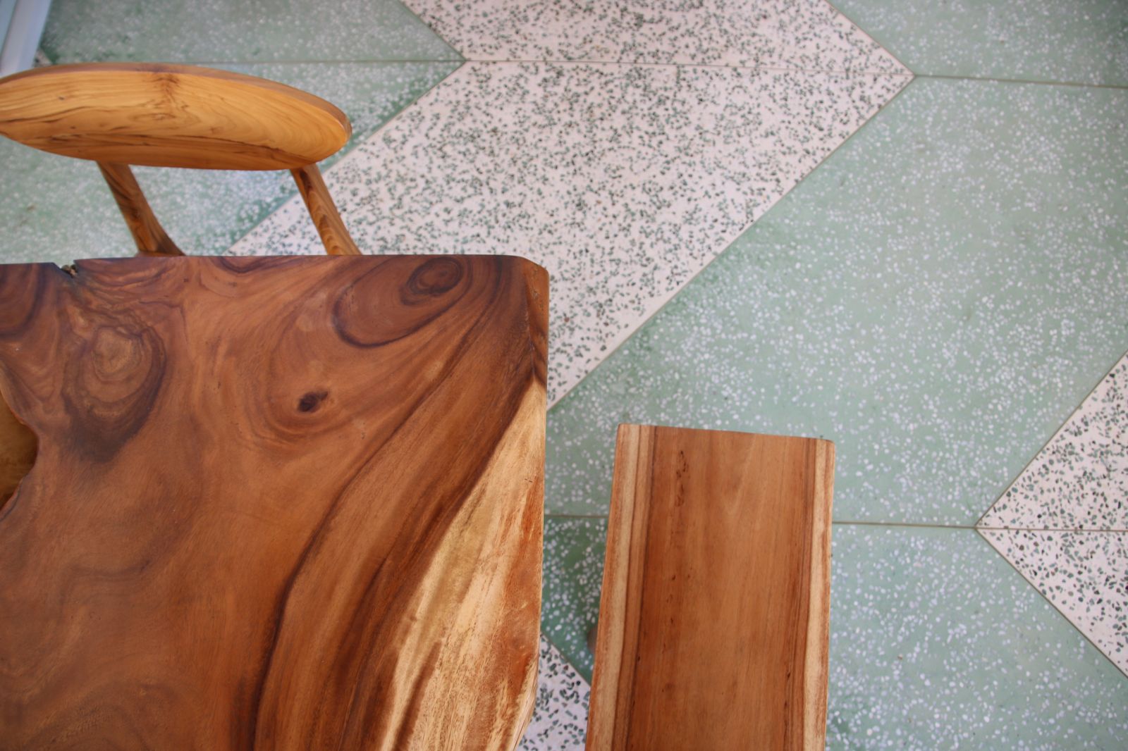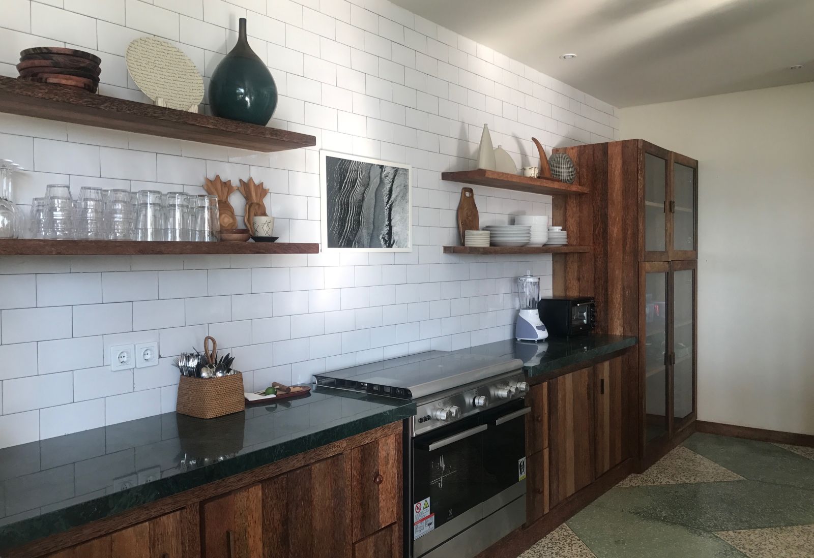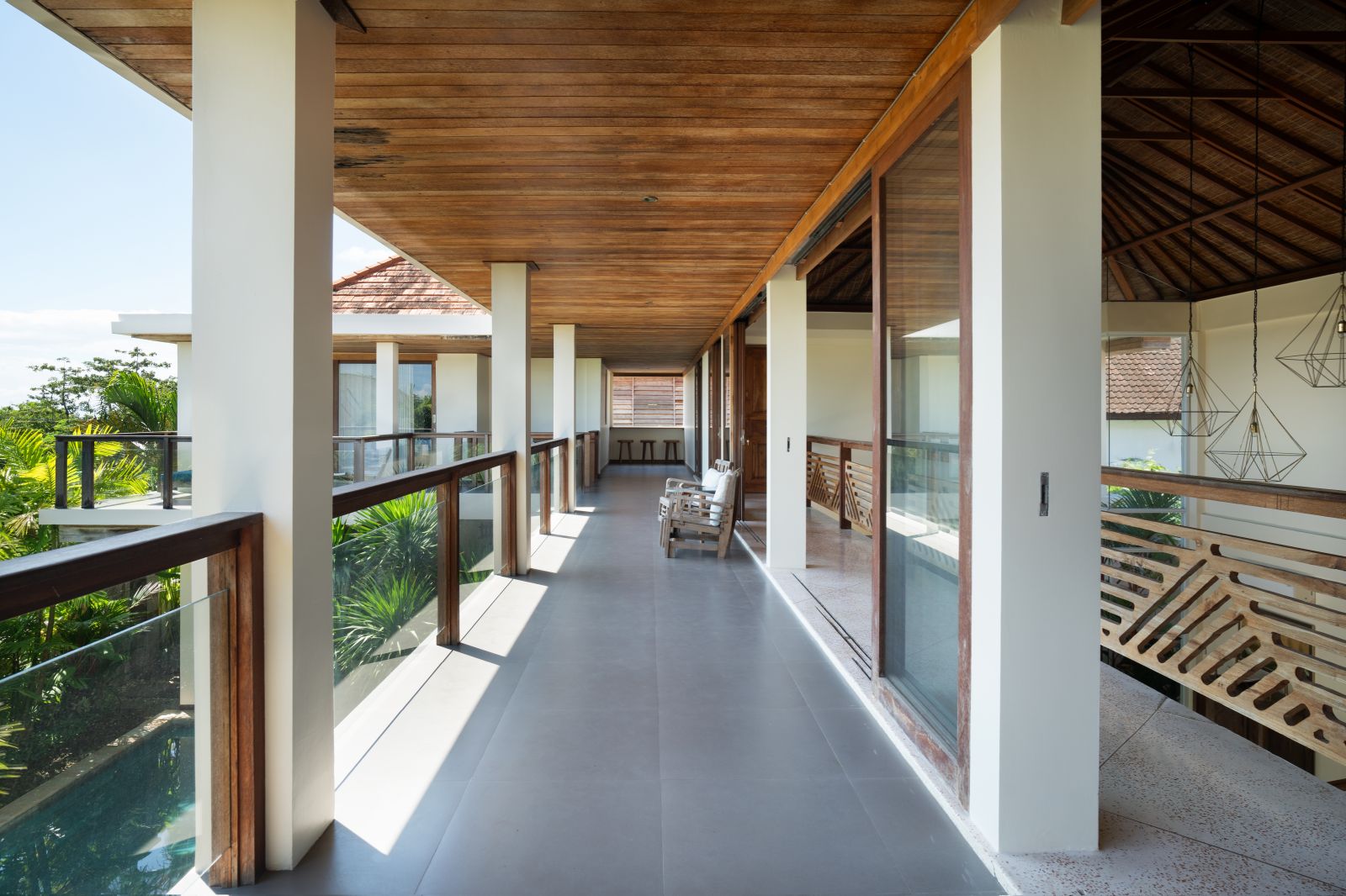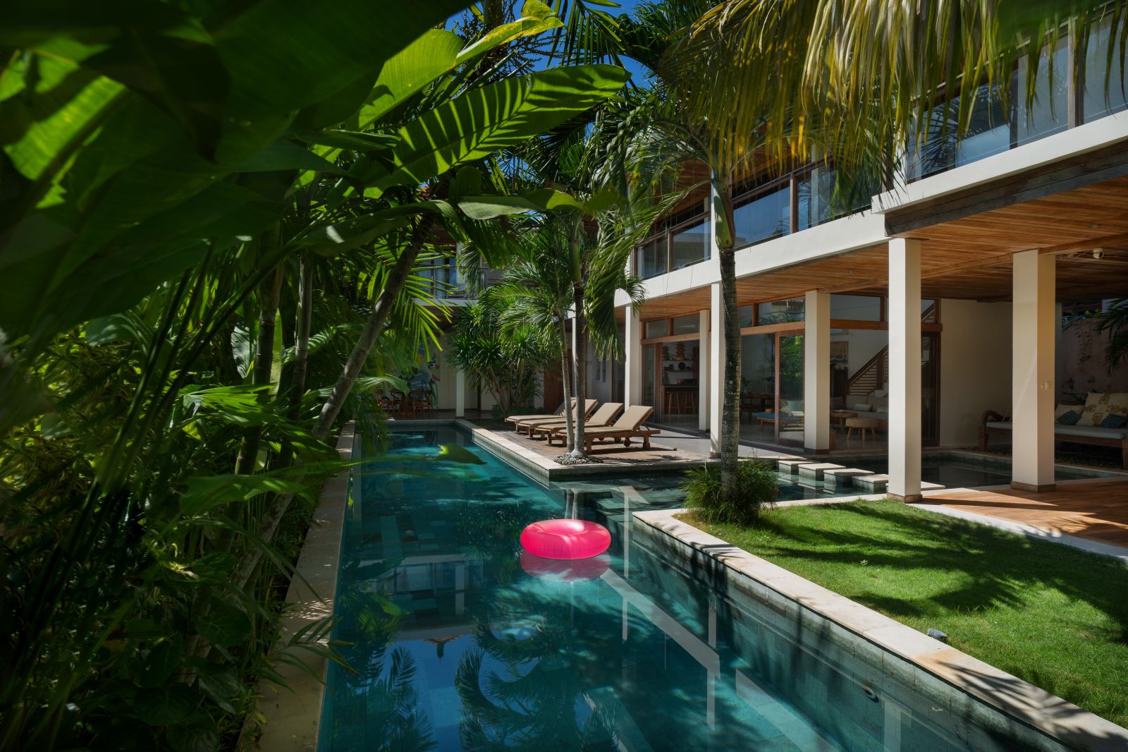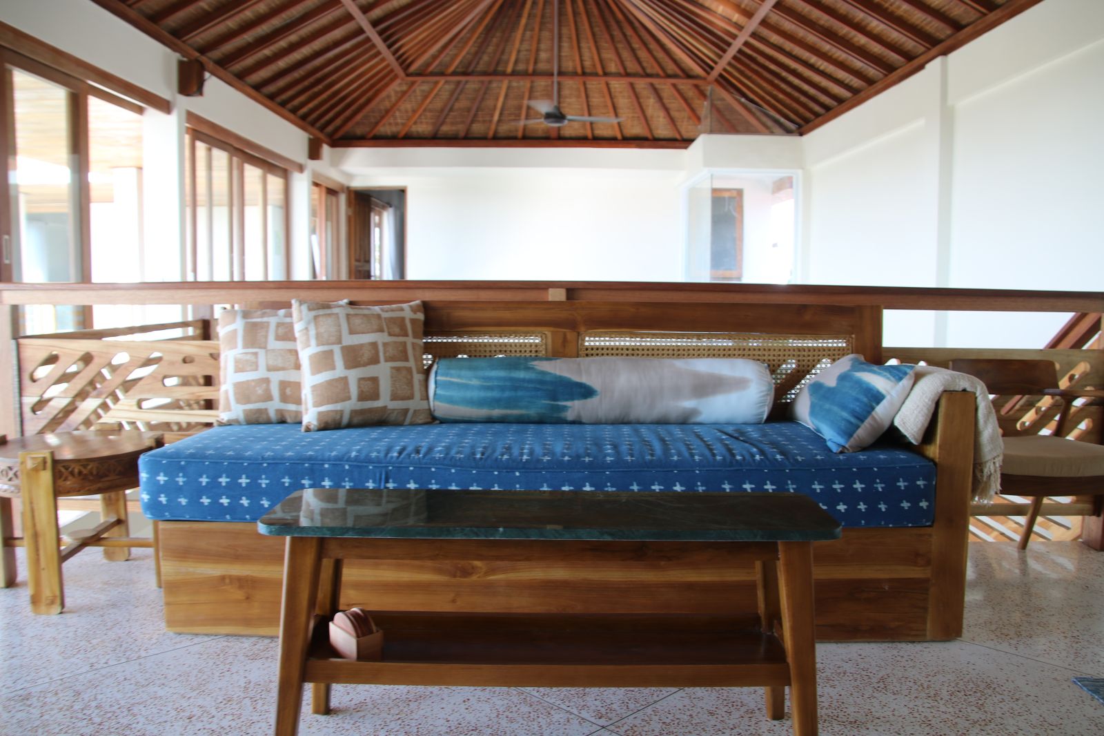 At its center lies a striking T-shaped swimming pool anchored by a 19-meter lap lane, separating the main living pavilion from a dedicated yoga shala. The open-plan living, dining, and kitchen area is defined by custom terrazzo floors, vaulted rattan ceilings, emerald marble countertops, and expansive glass that dissolves the boundary between indoors and out. A lofted workspace and TV area overlooks the great room, offering flexibility for work, rest, or extended stays.