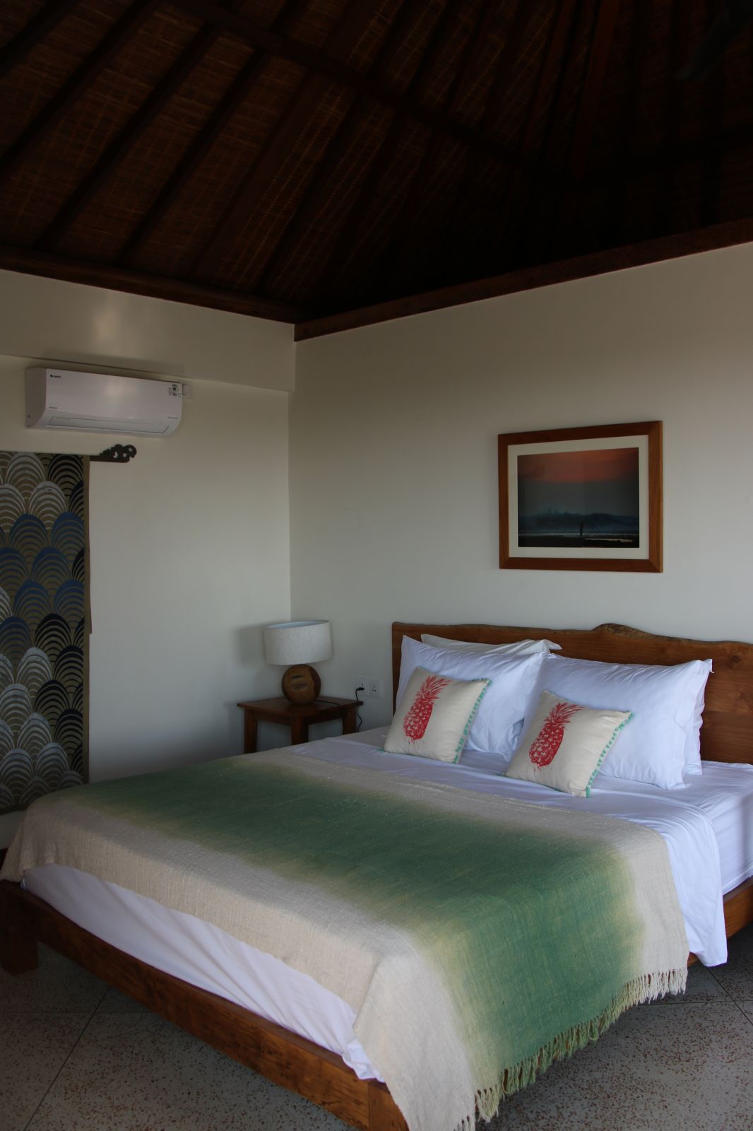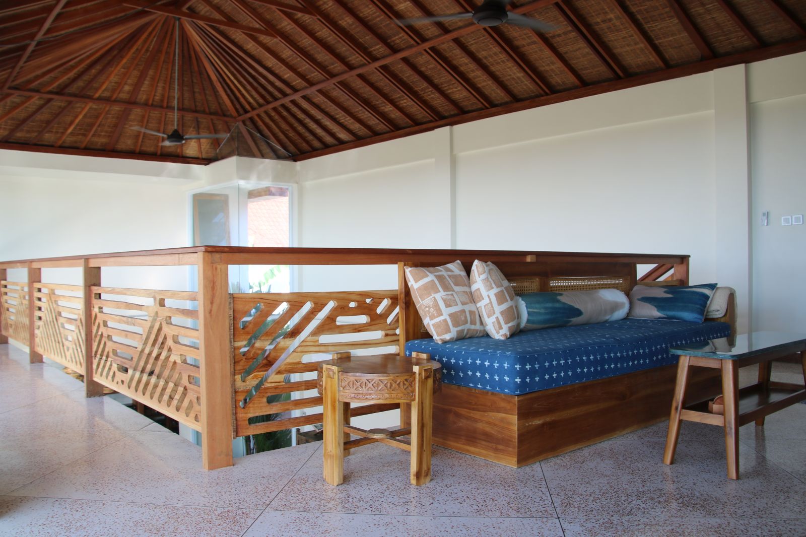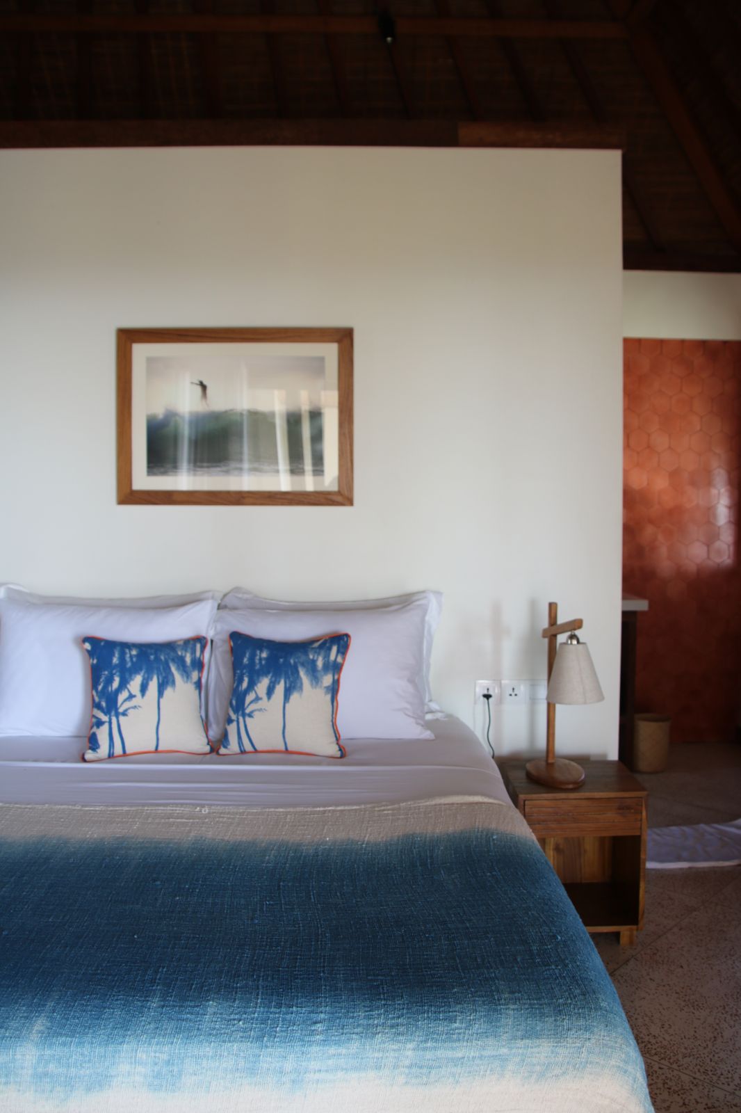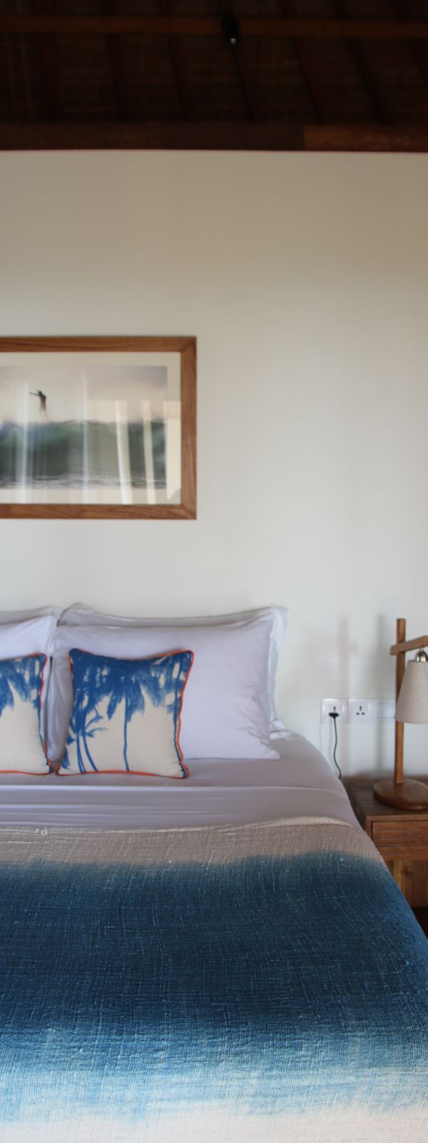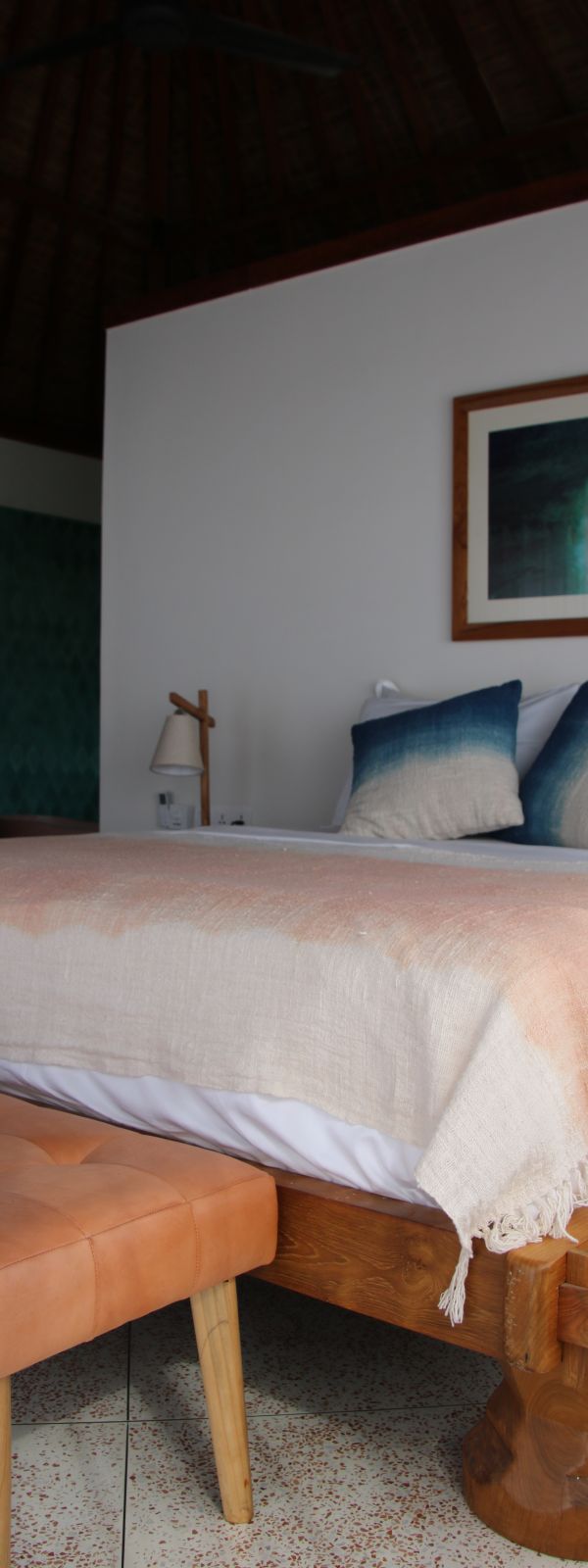 Throughout the home, thoughtful craftsmanship takes precedence over perfection. Bespoke concrete tiles, locally made ceramics, and painted mural walls add warmth and personality, while modern comforts are discreetly integrated. A lower-level powder room with an outdoor natural stone rainfall shower provides a practical touch after beach days or swims. Designed to be lived in and lingered over, this is a design-forward retreat for those seeking space, privacy, and soulful architecture in Bali.