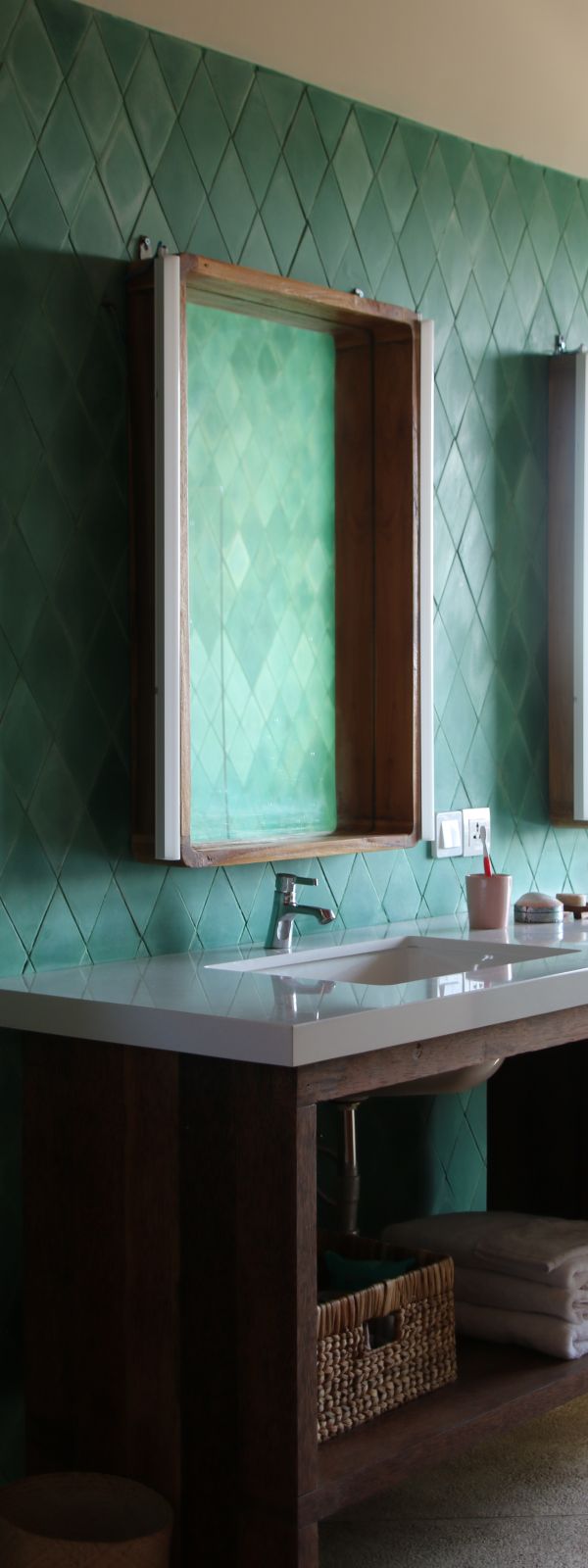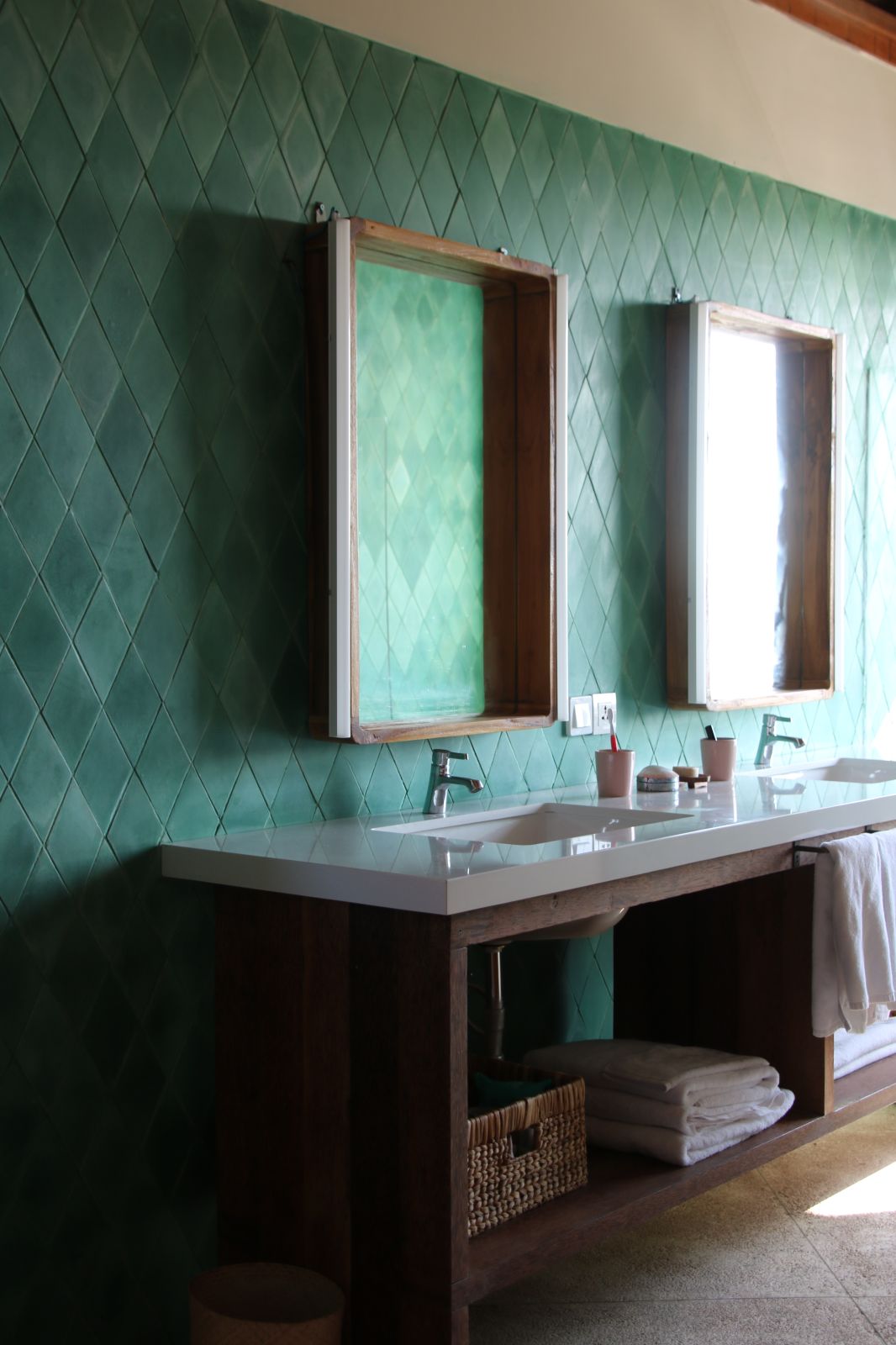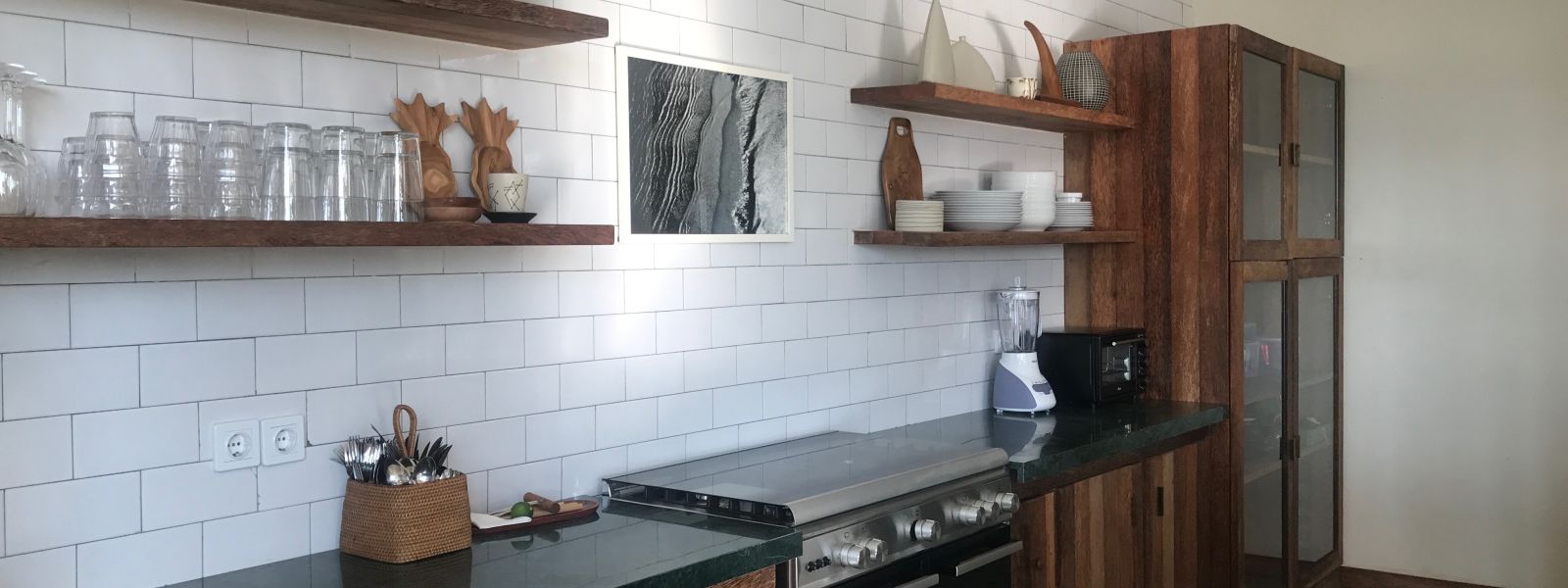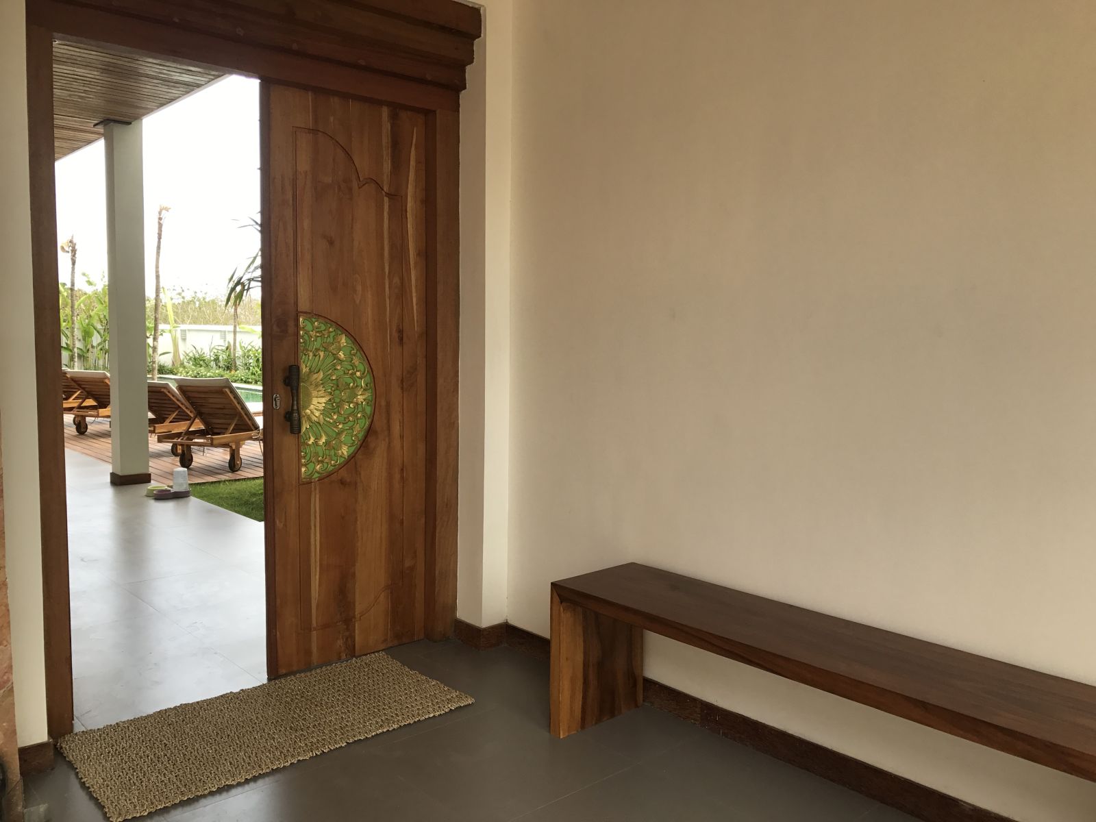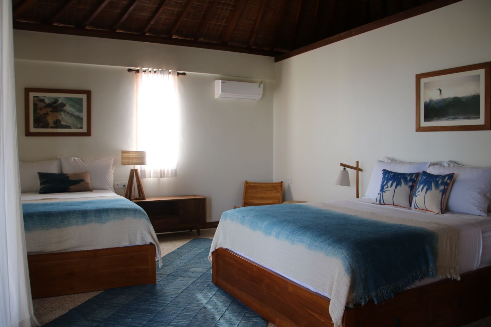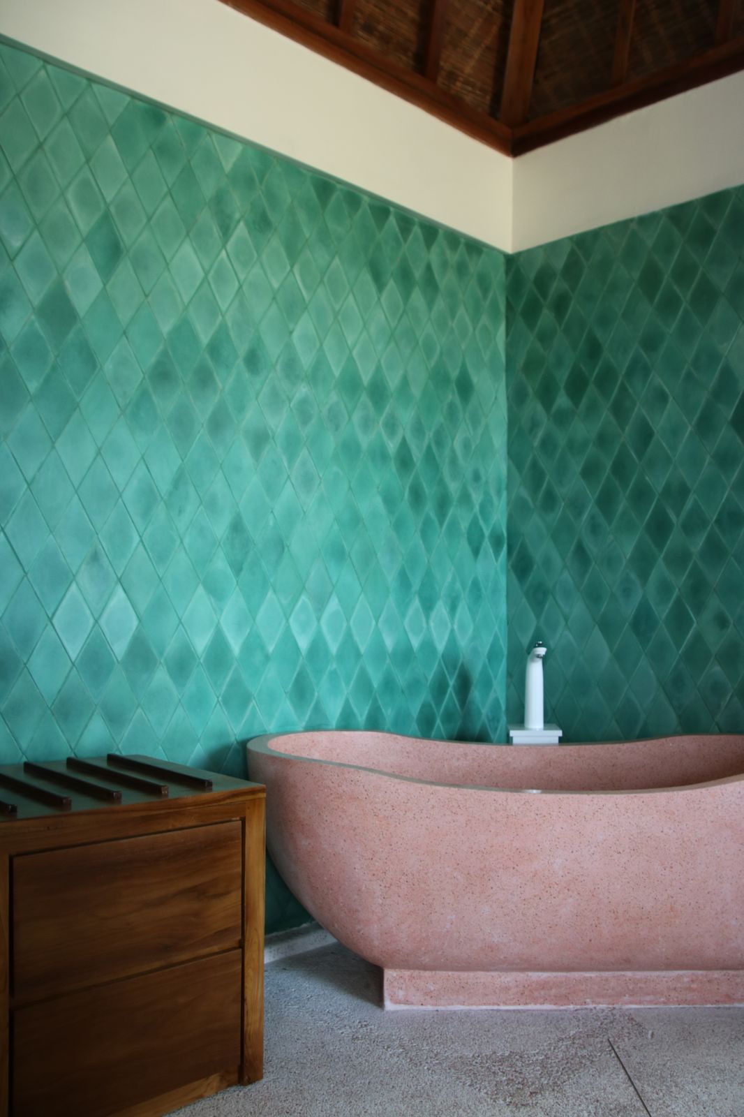 Throughout the home, thoughtful craftsmanship takes precedence over perfection. Bespoke concrete tiles, locally made ceramics, and painted mural walls add warmth and personality, while modern comforts are discreetly integrated. A lower-level powder room with an outdoor natural stone rainfall shower provides a practical touch after beach days or swims. Designed to be lived in and lingered over, this is a design-forward retreat for those seeking space, privacy, and soulful architecture in Bali.