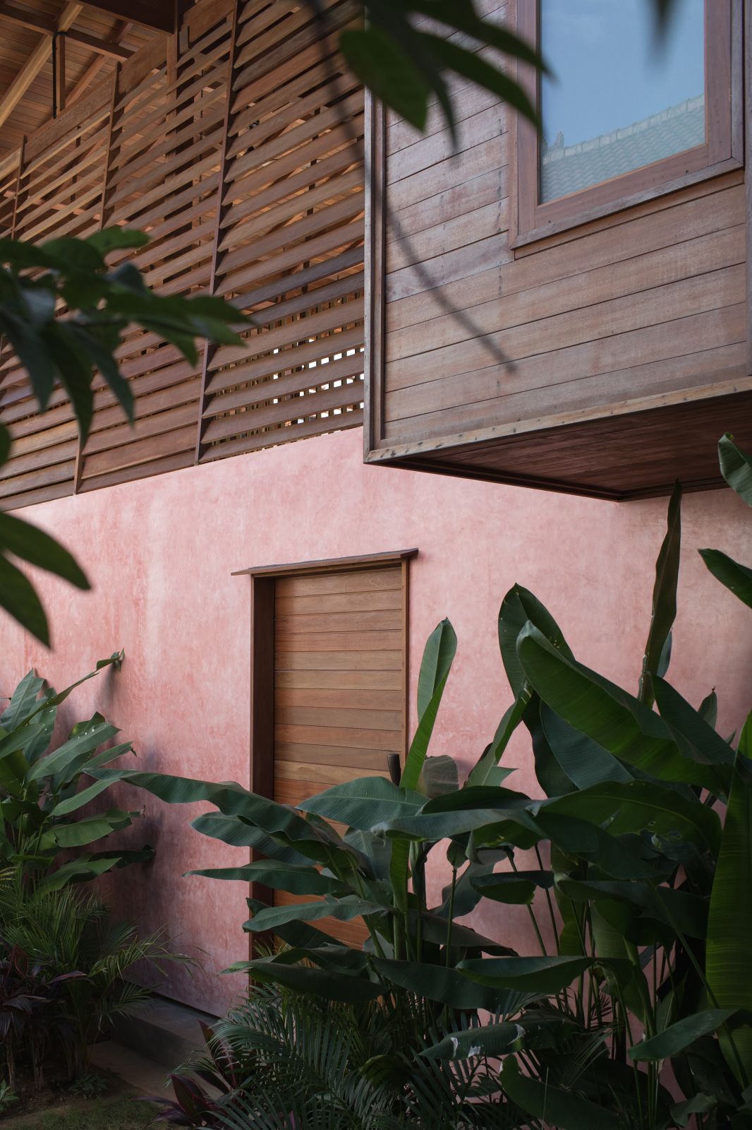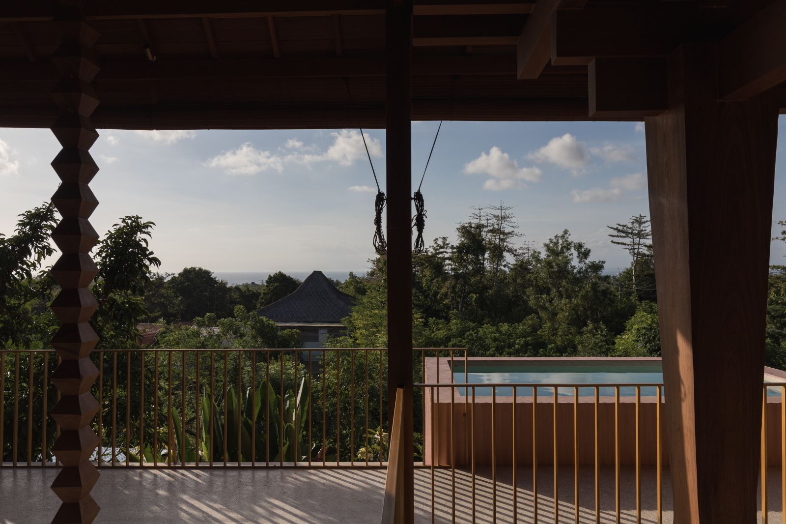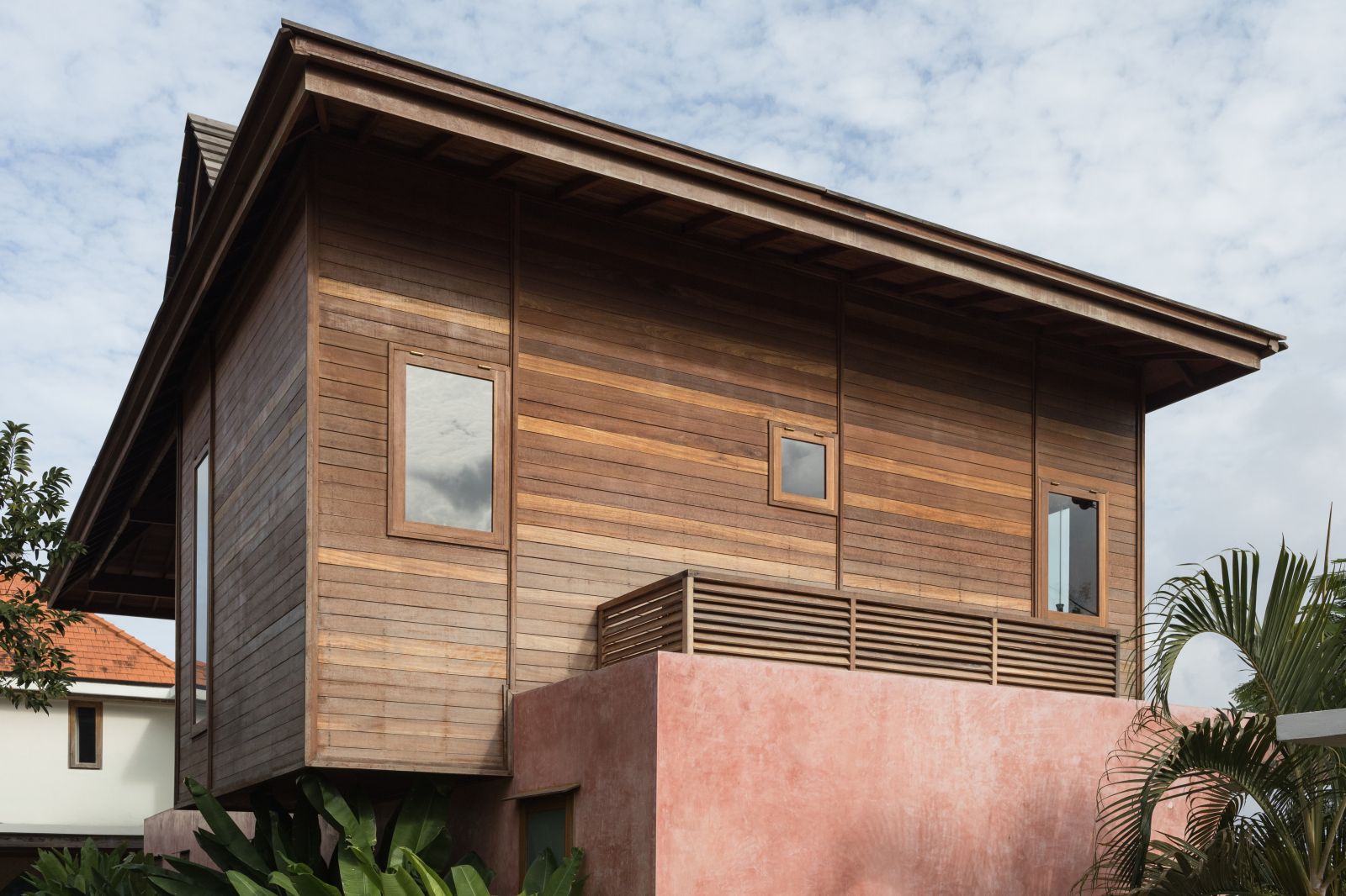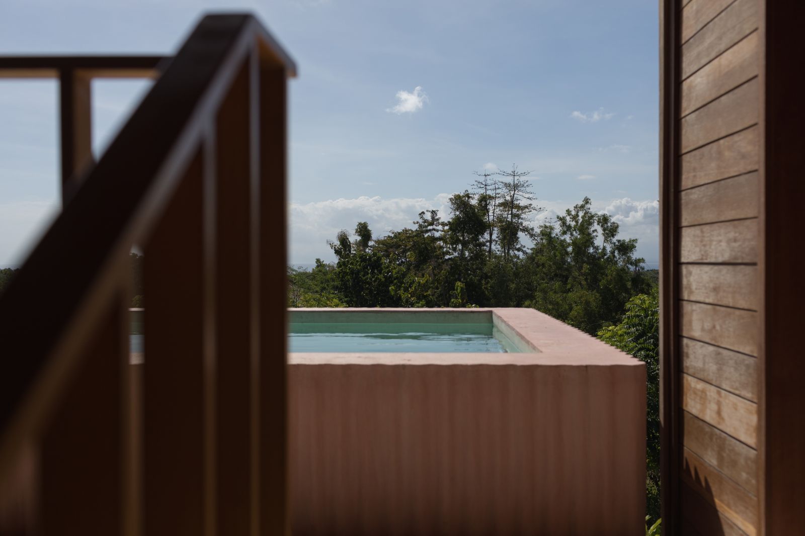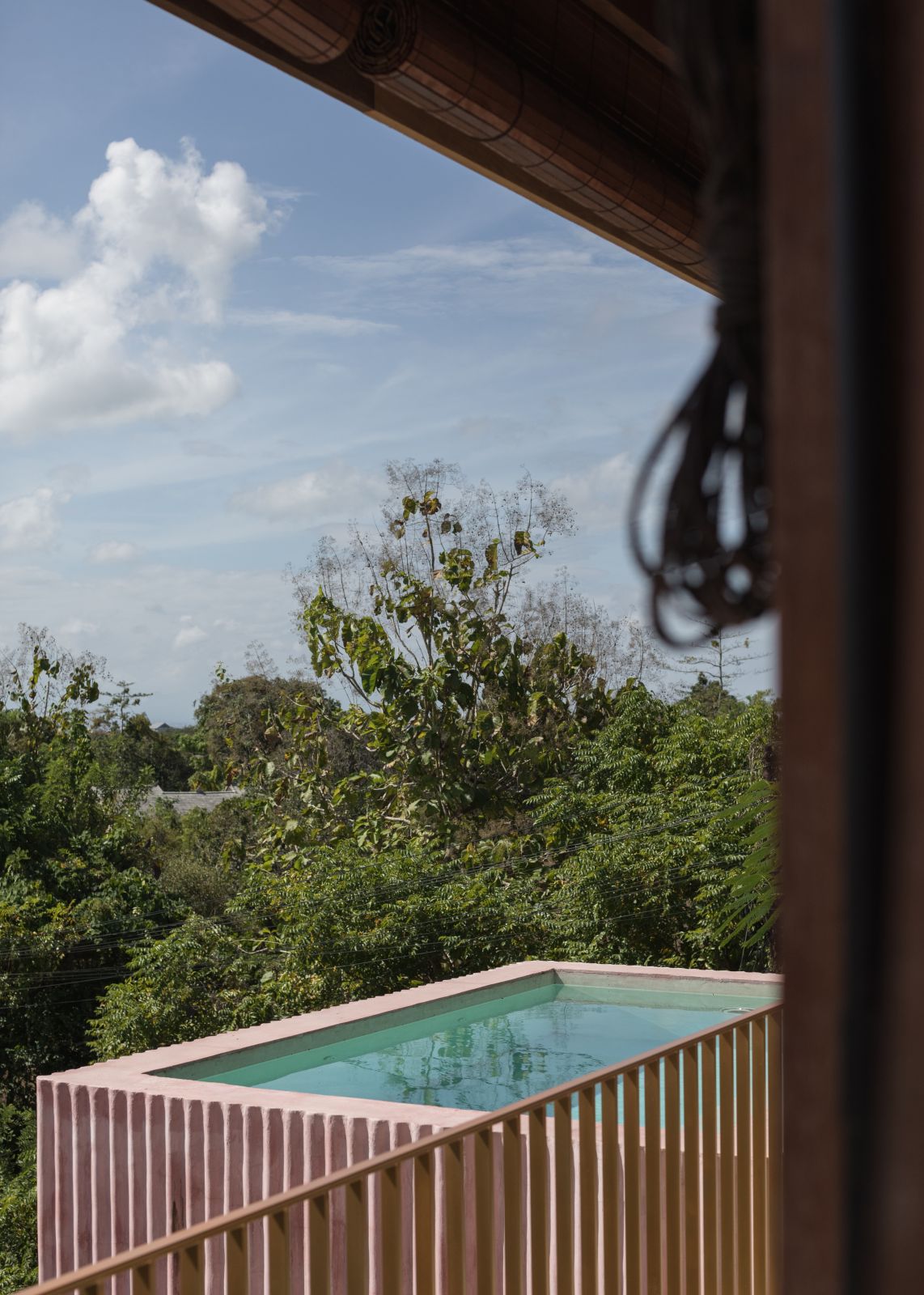 A timbered jewel box atop a pink plinth, crowned with a treetop plunge pool looking out to the ocean. Just minutes from the crashing waves of Pecatu, this two-bedroom home offers a refined take on open-air tropical living. Designed by a Los Angeles–based studio, the home rises above lush landscaping to capture ocean breezes, treetop views, and vivid sunsets, creating a sense of calm, privacy, and understated drama.