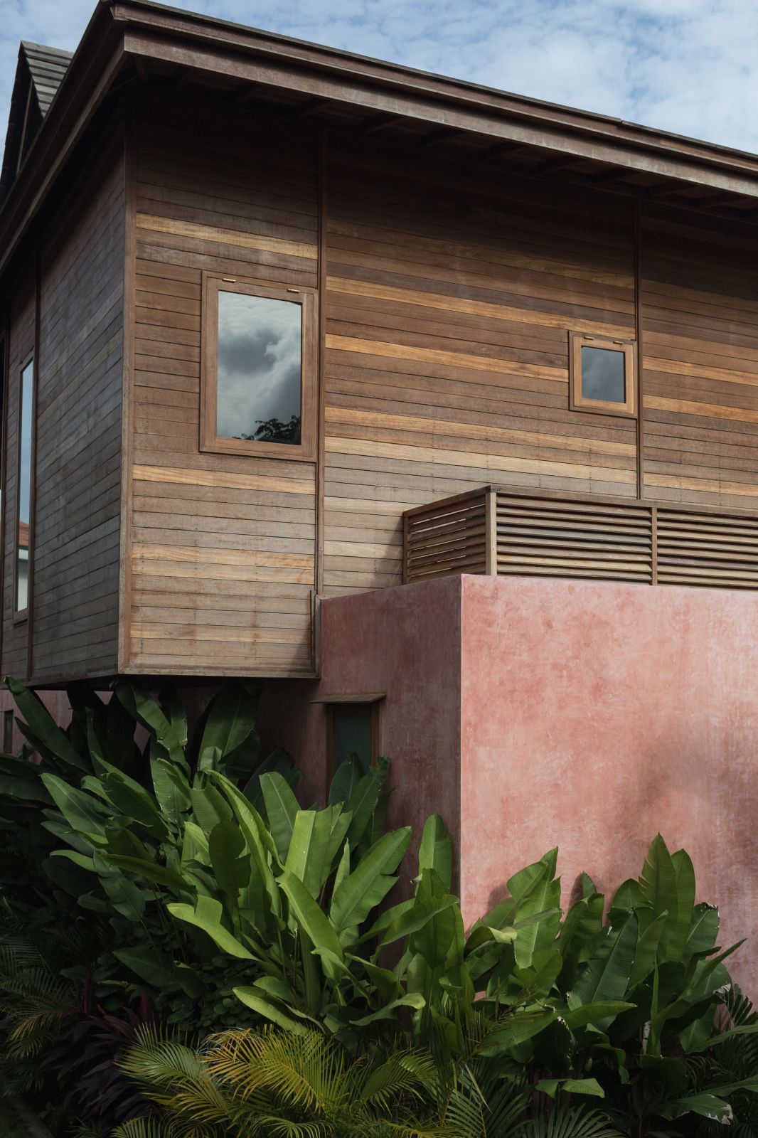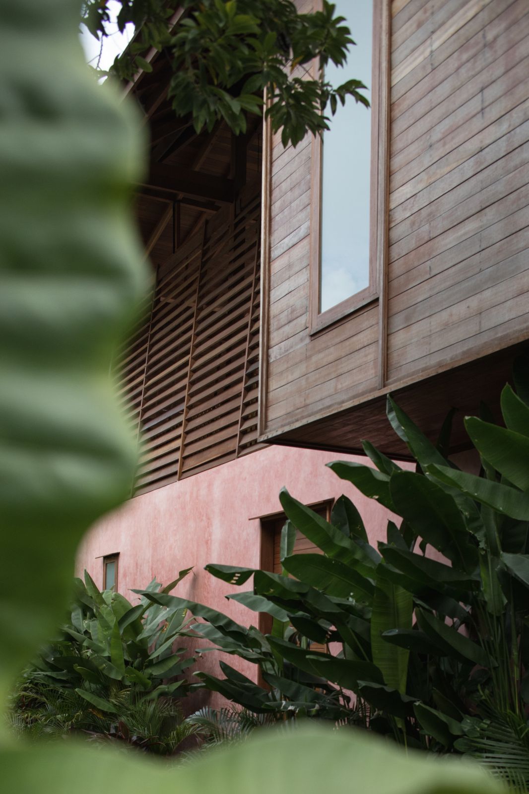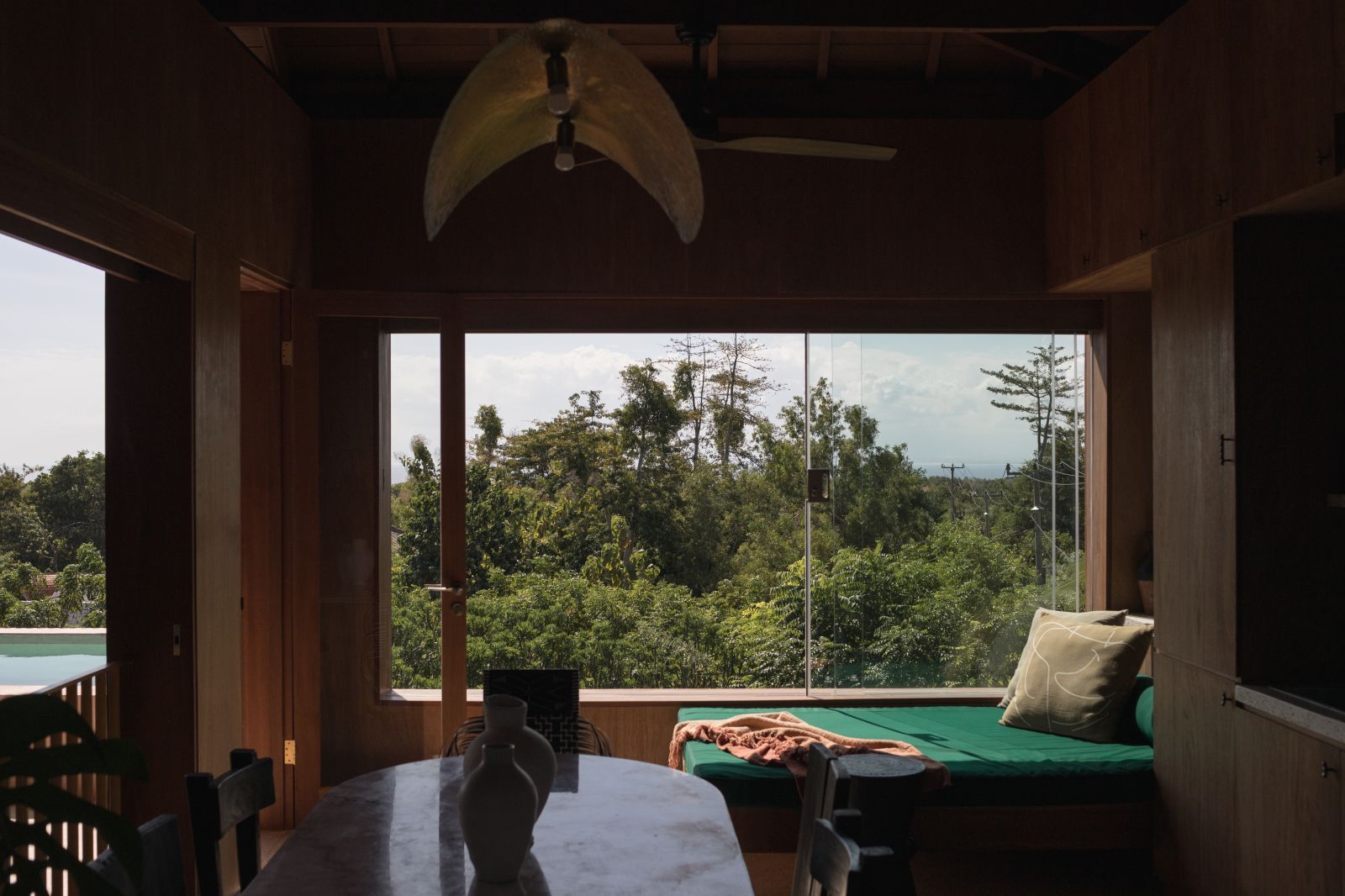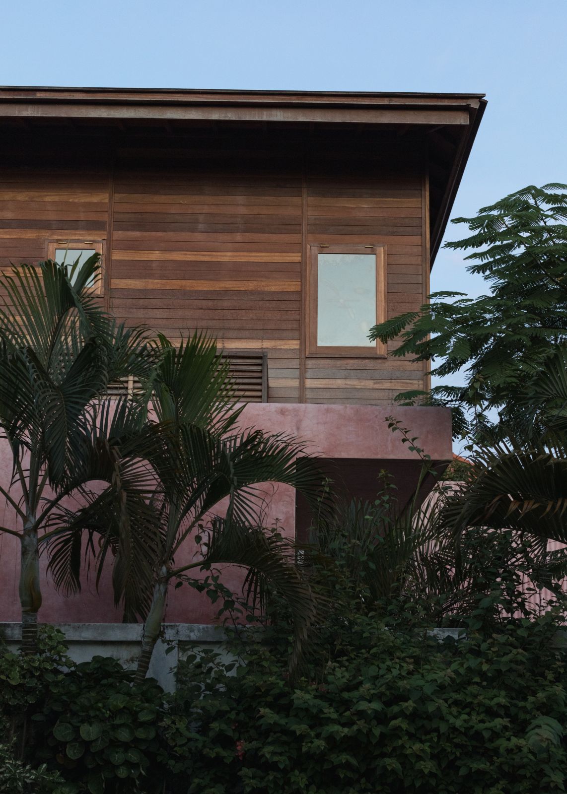 A timbered jewel box atop a pink plinth, crowned with a treetop plunge pool looking out to the ocean. Just minutes from the crashing waves of Pecatu, this two-bedroom home offers a refined take on open-air tropical living. Designed by a Los Angeles–based studio, the home rises above lush landscaping to capture ocean breezes, treetop views, and vivid sunsets, creating a sense of calm, privacy, and understated drama.