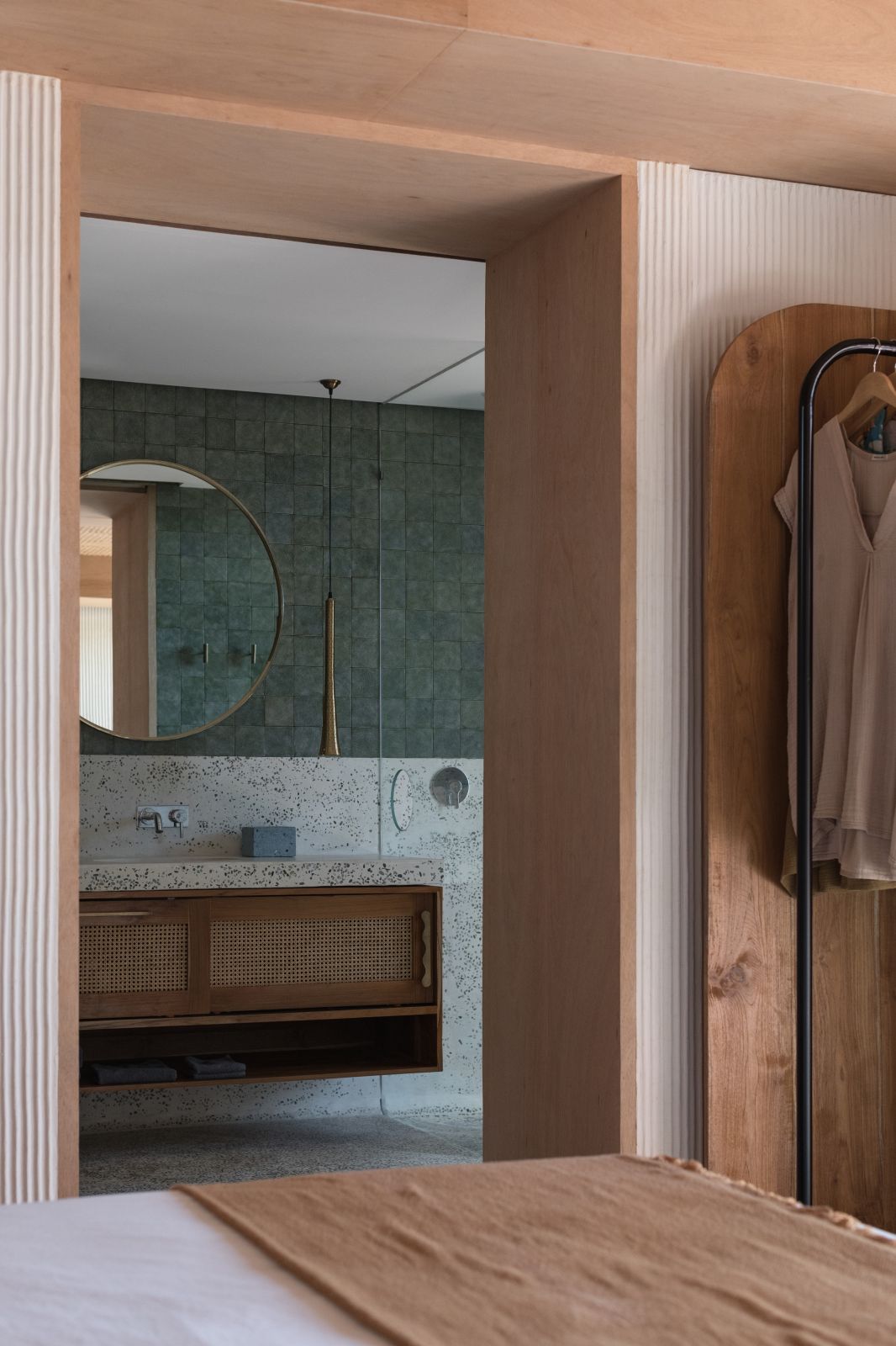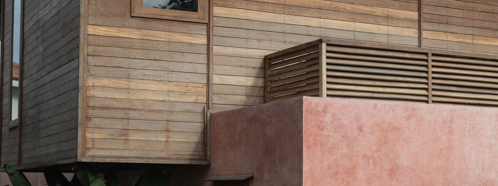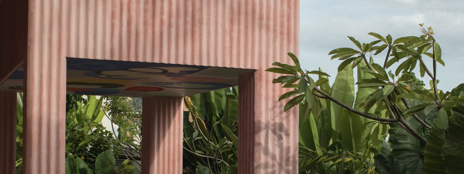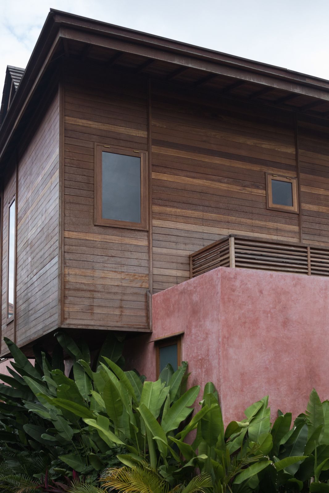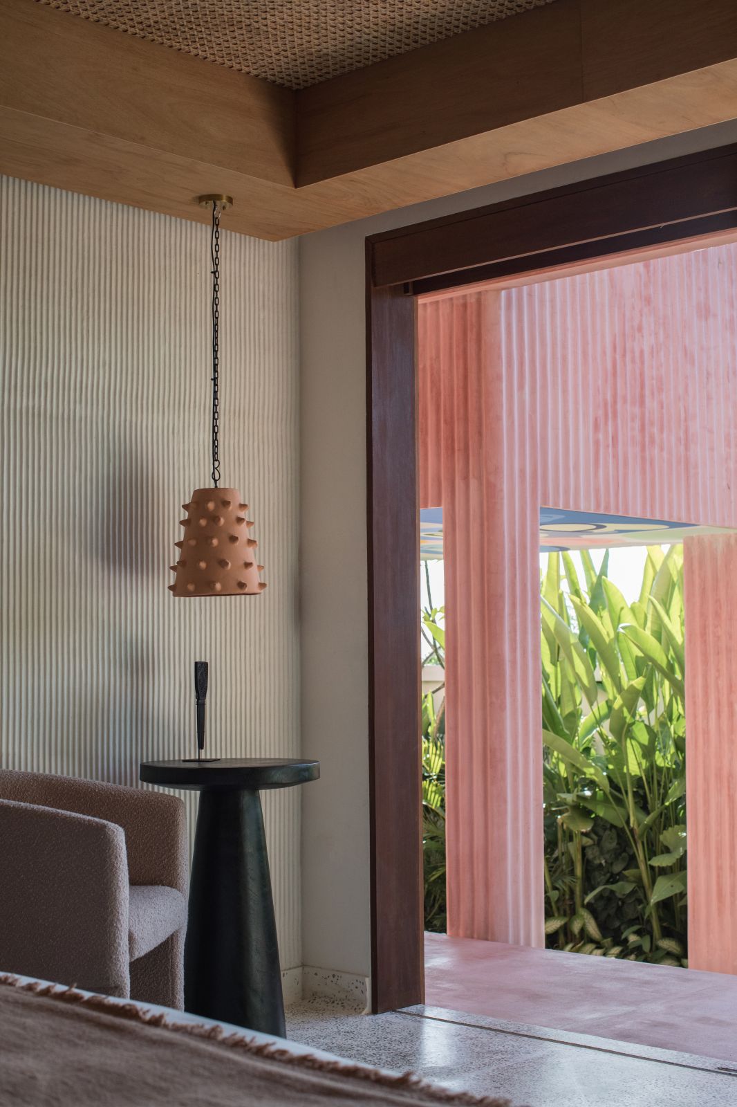 A timbered jewel box atop a pink plinth, crowned with a treetop plunge pool looking out to the ocean. Just minutes from the crashing waves of Pecatu, this two-bedroom home offers a refined take on open-air tropical living. Designed by a Los Angeles–based studio, the home rises above lush landscaping to capture ocean breezes, treetop views, and vivid sunsets, creating a sense of calm, privacy, and understated drama.
