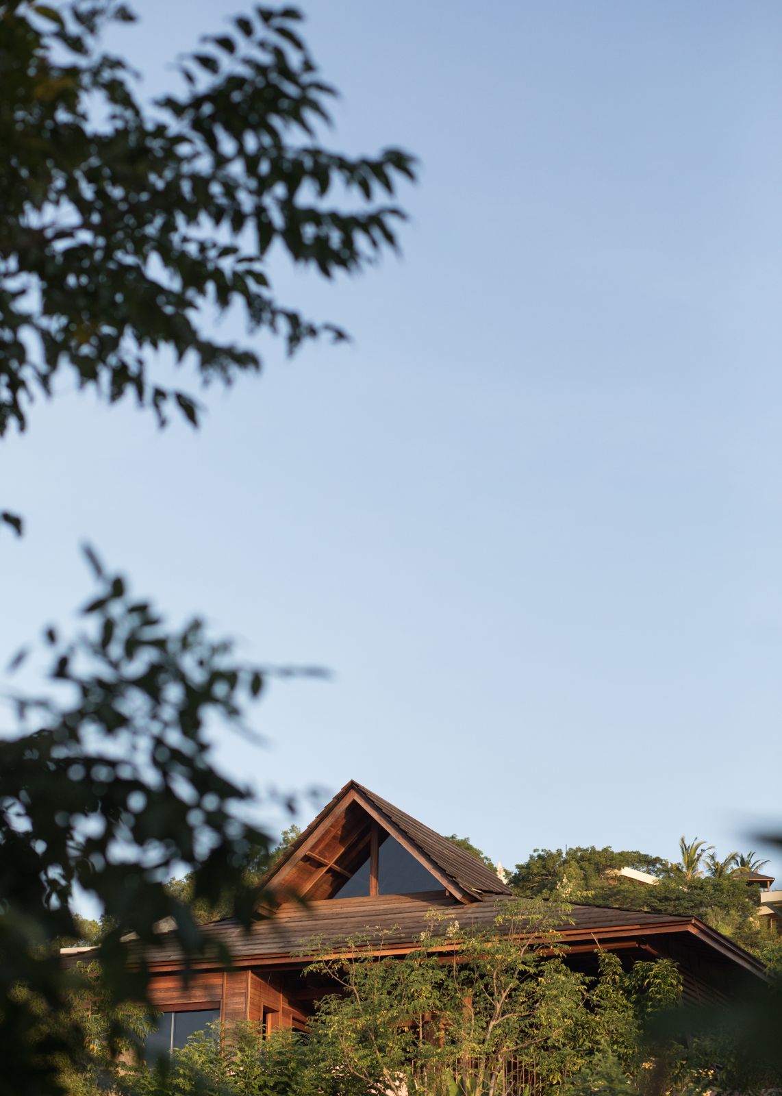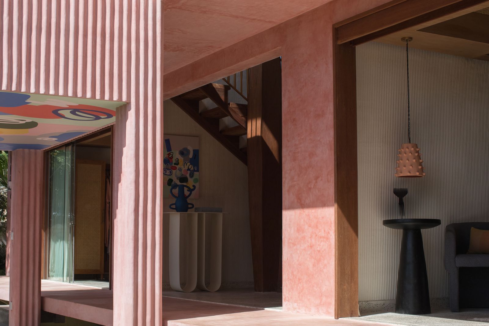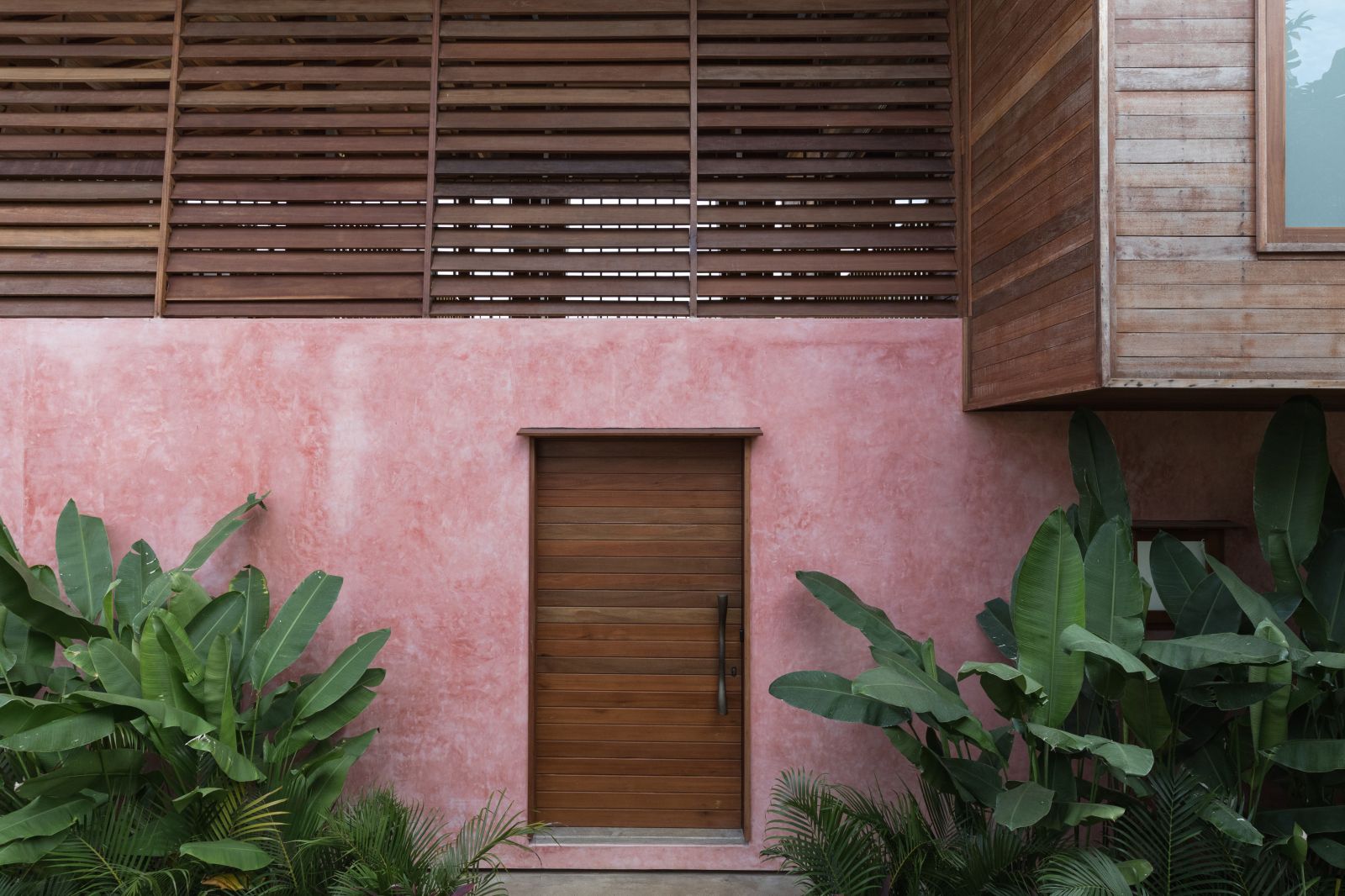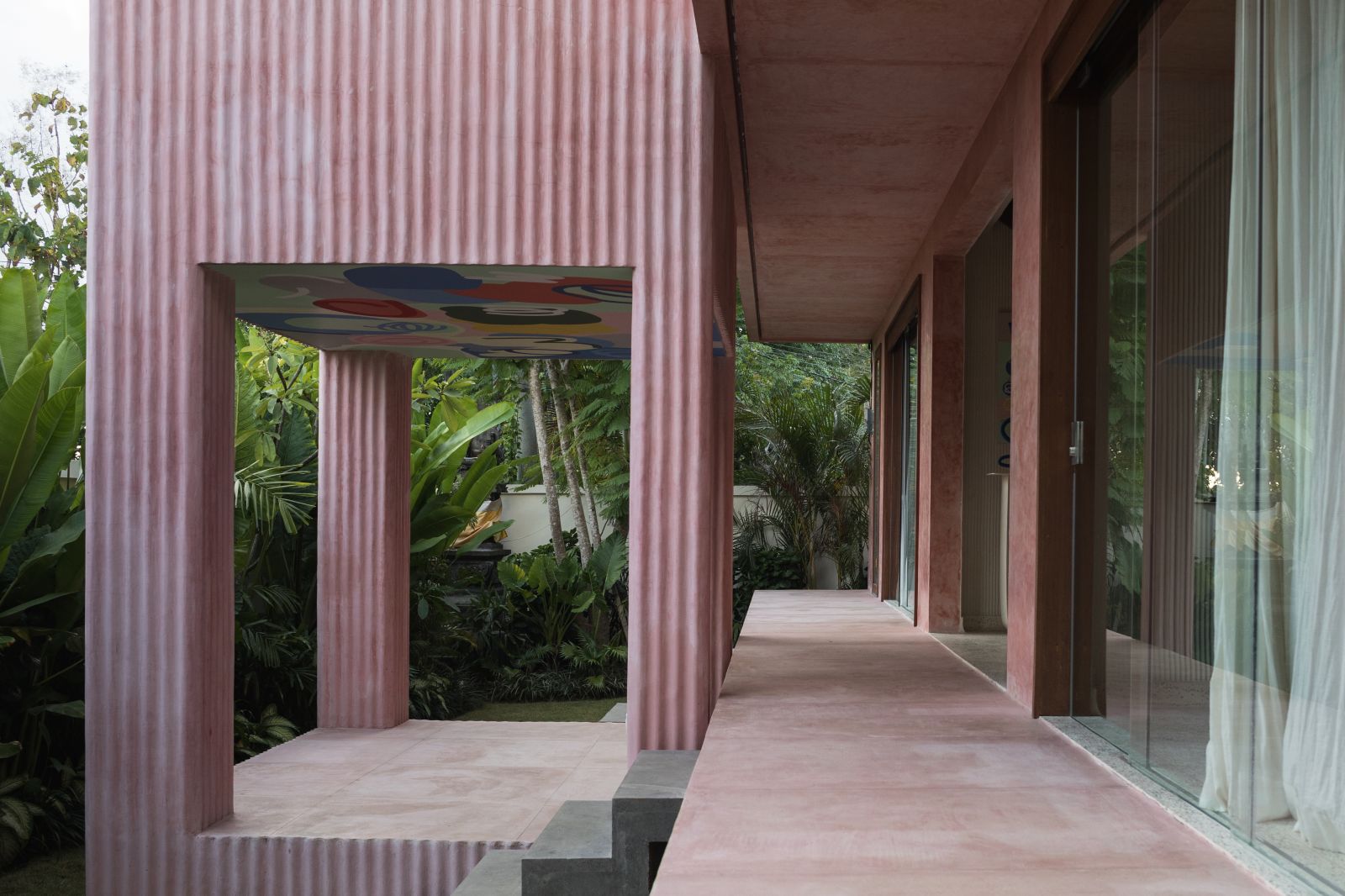 The architecture unfolds across two stacked volumes, where a richly timbered structure sits atop a soft pink concrete base. An open-air living, dining, and kitchen area is framed by operable wooden louvers, flowing seamlessly toward the signature upper-level plunge pool that appears to float among the trees. A sculptural foyer and adjacent yoga shala complete the experience, offering spaces for both gathering and quiet retreat.
