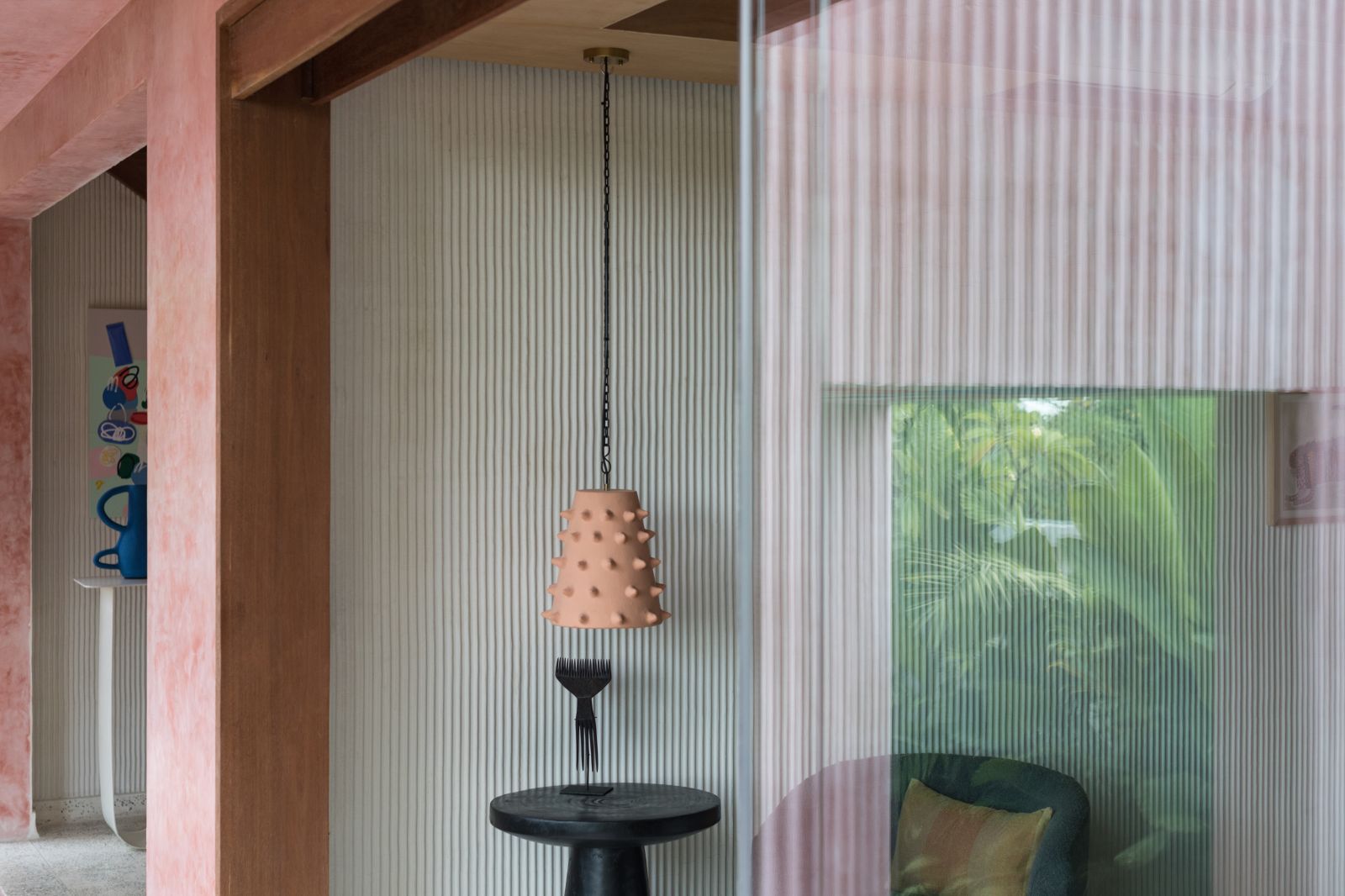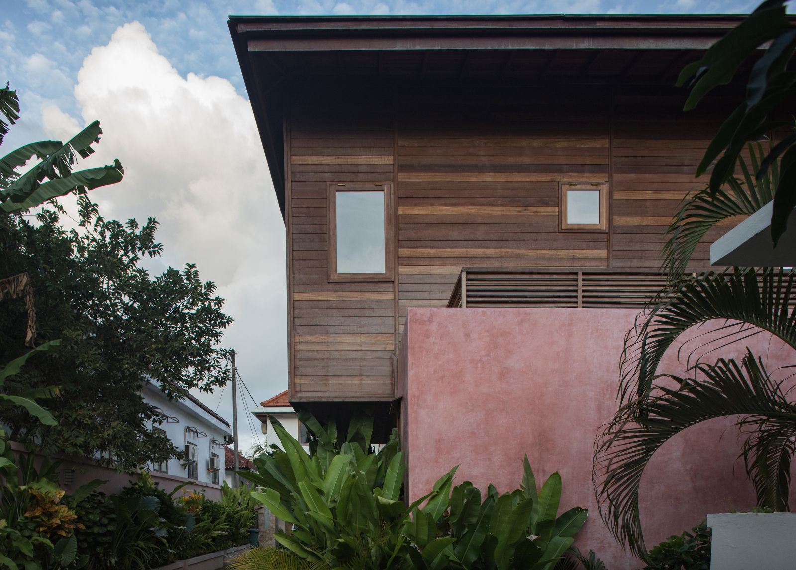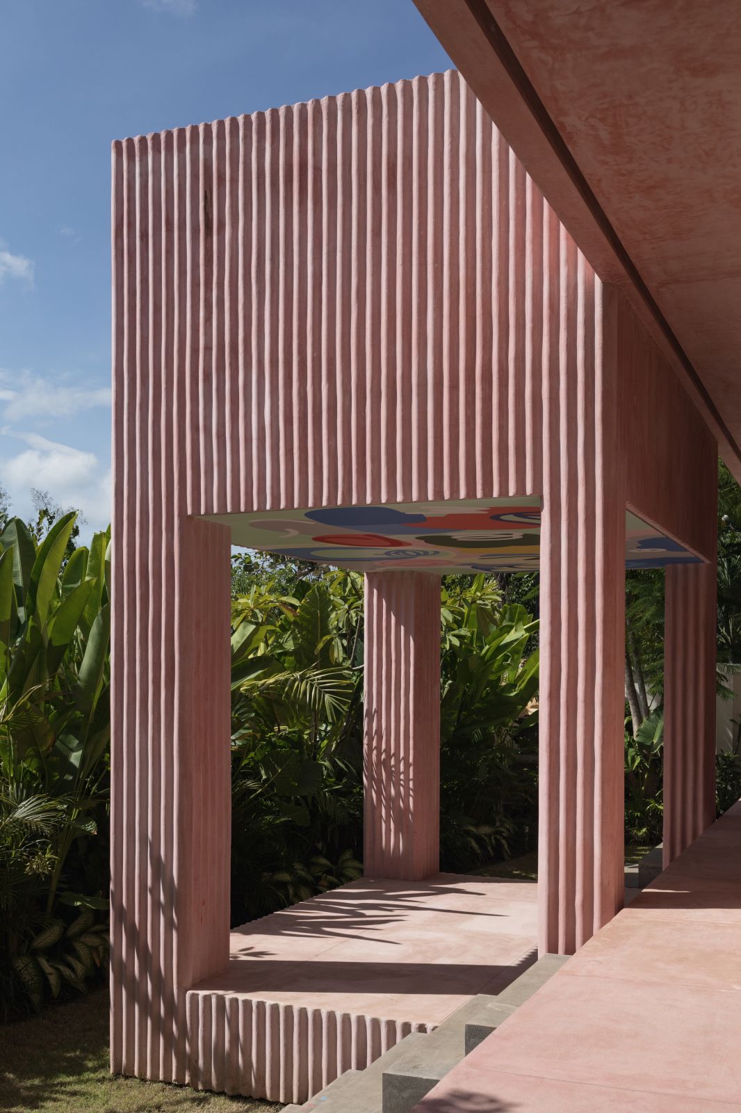 The architecture unfolds across two stacked volumes, where a richly timbered structure sits atop a soft pink concrete base. An open-air living, dining, and kitchen area is framed by operable wooden louvers, flowing seamlessly toward the signature upper-level plunge pool that appears to float among the trees. A sculptural foyer and adjacent yoga shala complete the experience, offering spaces for both gathering and quiet retreat.