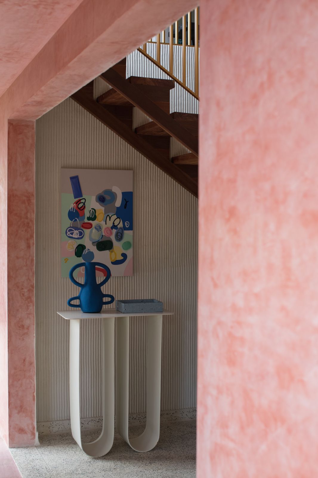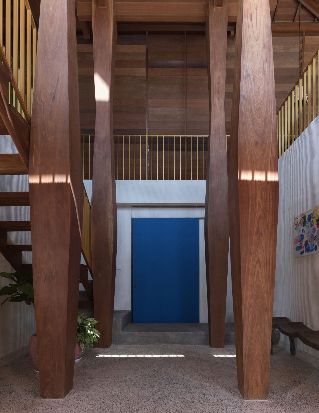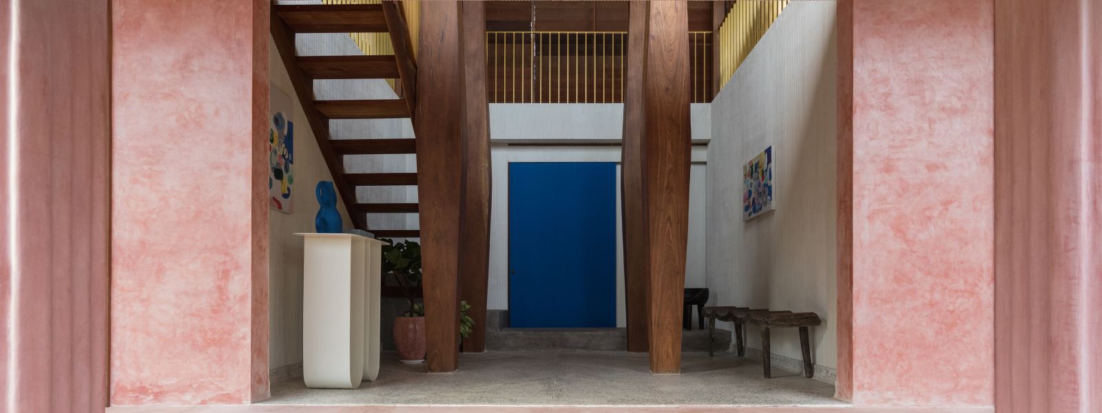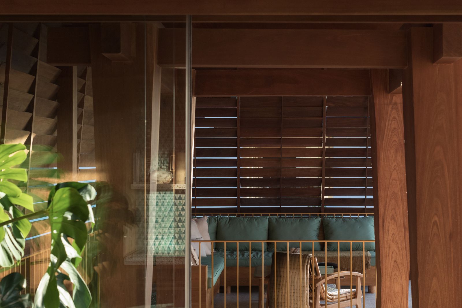 The architecture unfolds across two stacked volumes, where a richly timbered structure sits atop a soft pink concrete base. An open-air living, dining, and kitchen area is framed by operable wooden louvers, flowing seamlessly toward the signature upper-level plunge pool that appears to float among the trees. A sculptural foyer and adjacent yoga shala complete the experience, offering spaces for both gathering and quiet retreat.
