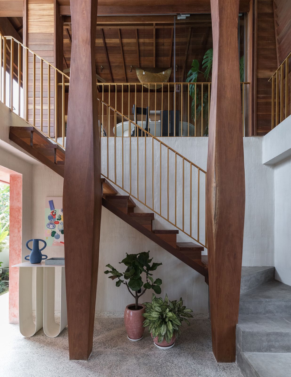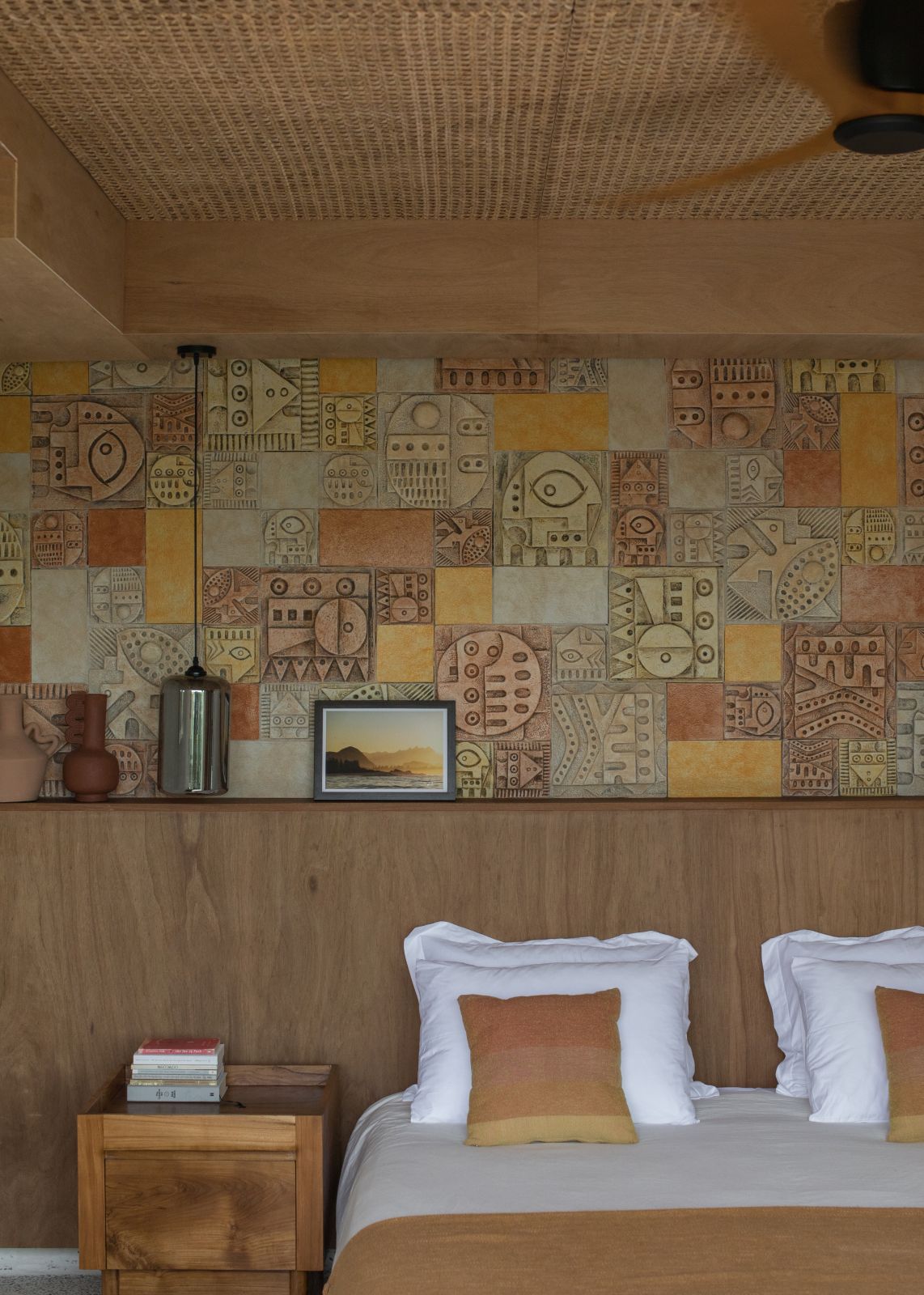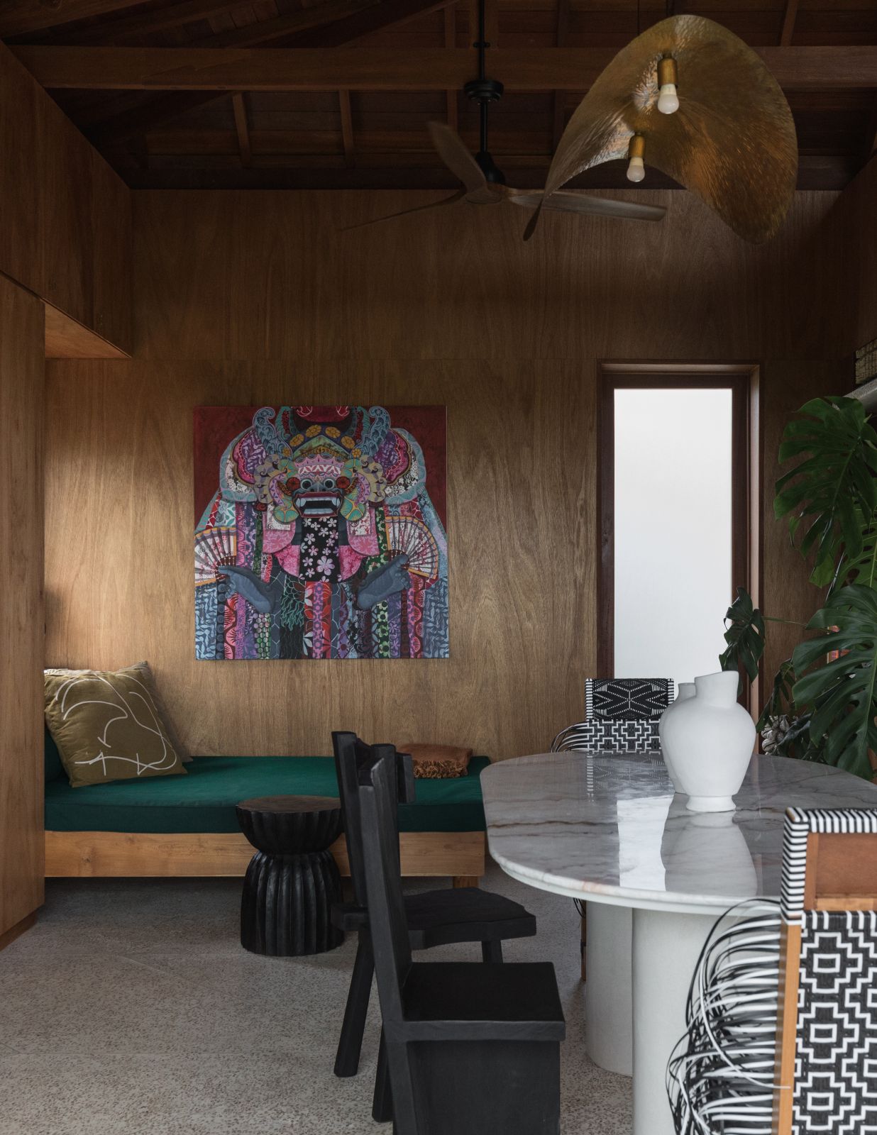 Art and craft are woven throughout, from a hand-painted ceiling mural by Los Angeles artist Ryan Tyler Martinez to handcrafted Balinese tiles by Philip Lakeman. Layered textures, playful forms, and curated artworks bring warmth and personality to the timber structure, resulting in a design-forward sanctuary defined by originality, soul, and architectural integrity in Bali.