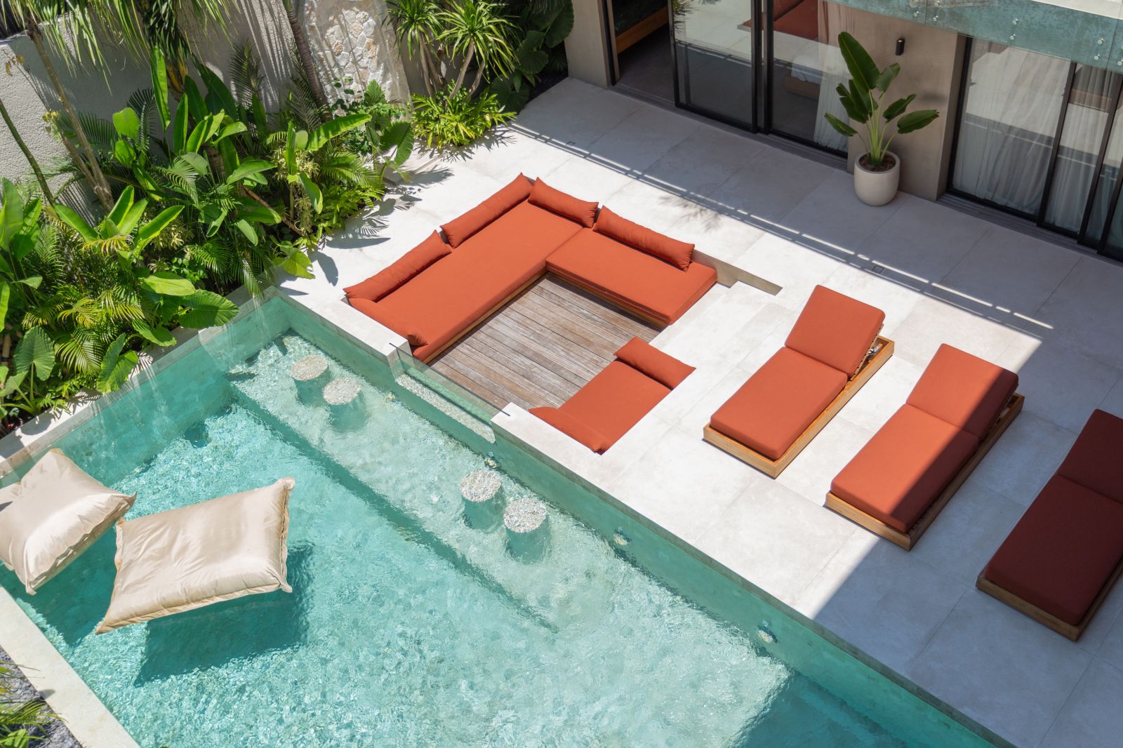 The villa features four ensuite bedrooms, a grand living area with double-height ceilings and a sunken sofa lounge, a sleek modern kitchen, rooftop terrace, and a sauna. Every element comes together to create a playful yet refined luxury lifestyle, uniquely suited to Bali.