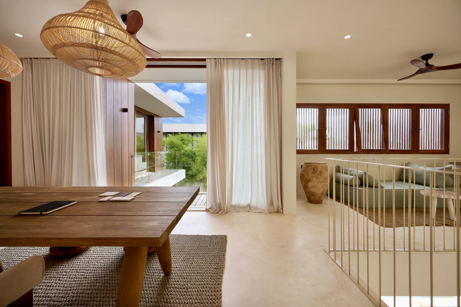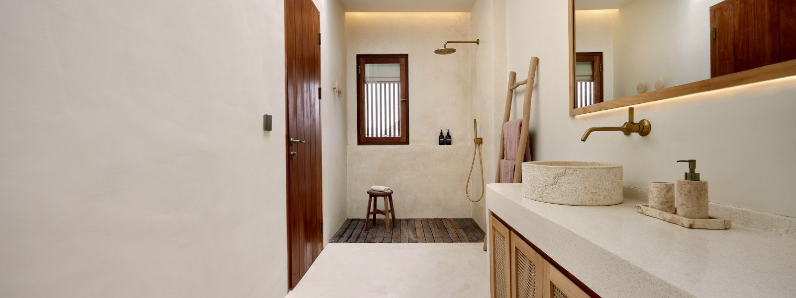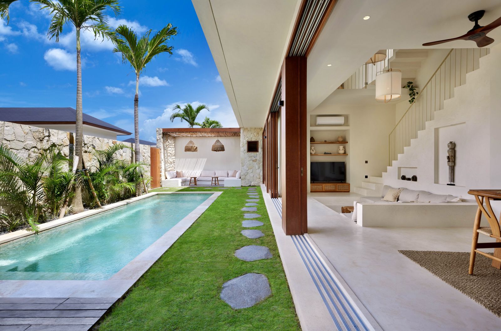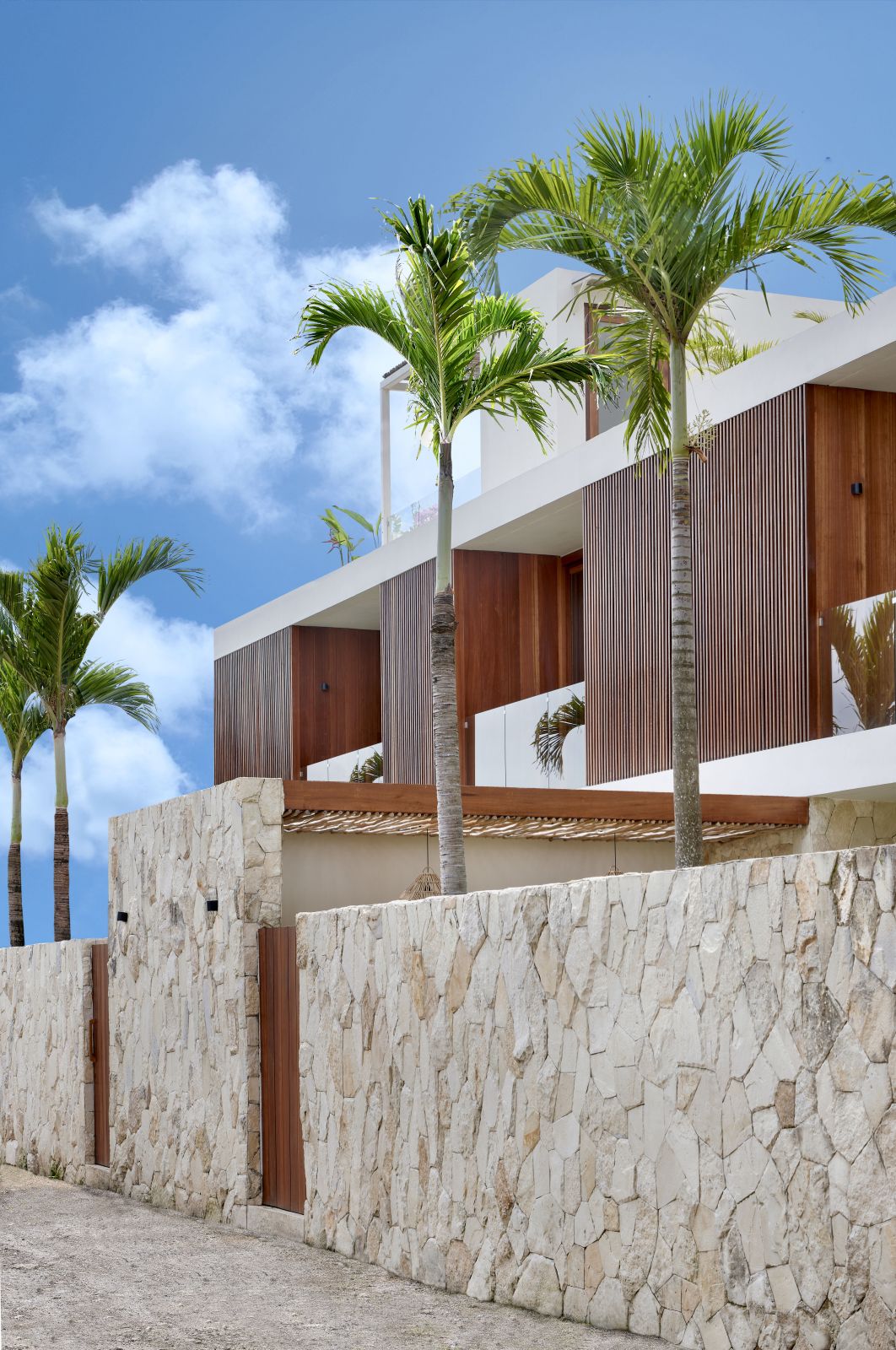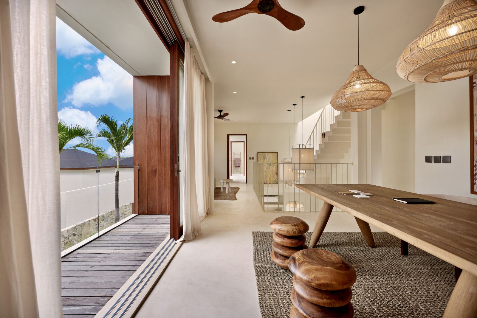 Thoughtfully designed with generous proportions and soft, natural tones, the villa features limestone-clad exterior walls and wooden façade screens. Inside, ivory-toned polished cement floors flow seamlessly into matching walls, creating a calm, cohesive aesthetic throughout the living spaces.