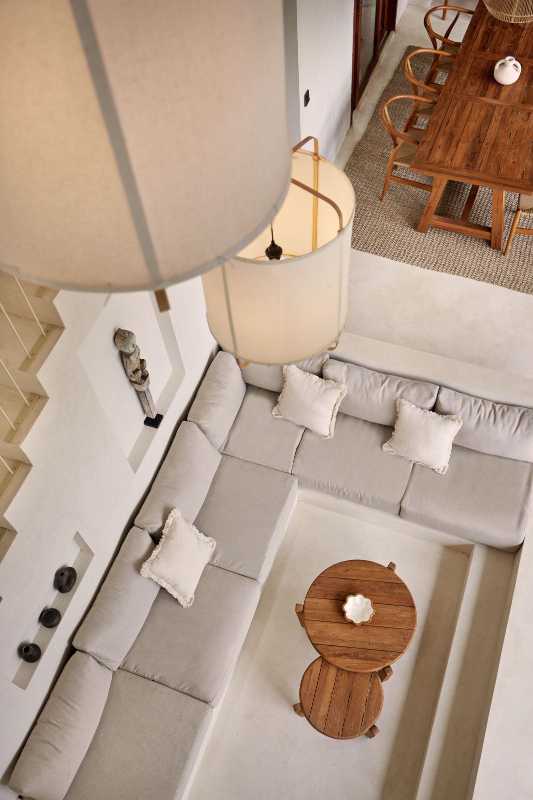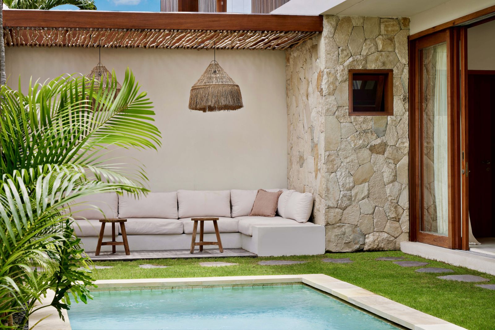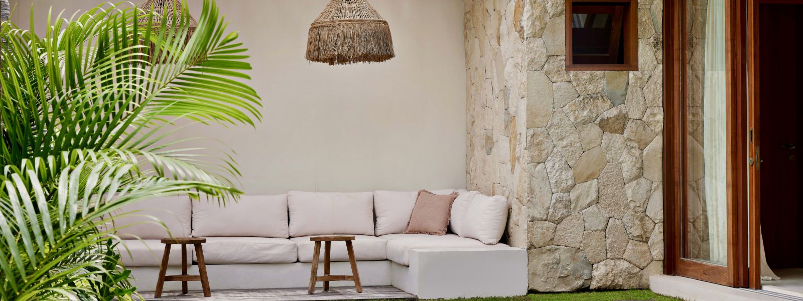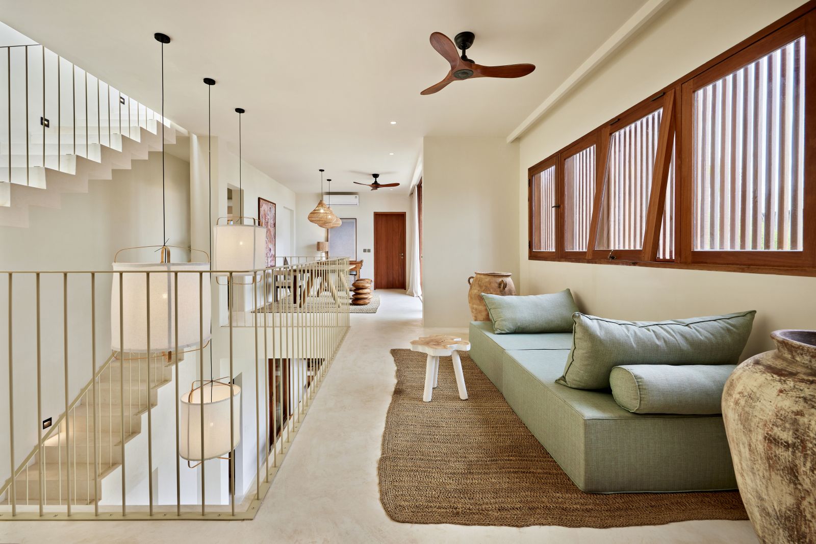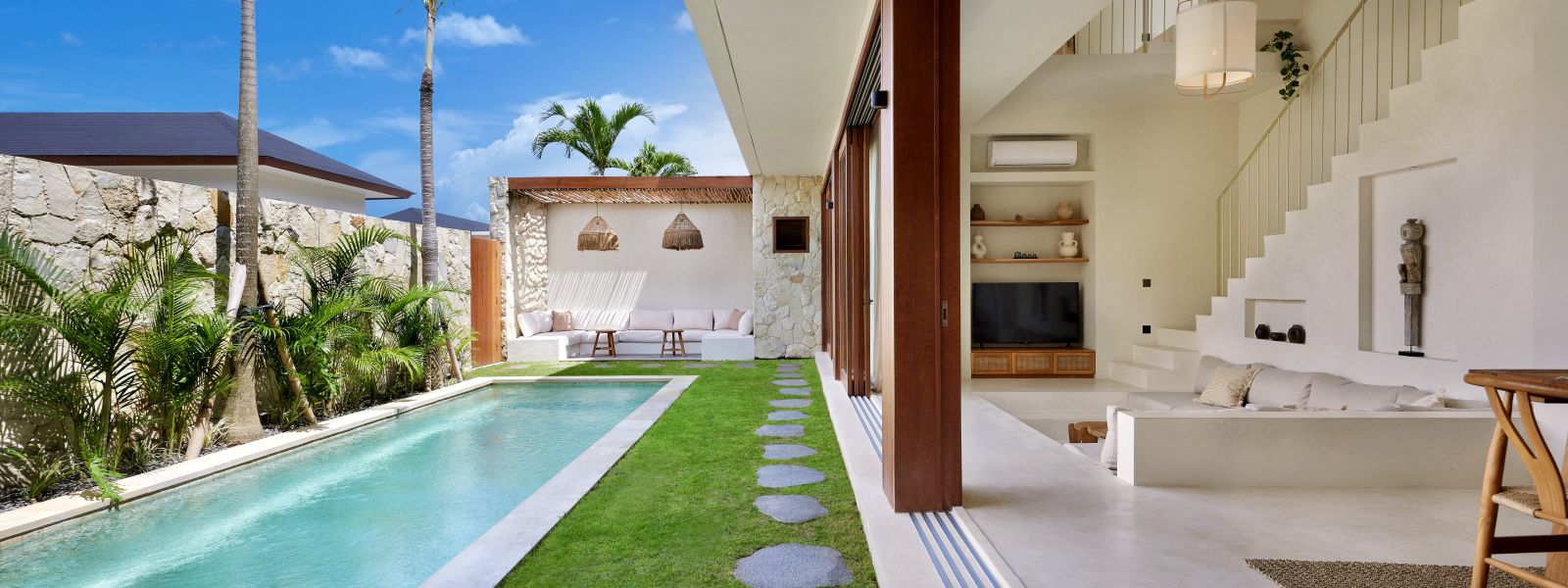 Thoughtfully designed with generous proportions and soft, natural tones, the villa features limestone-clad exterior walls and wooden façade screens. Inside, ivory-toned polished cement floors flow seamlessly into matching walls, creating a calm, cohesive aesthetic throughout the living spaces.