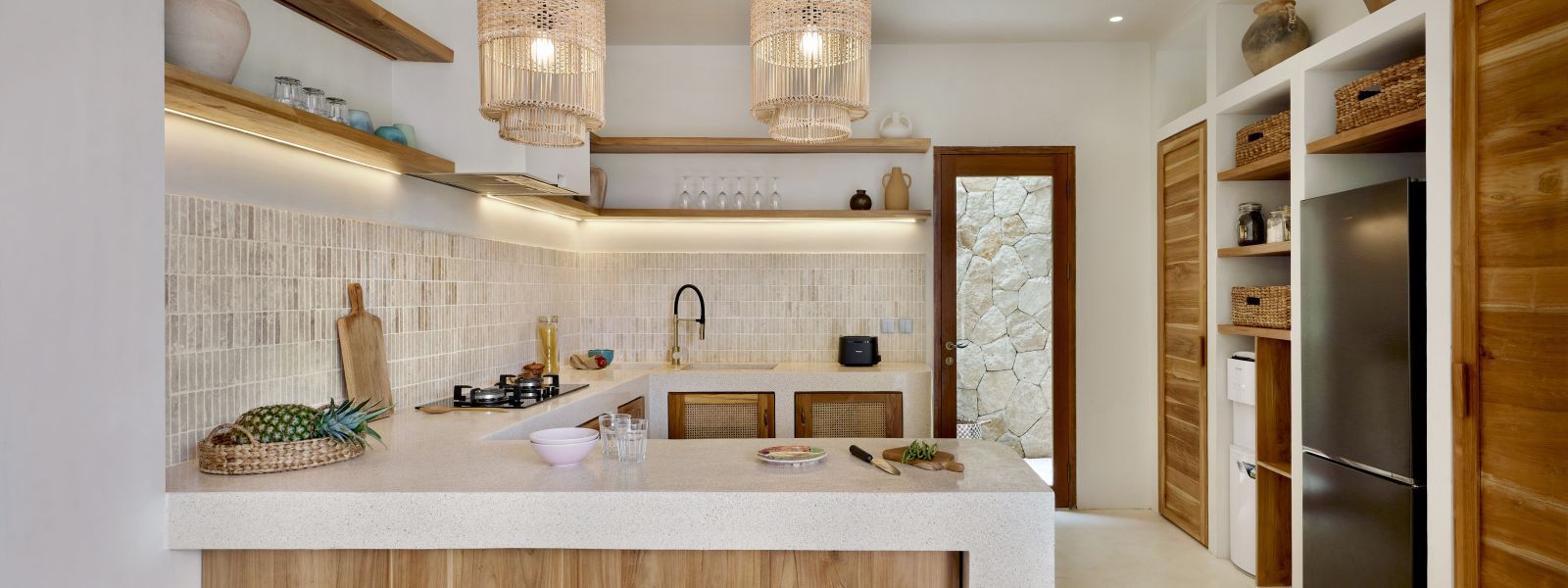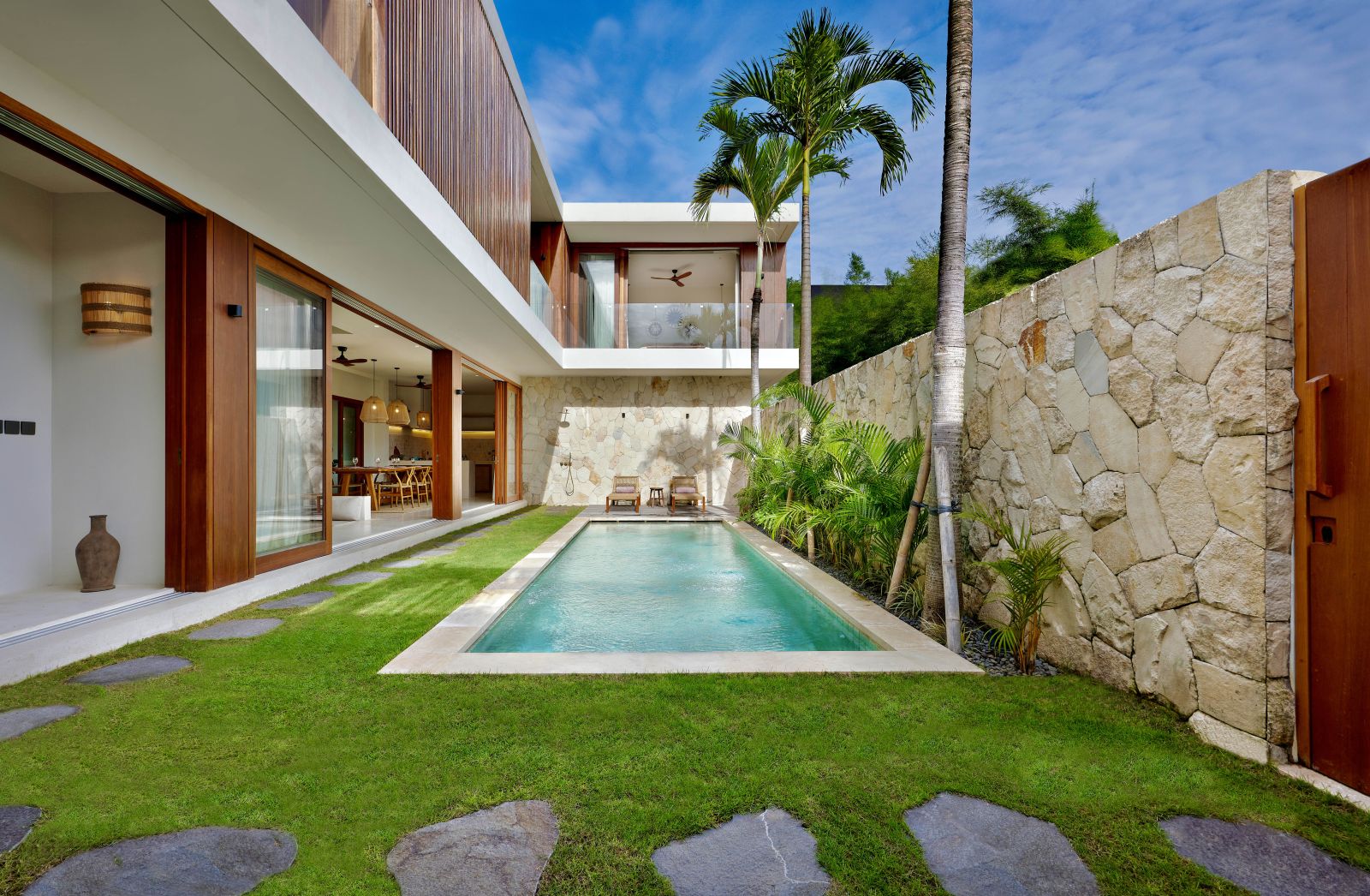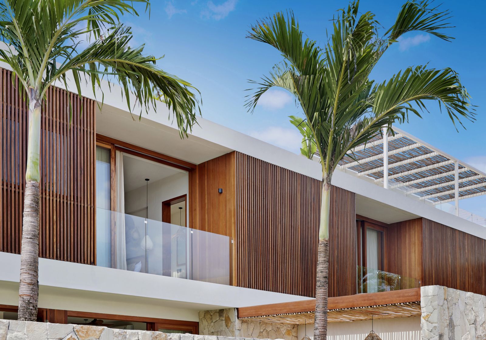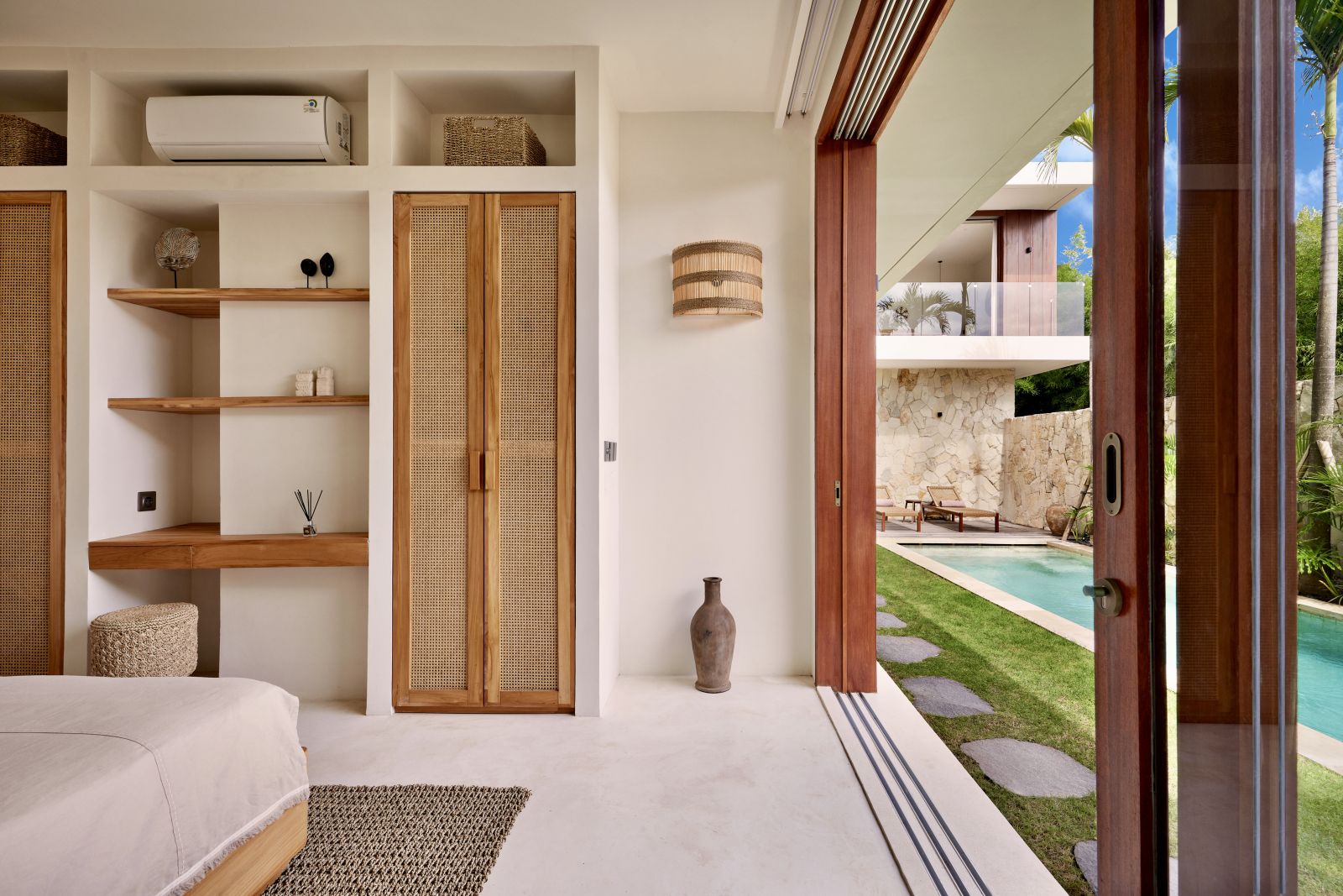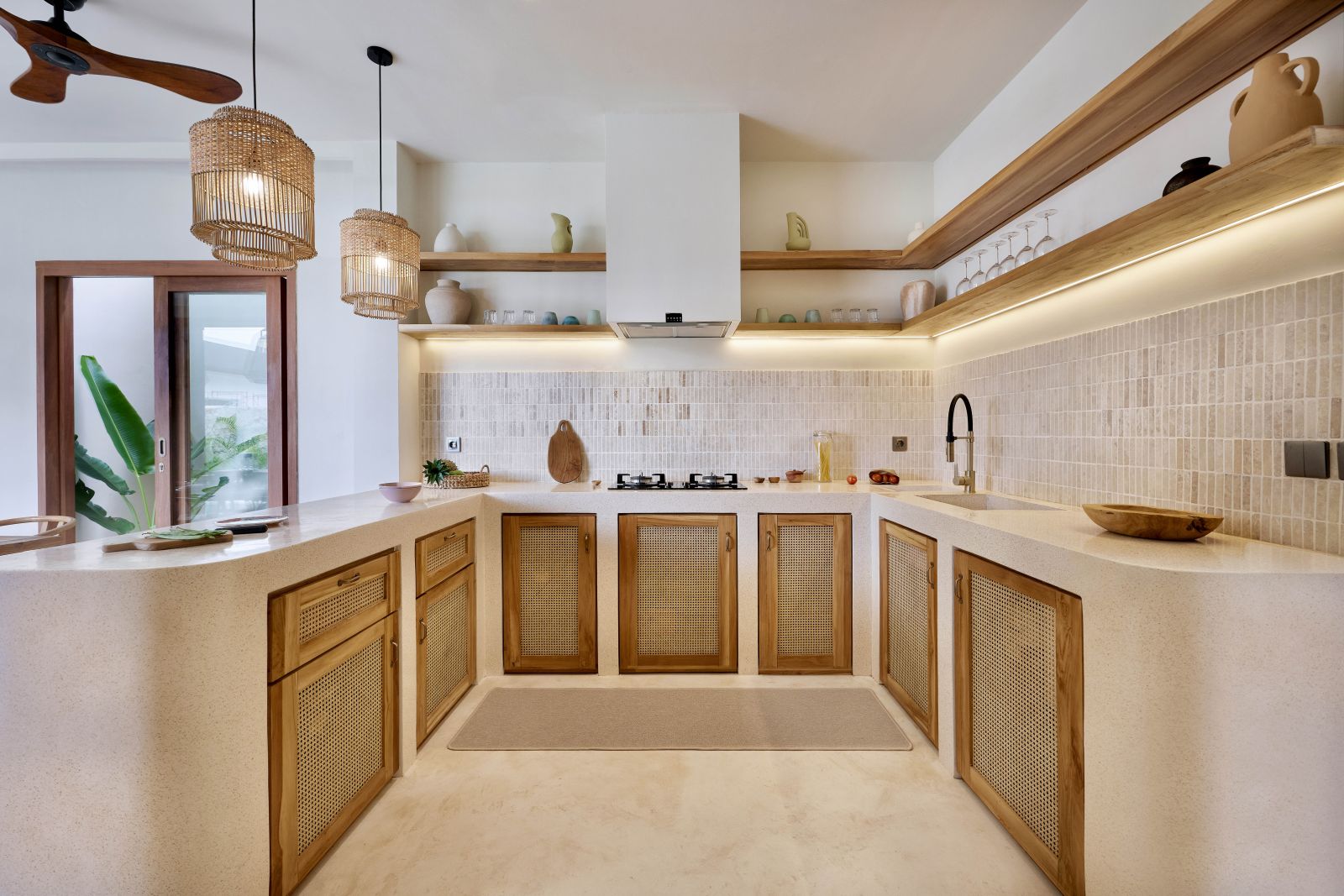 Thoughtfully designed with generous proportions and soft, natural tones, the villa features limestone-clad exterior walls and wooden façade screens. Inside, ivory-toned polished cement floors flow seamlessly into matching walls, creating a calm, cohesive aesthetic throughout the living spaces.
