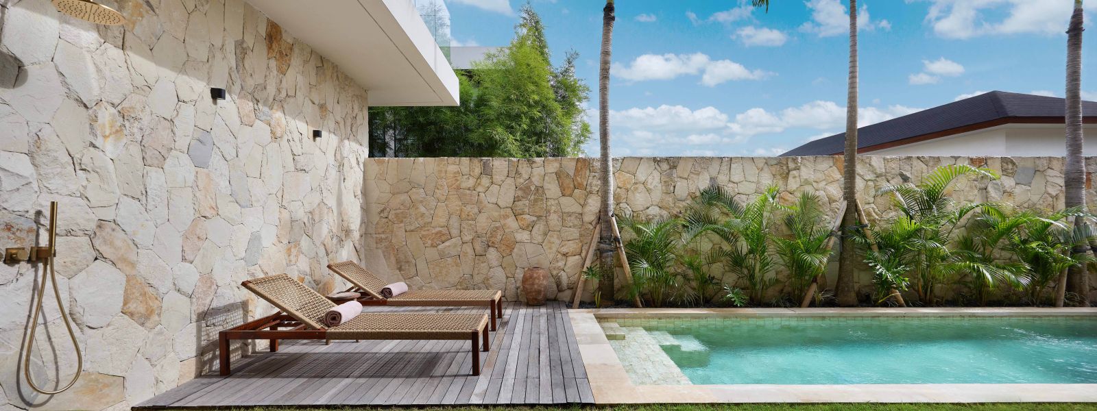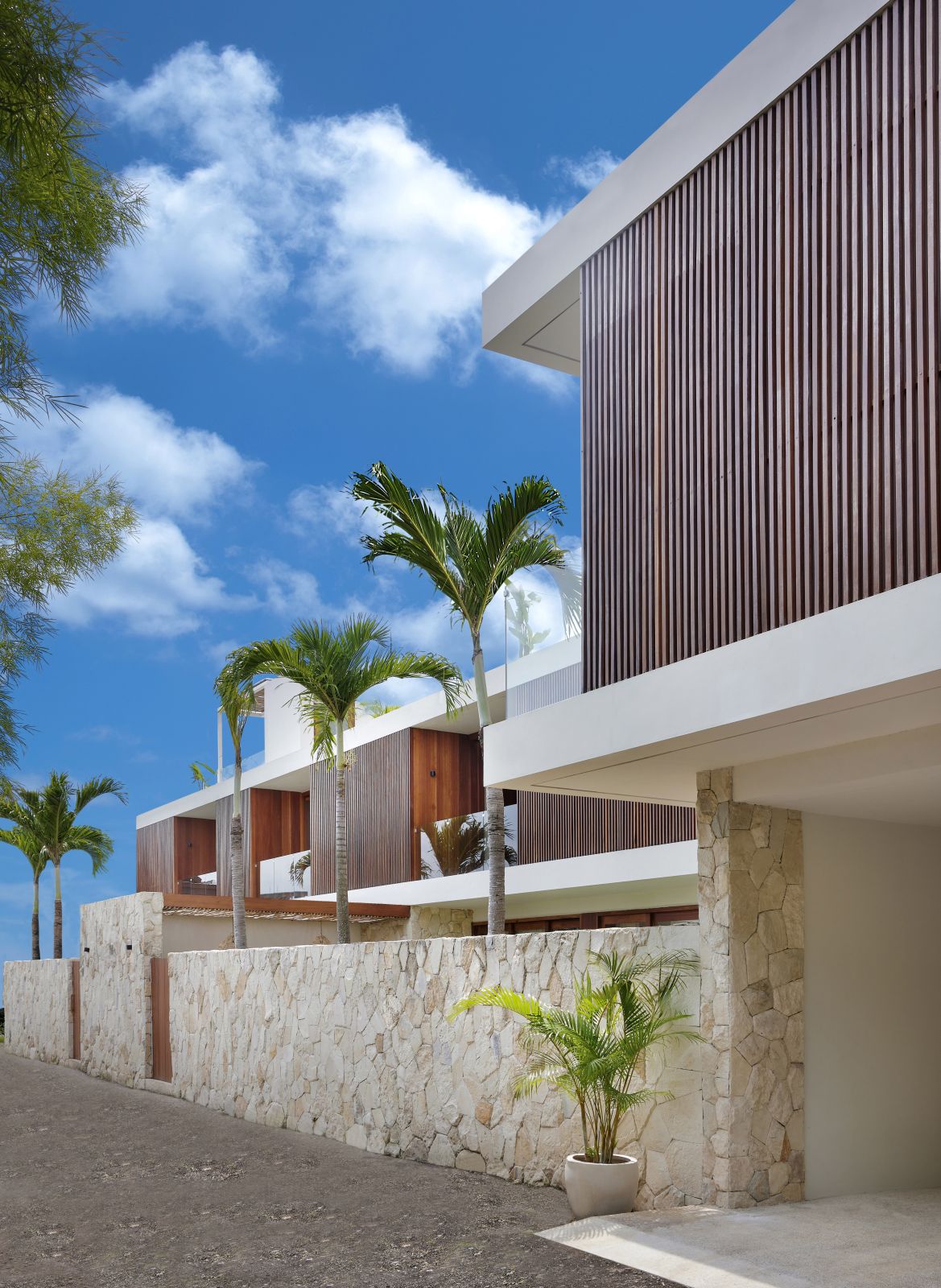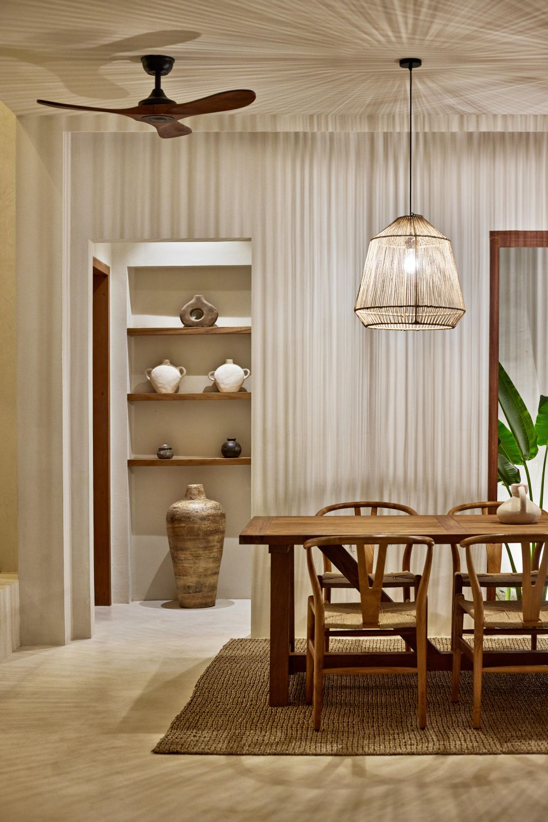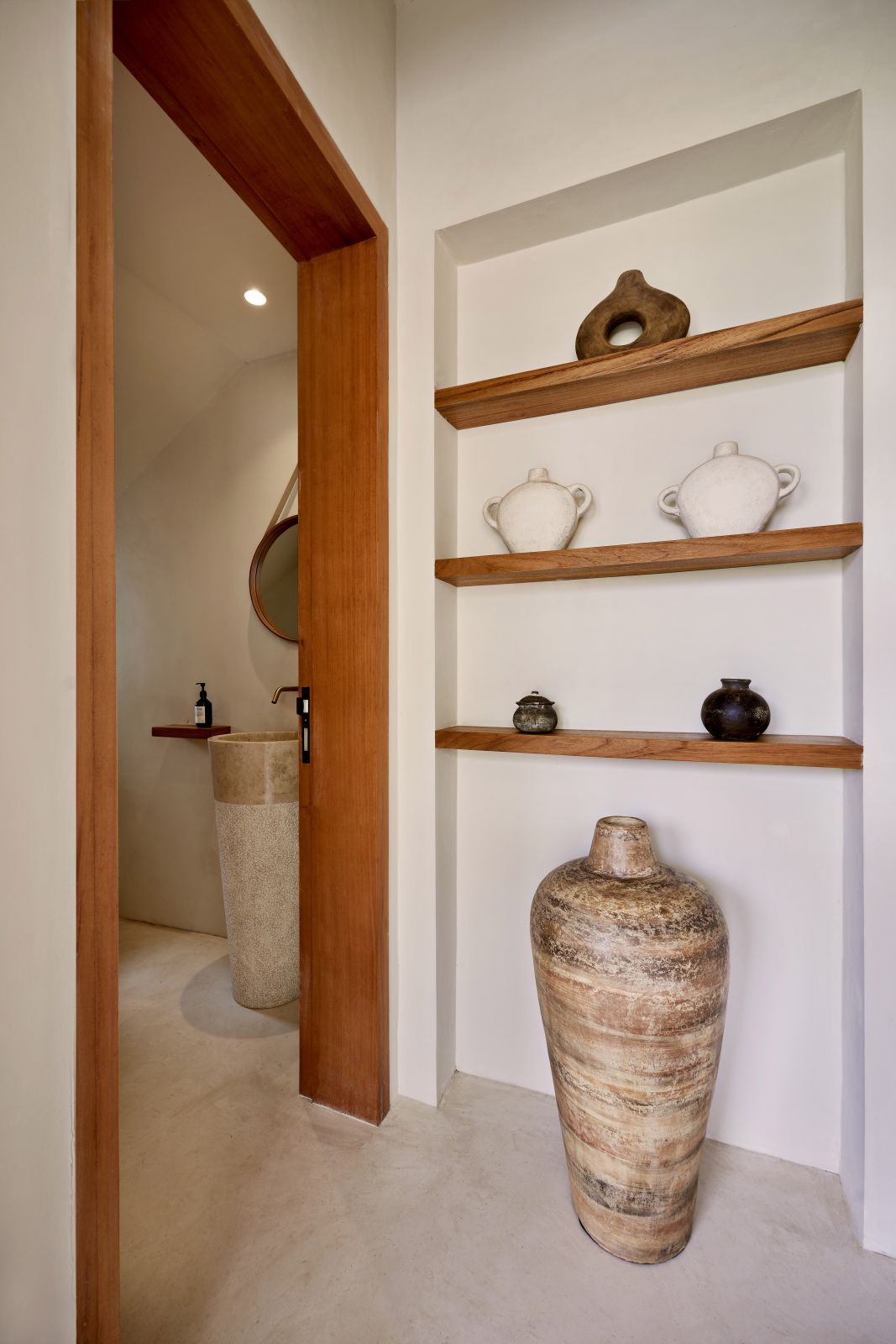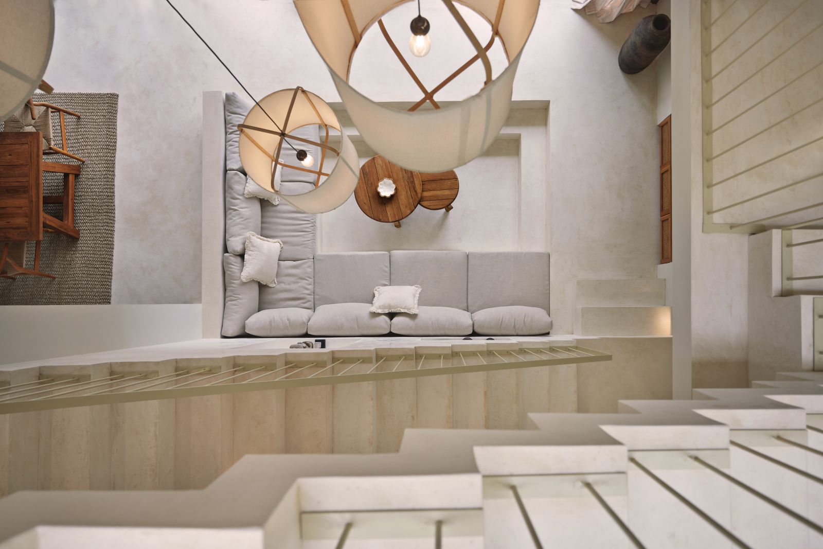 Thoughtfully designed with generous proportions and soft, natural tones, the villa features limestone-clad exterior walls and wooden façade screens. Inside, ivory-toned polished cement floors flow seamlessly into matching walls, creating a calm, cohesive aesthetic throughout the living spaces.