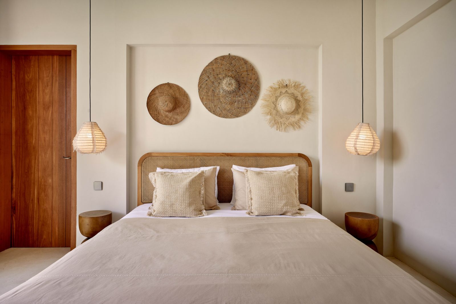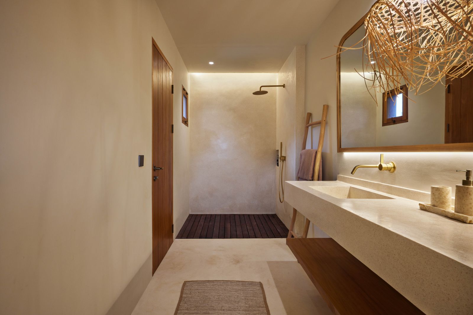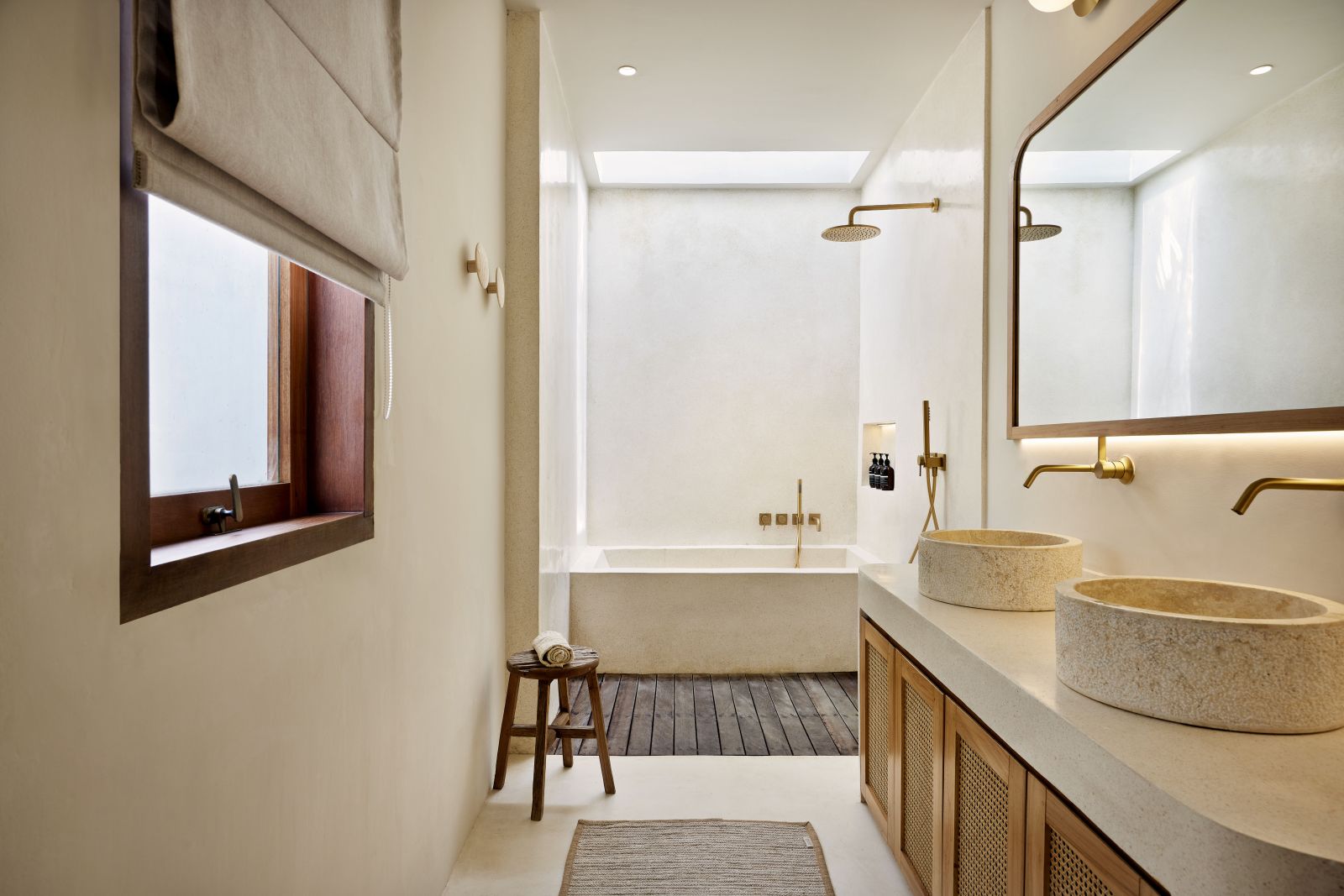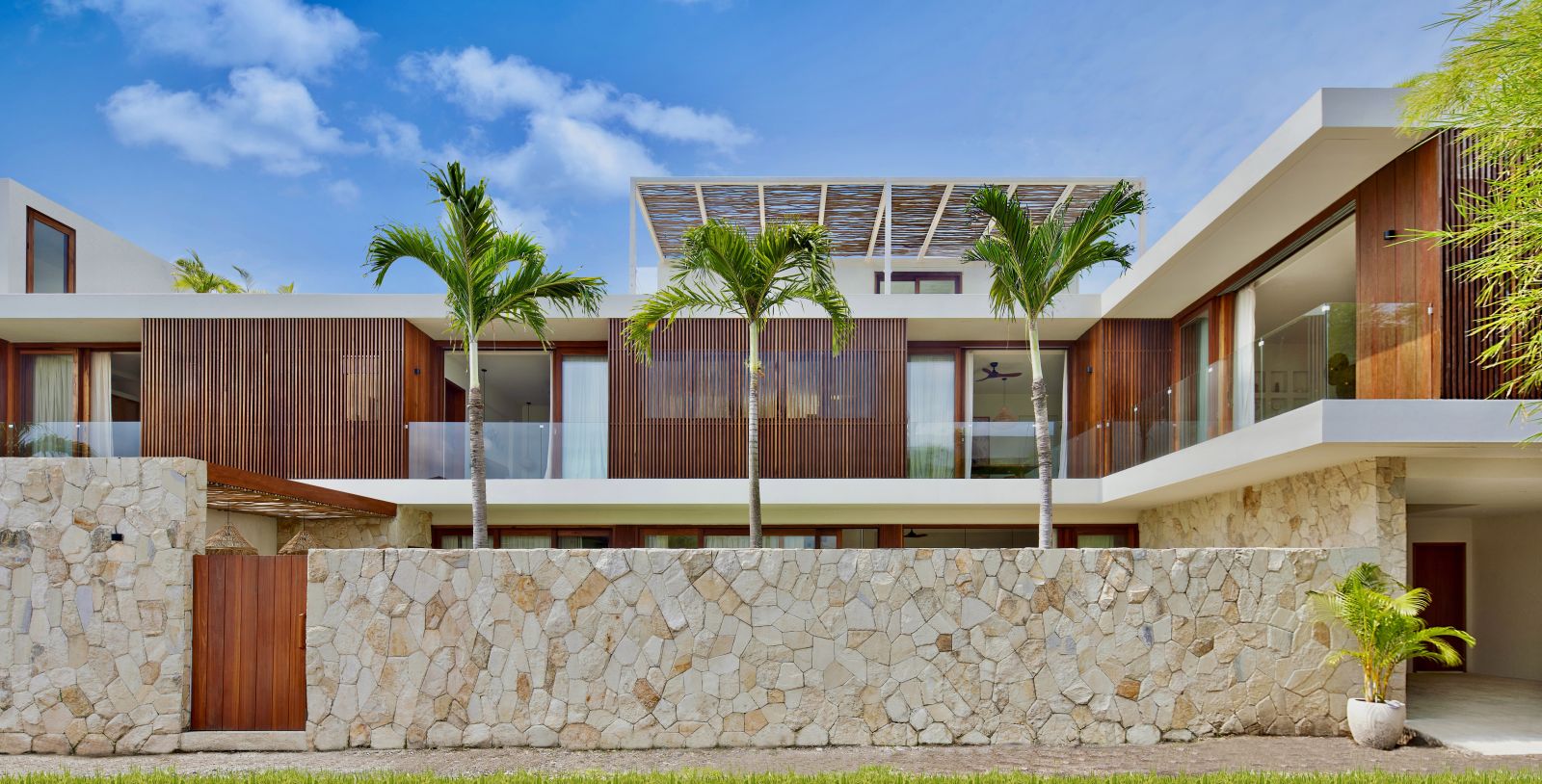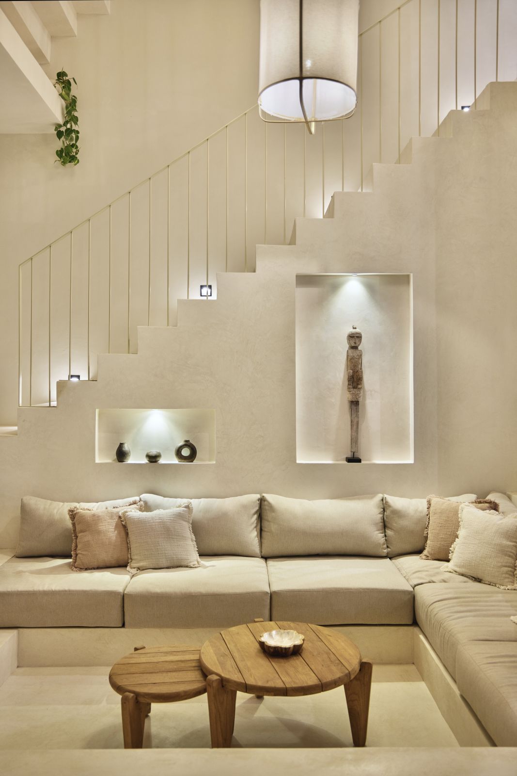 Thoughtfully designed with generous proportions and soft, natural tones, the villa features limestone-clad exterior walls and wooden façade screens. Inside, ivory-toned polished cement floors flow seamlessly into matching walls, creating a calm, cohesive aesthetic throughout the living spaces.