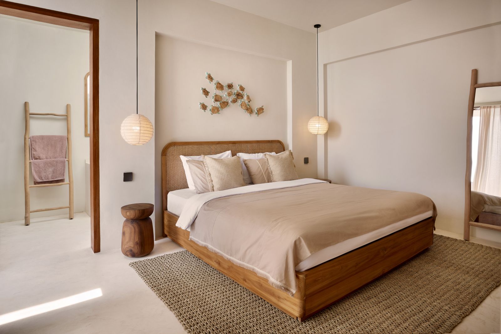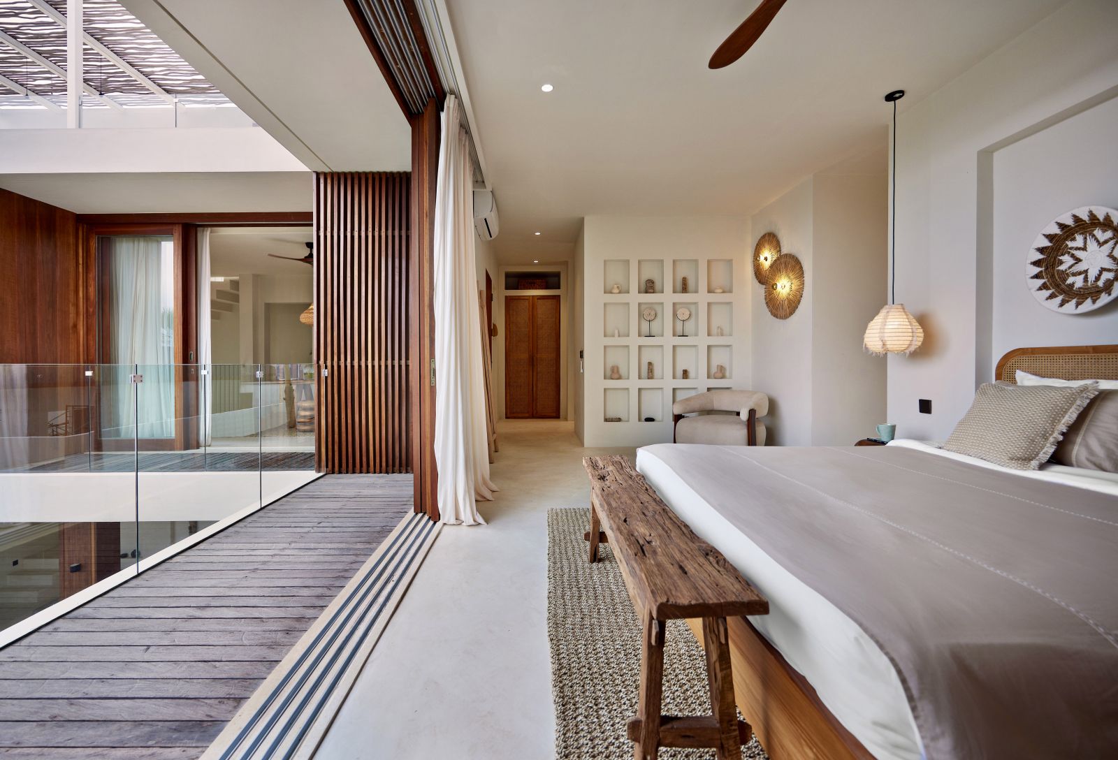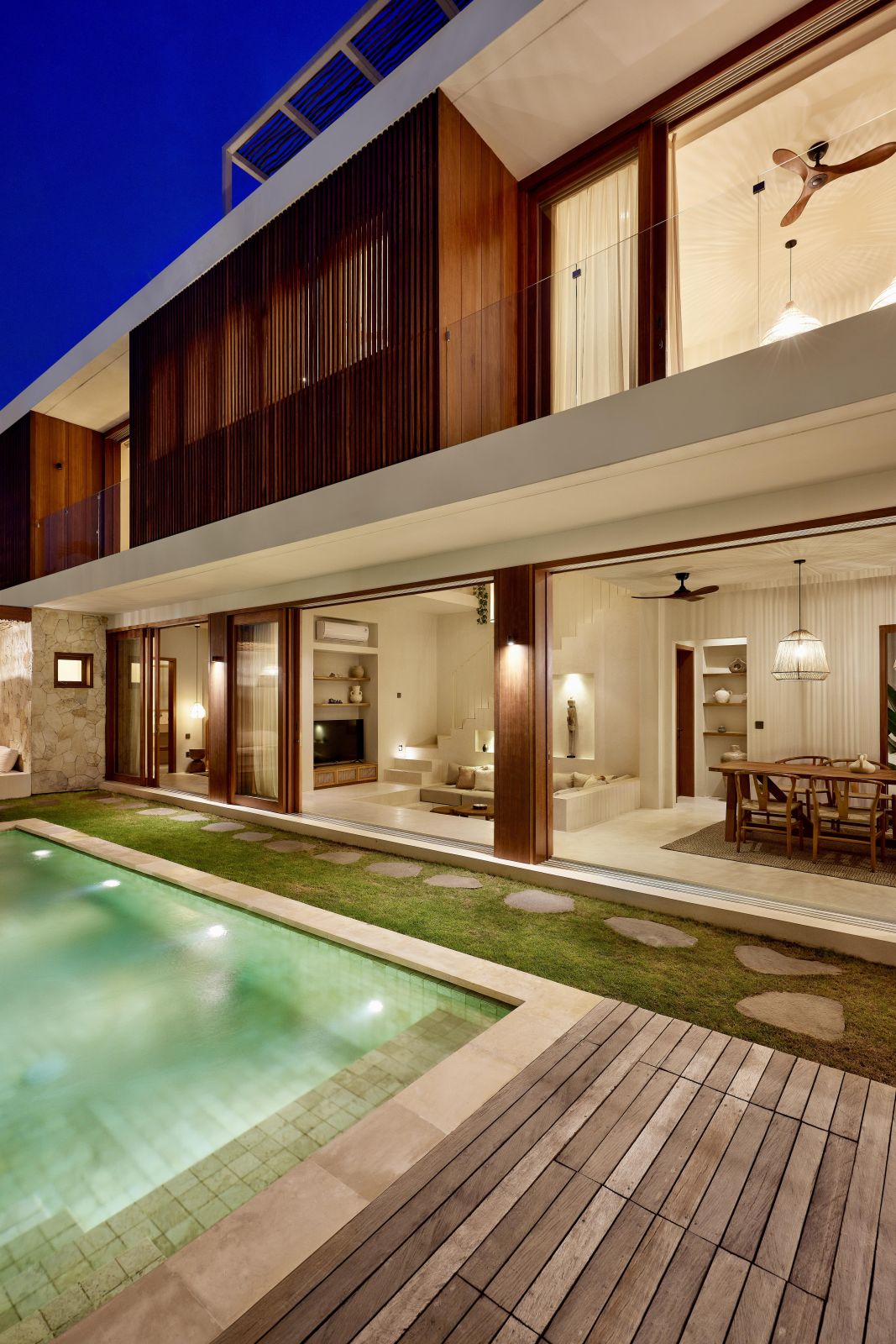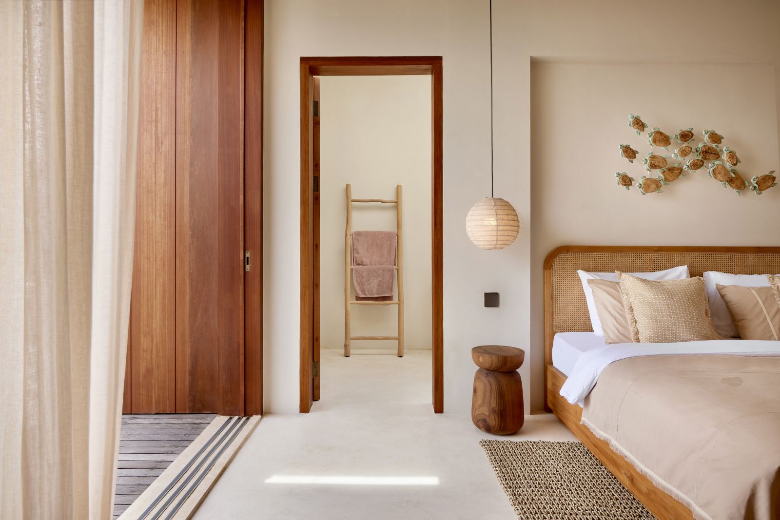 Thoughtfully designed with generous proportions and soft, natural tones, the villa features limestone-clad exterior walls and wooden façade screens. Inside, ivory-toned polished cement floors flow seamlessly into matching walls, creating a calm, cohesive aesthetic throughout the living spaces.