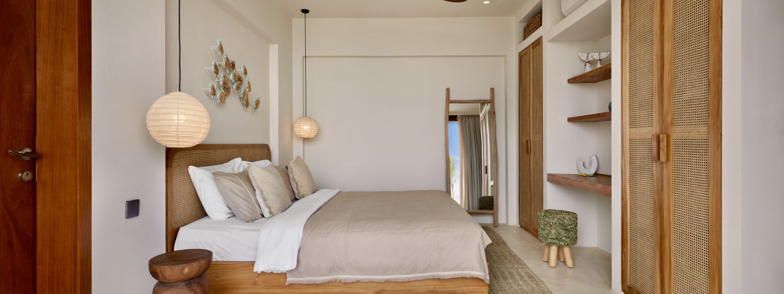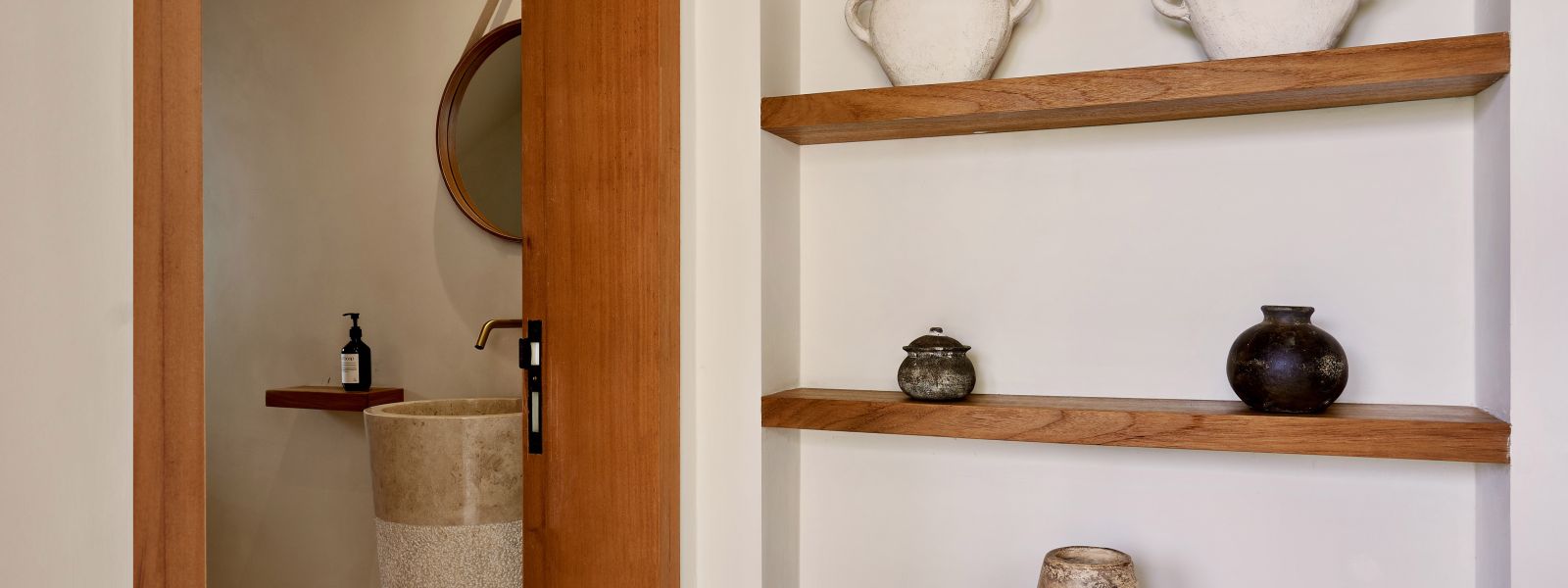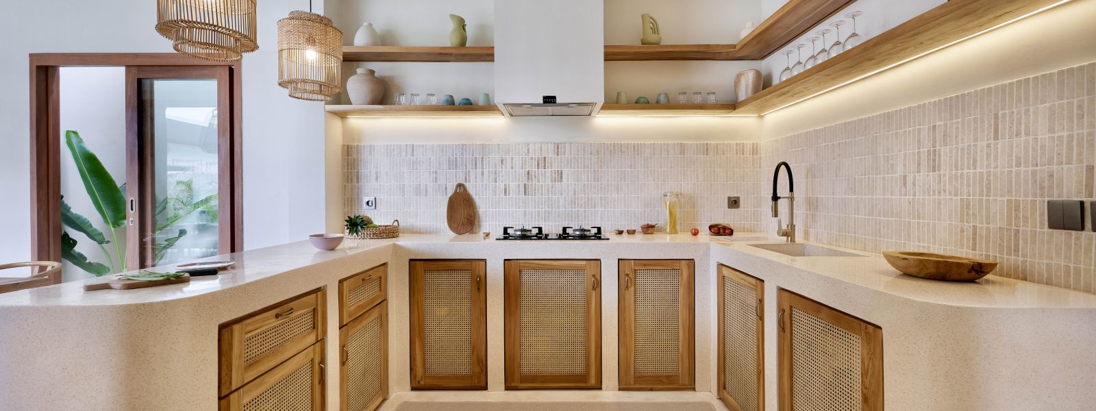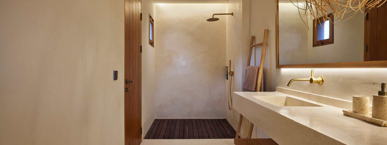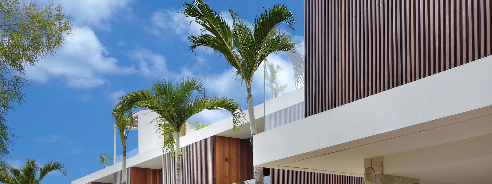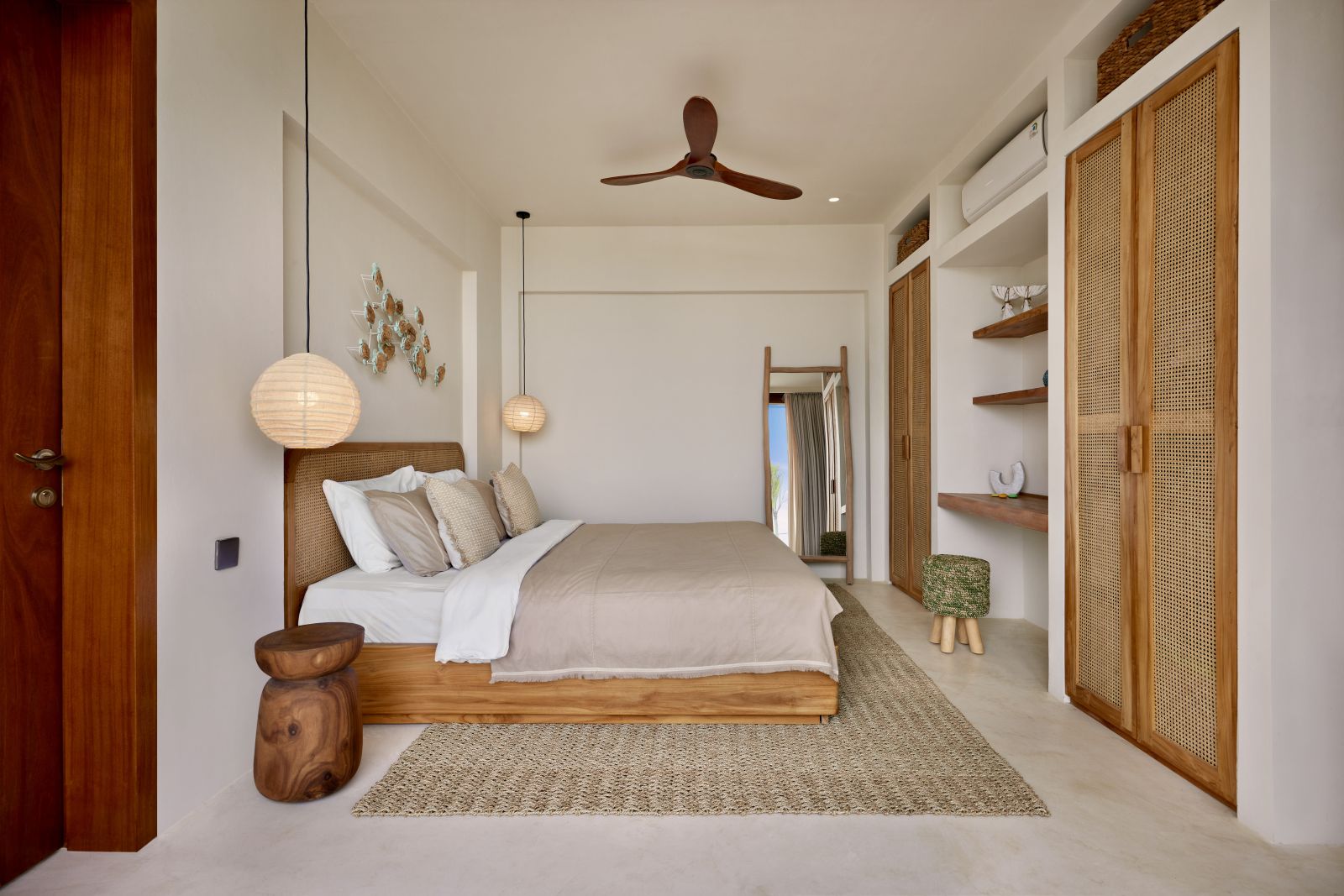 Thoughtfully designed with generous proportions and soft, natural tones, the villa features limestone-clad exterior walls and wooden façade screens. Inside, ivory-toned polished cement floors flow seamlessly into matching walls, creating a calm, cohesive aesthetic throughout the living spaces.