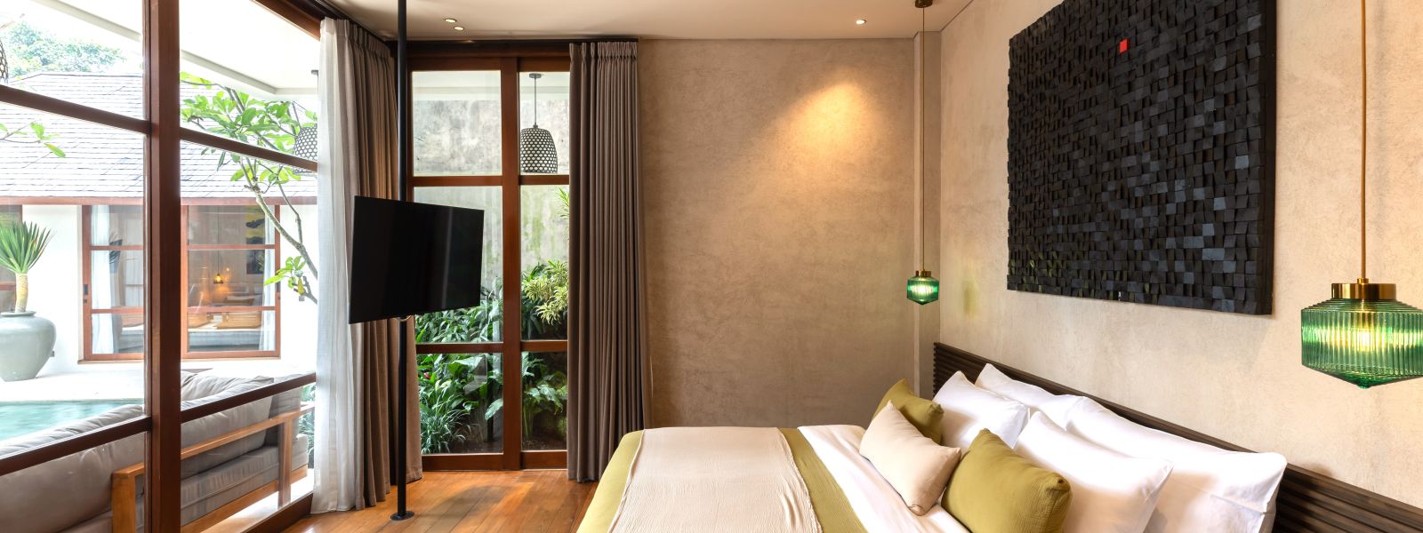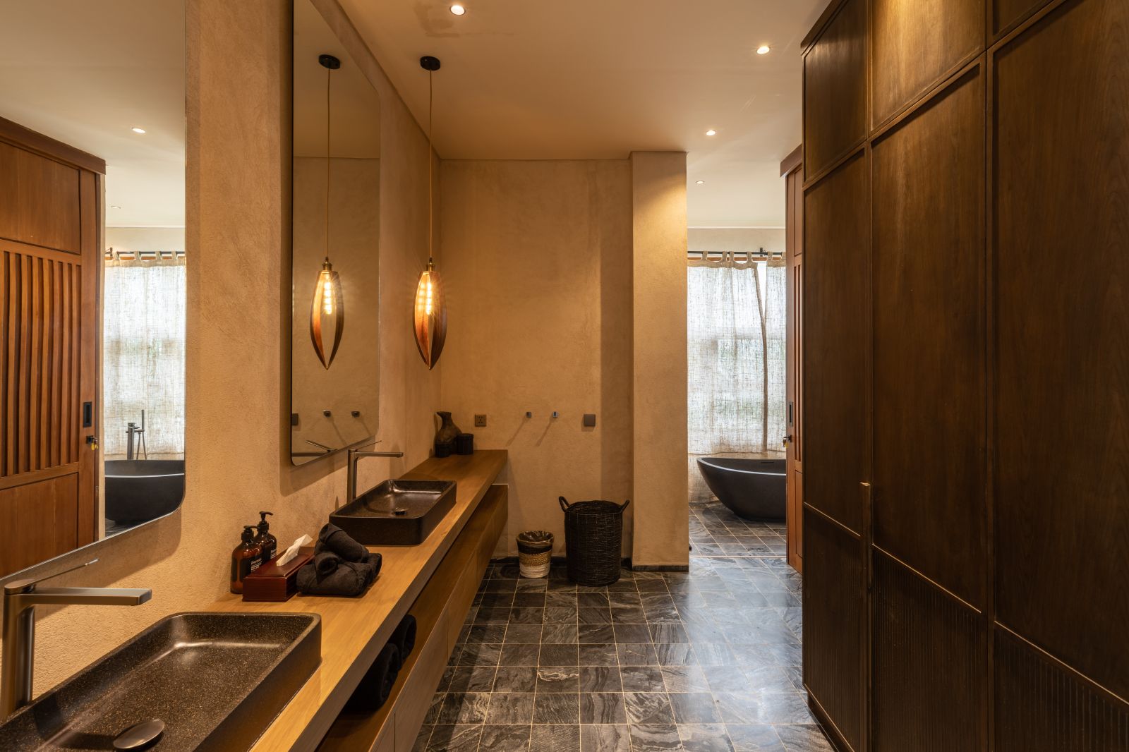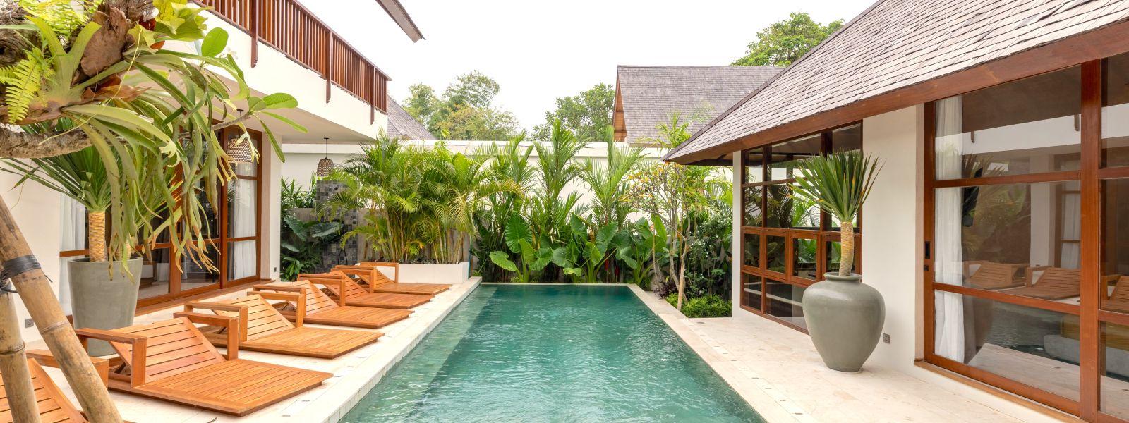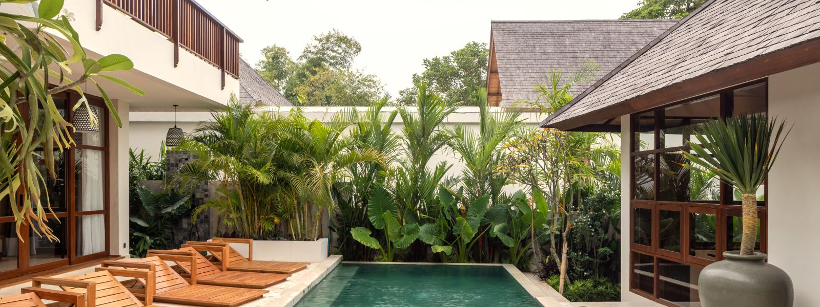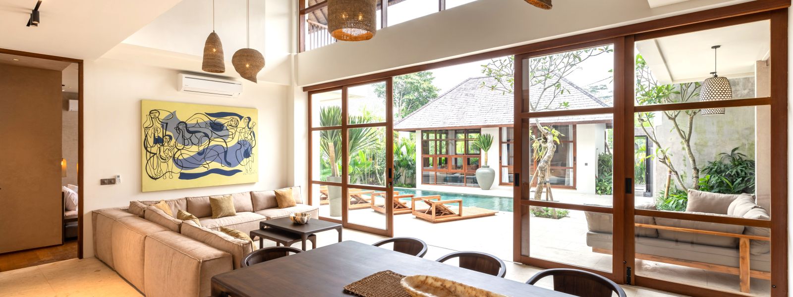 Set within a private compound of three villas in a lush natural environment, this six-bedroom villa in Nyanyi presents a refined blend of contemporary architecture, modern Balinese influence, and tropical living. The design is organized around a central pool courtyard, establishing a seamless connection between indoor living areas, outdoor terraces, and surrounding greenery.