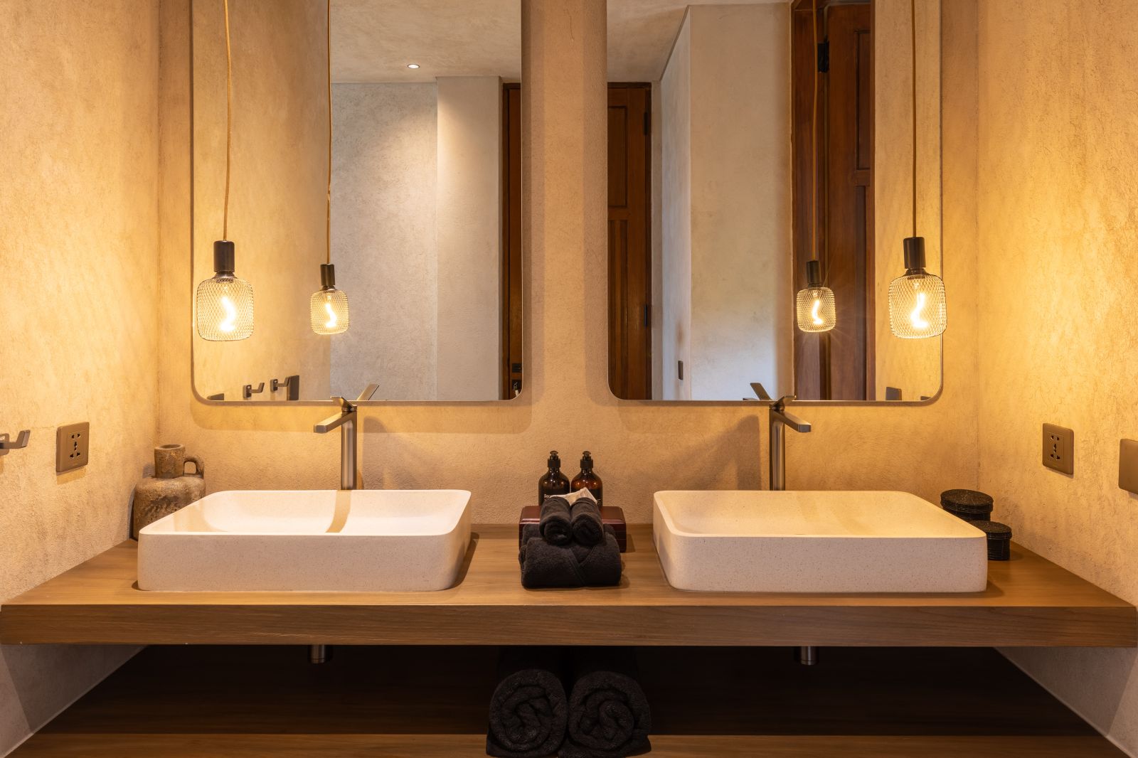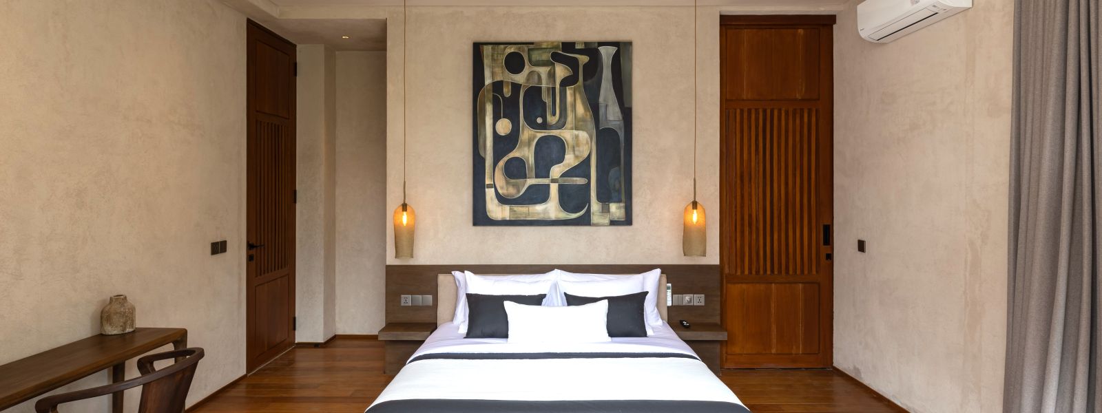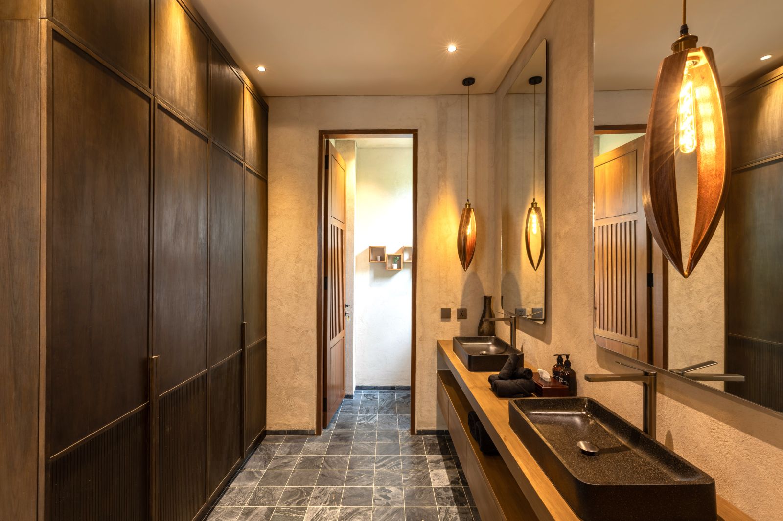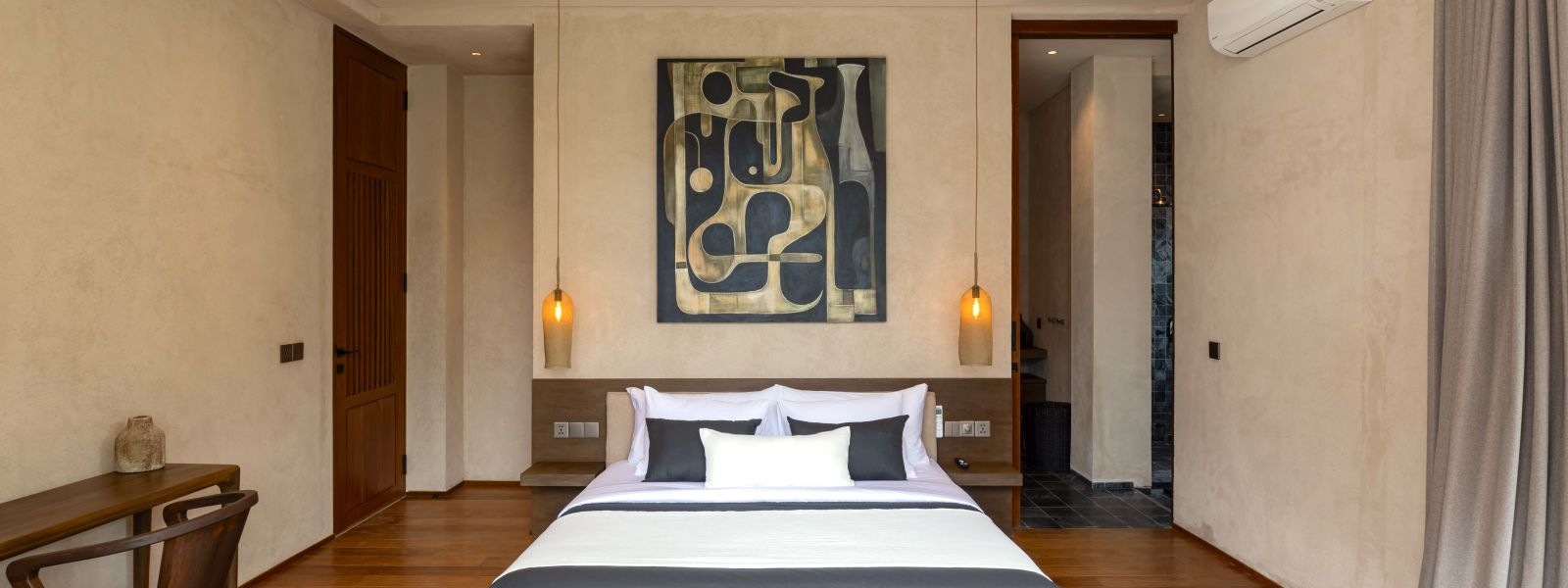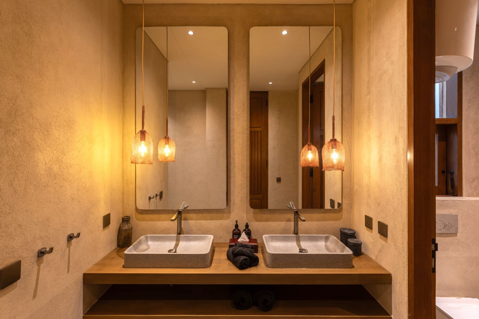 The open-plan living space integrates lounge and dining areas with clarity and flow, enhanced by carefully selected lighting and clean architectural lines. Each of the six bedrooms is conceived as a private retreat, offering generous proportions, garden or pool views, and a hotel-level sense of comfort. Upstairs, private balconies overlook the courtyard, reinforcing openness while maintaining privacy.