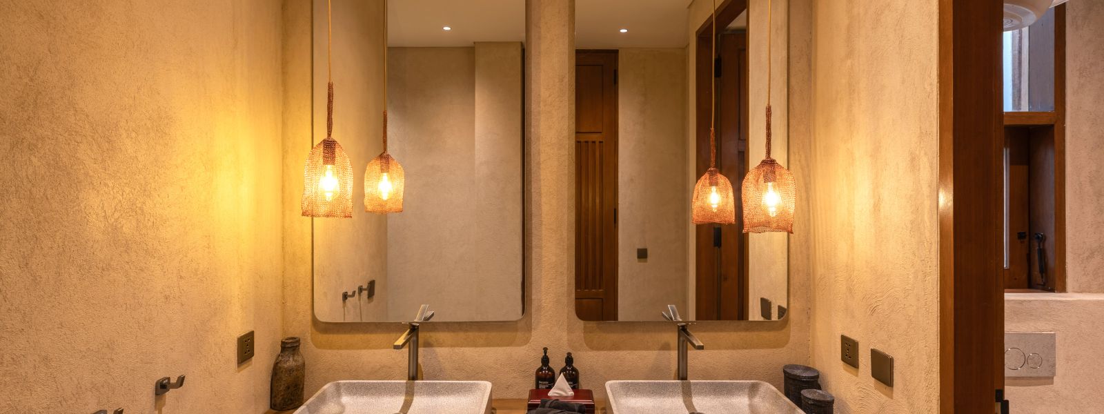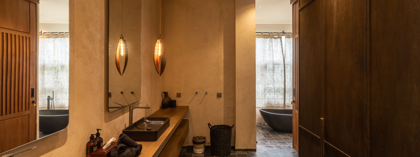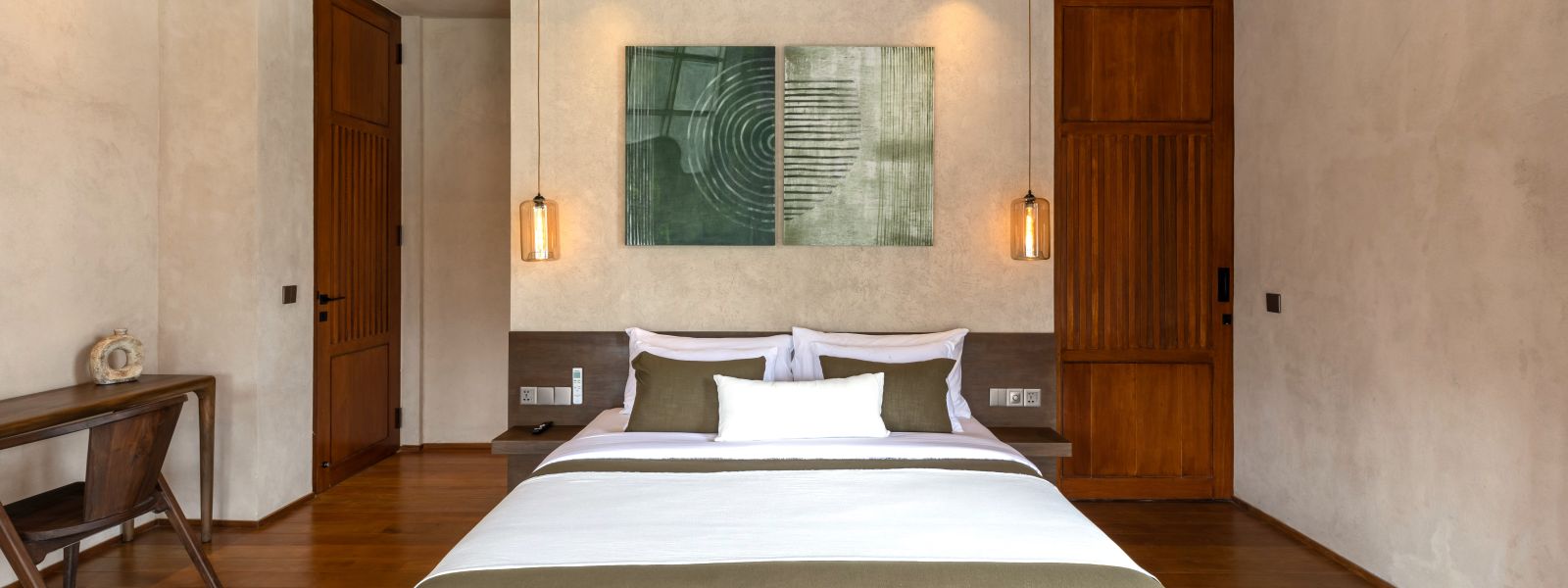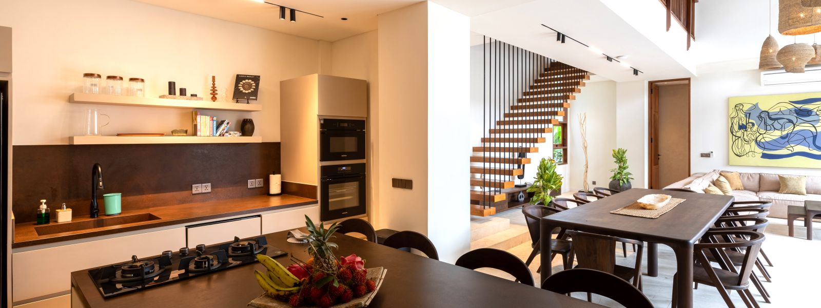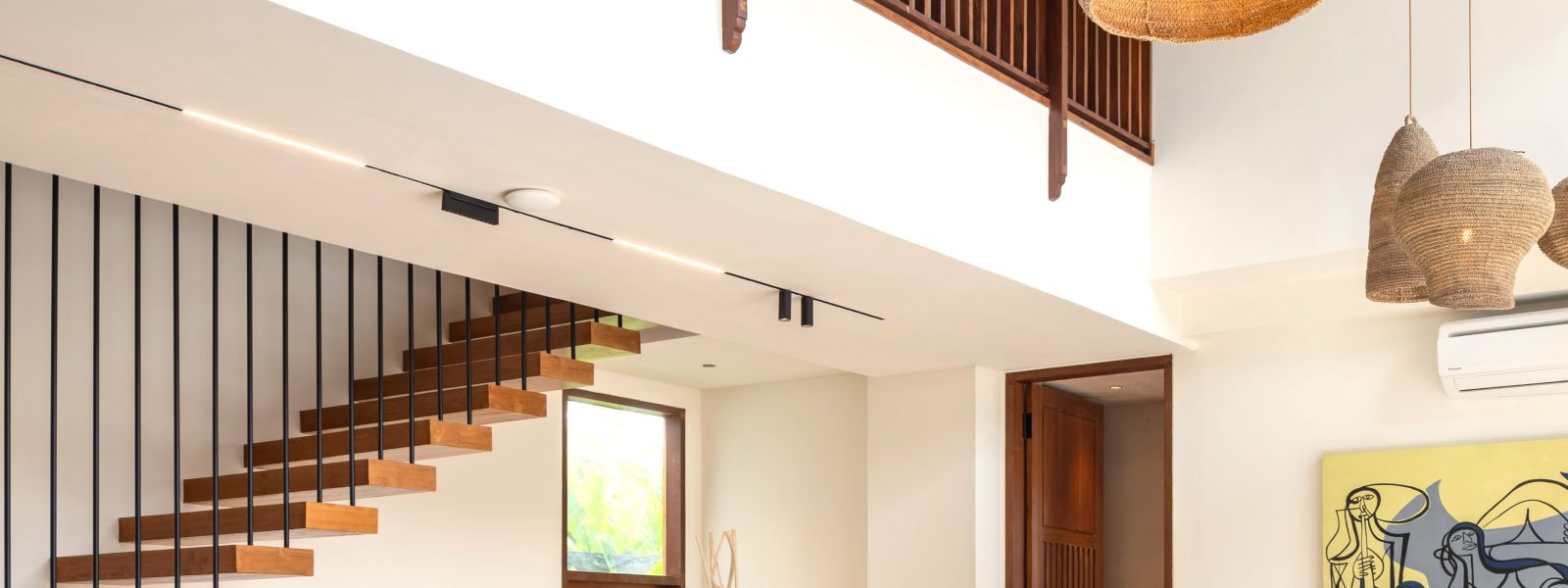 The open-plan living space integrates lounge and dining areas with clarity and flow, enhanced by carefully selected lighting and clean architectural lines. Each of the six bedrooms is conceived as a private retreat, offering generous proportions, garden or pool views, and a hotel-level sense of comfort. Upstairs, private balconies overlook the courtyard, reinforcing openness while maintaining privacy.