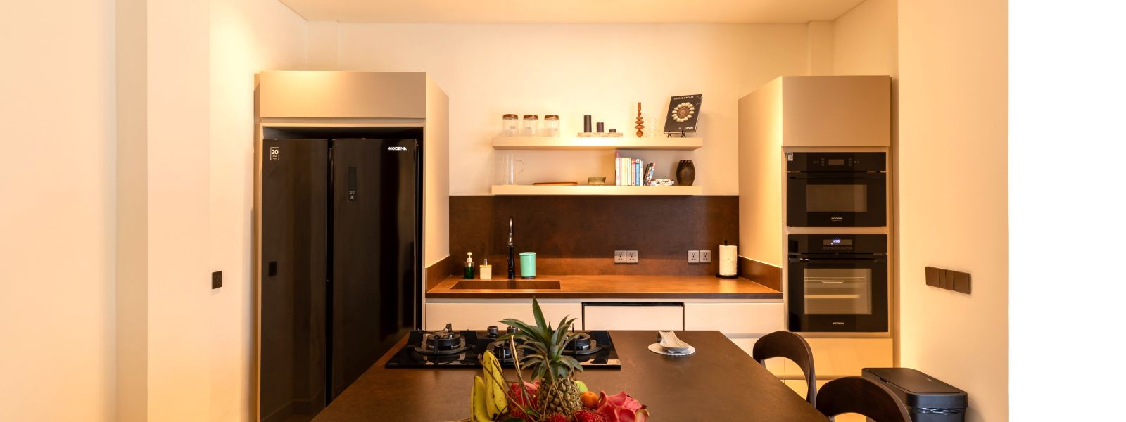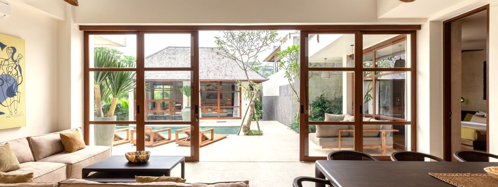 The architecture emphasizes space, light, and proportion. Double-height ceilings, expansive glass panels, and warm timber framing allow the living areas to open fully toward the pool and garden, softening the boundary between inside and out. Natural materials, stone flooring, wood accents, and neutral tones create a calm, timeless atmosphere with a sense of understated luxury.