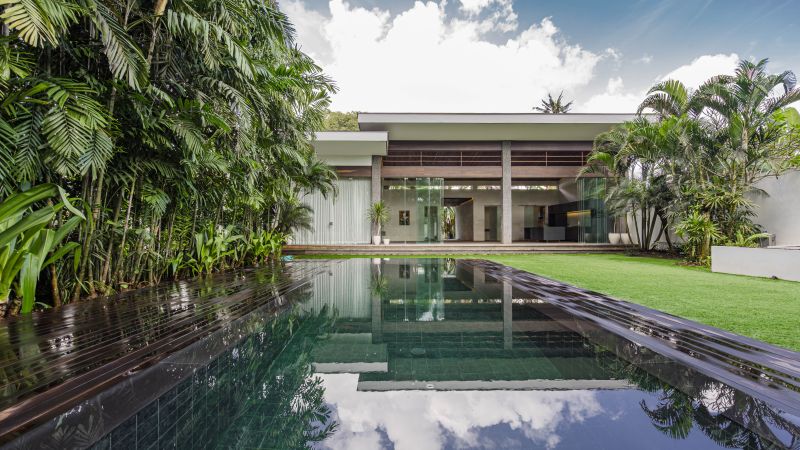 This breathtaking space, designed by an up-and-coming local architect, Casa Studio, features the beauty of raw concrete, live-edge wood, and stainless steel harmoniously blended with lush jungle views.