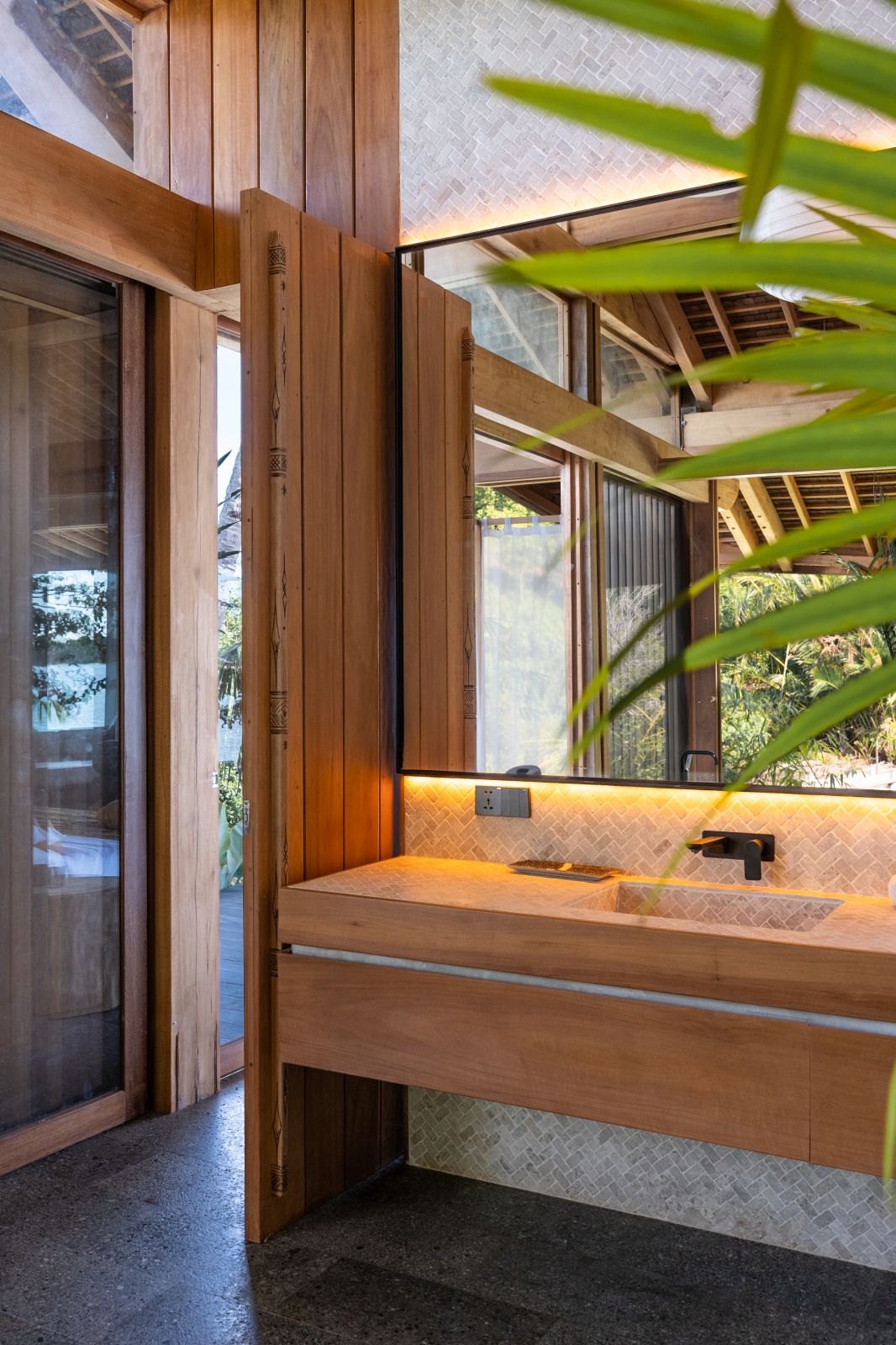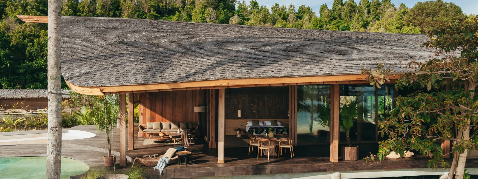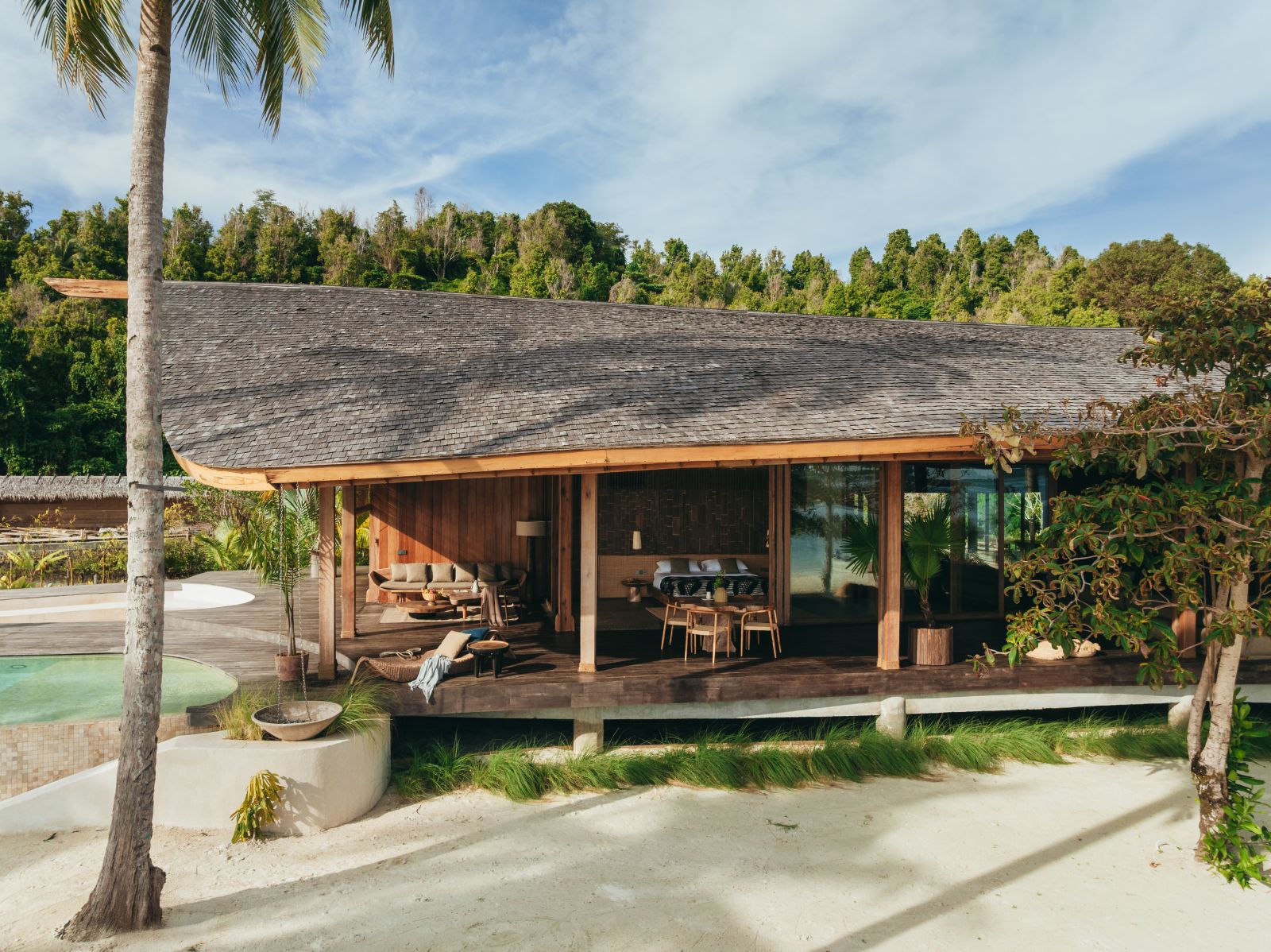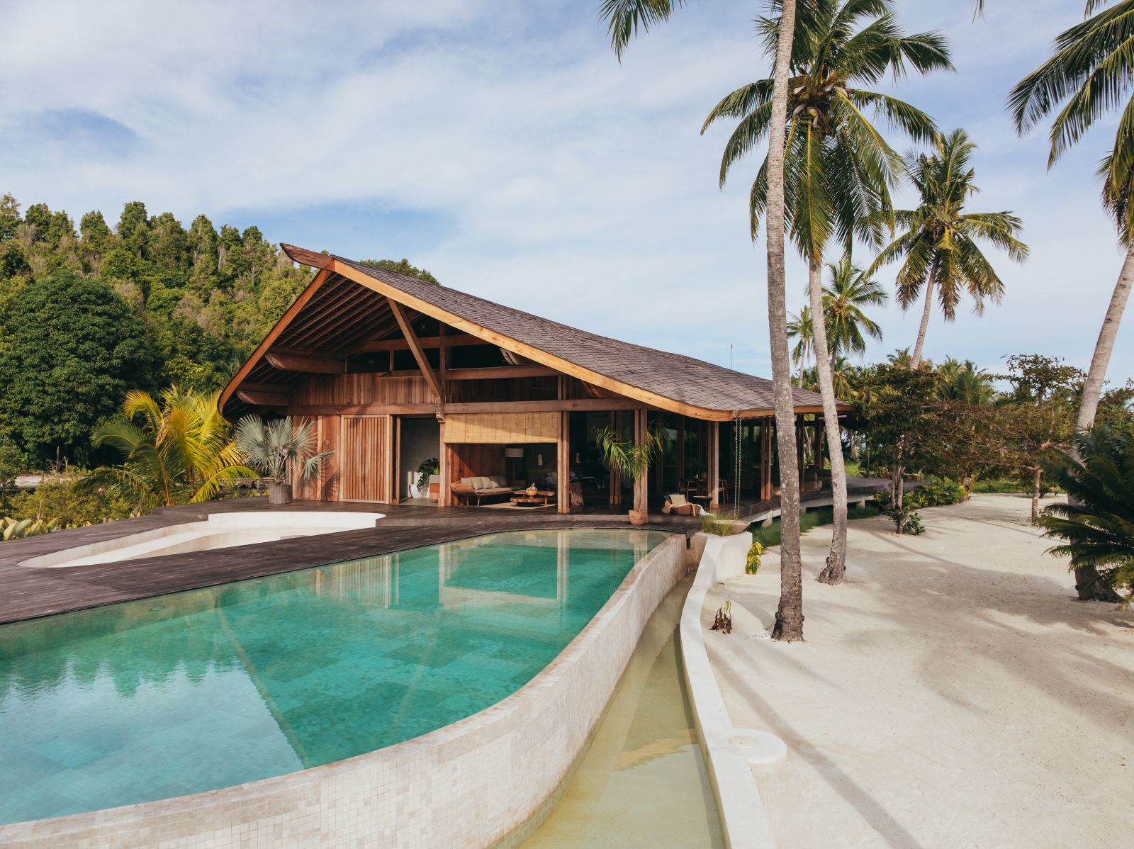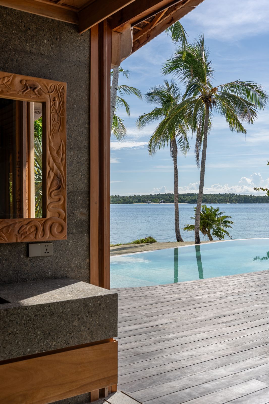 It showcases a unique design integrating Mentawai culture, featuring a distinctive roof miming traditional Mentawai boats. Crafted with the finest natural materials, including locally sourced stone, hardwoods, and an ironwood deck, this residence reflects a commitment to sustainability and elegance. The pool, adorned with exquisite marble mosaic, adds a touch of sophistication to the outdoor space.