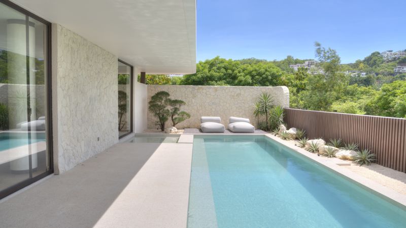 The house features a 25m infinity lap pool with an outdoor sunken lounge and bar, offering in-pool seating and stunning sea views. There’s direct beach access via a private staircase and a covered outdoor seating area not visible in the pictures but shown on the floor plans, located to the right of the pool under the house's overhang.