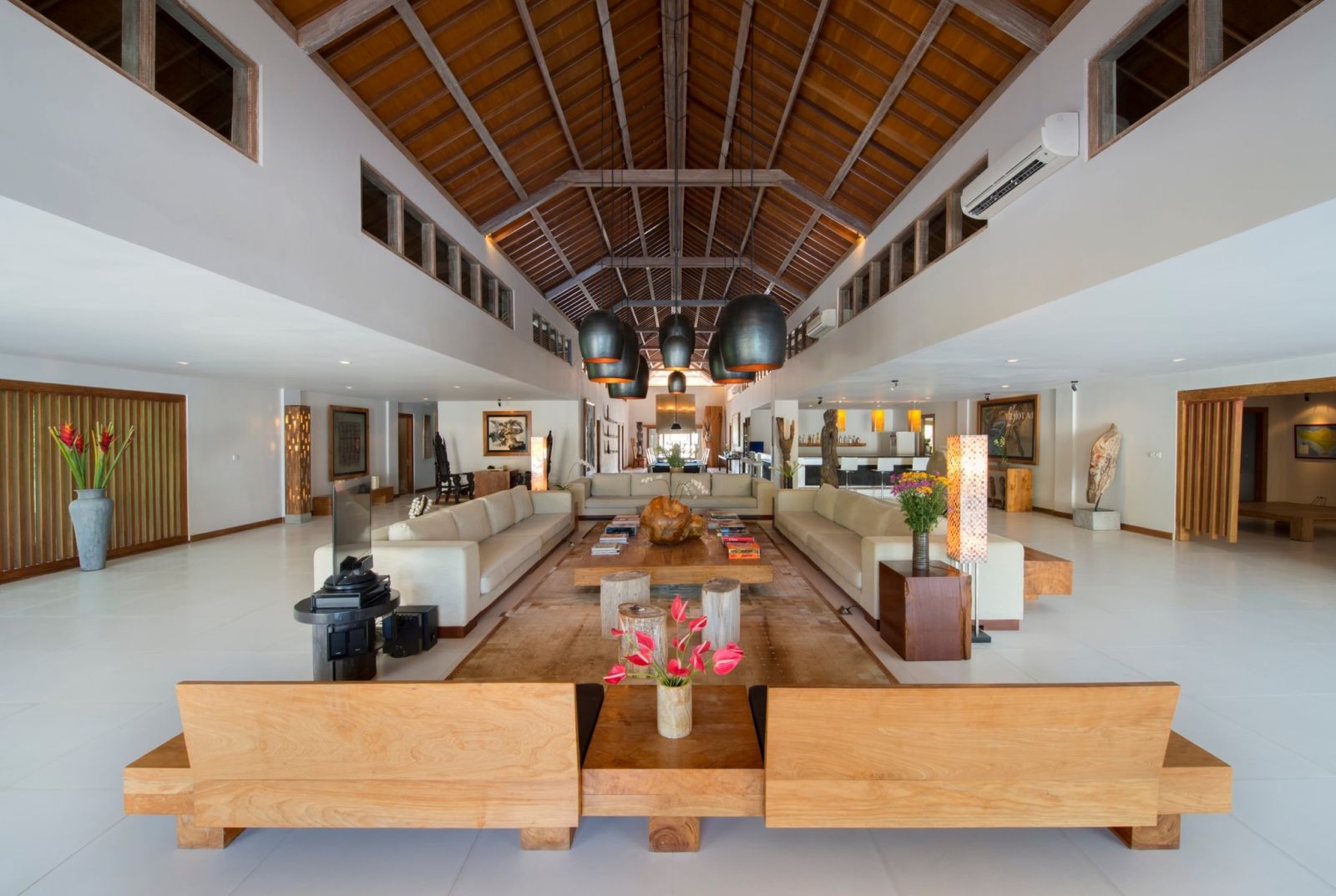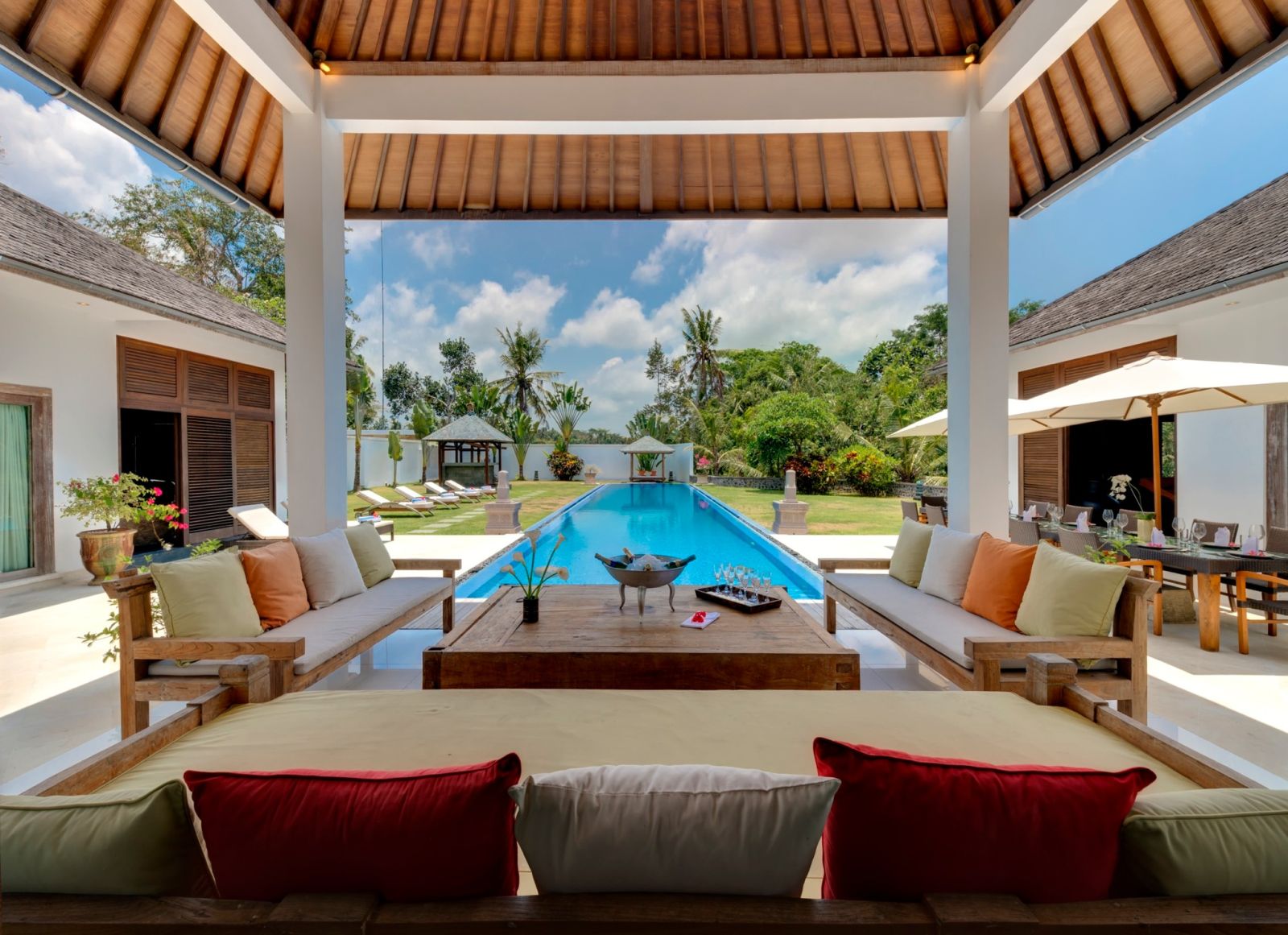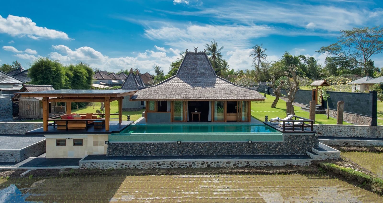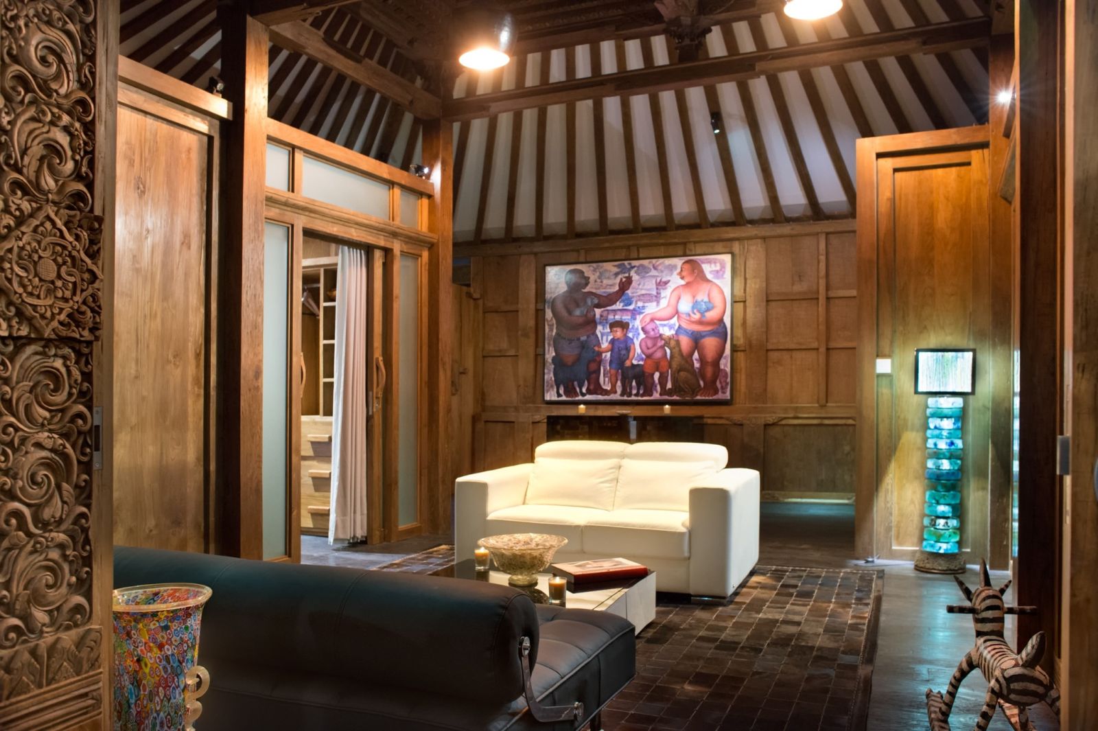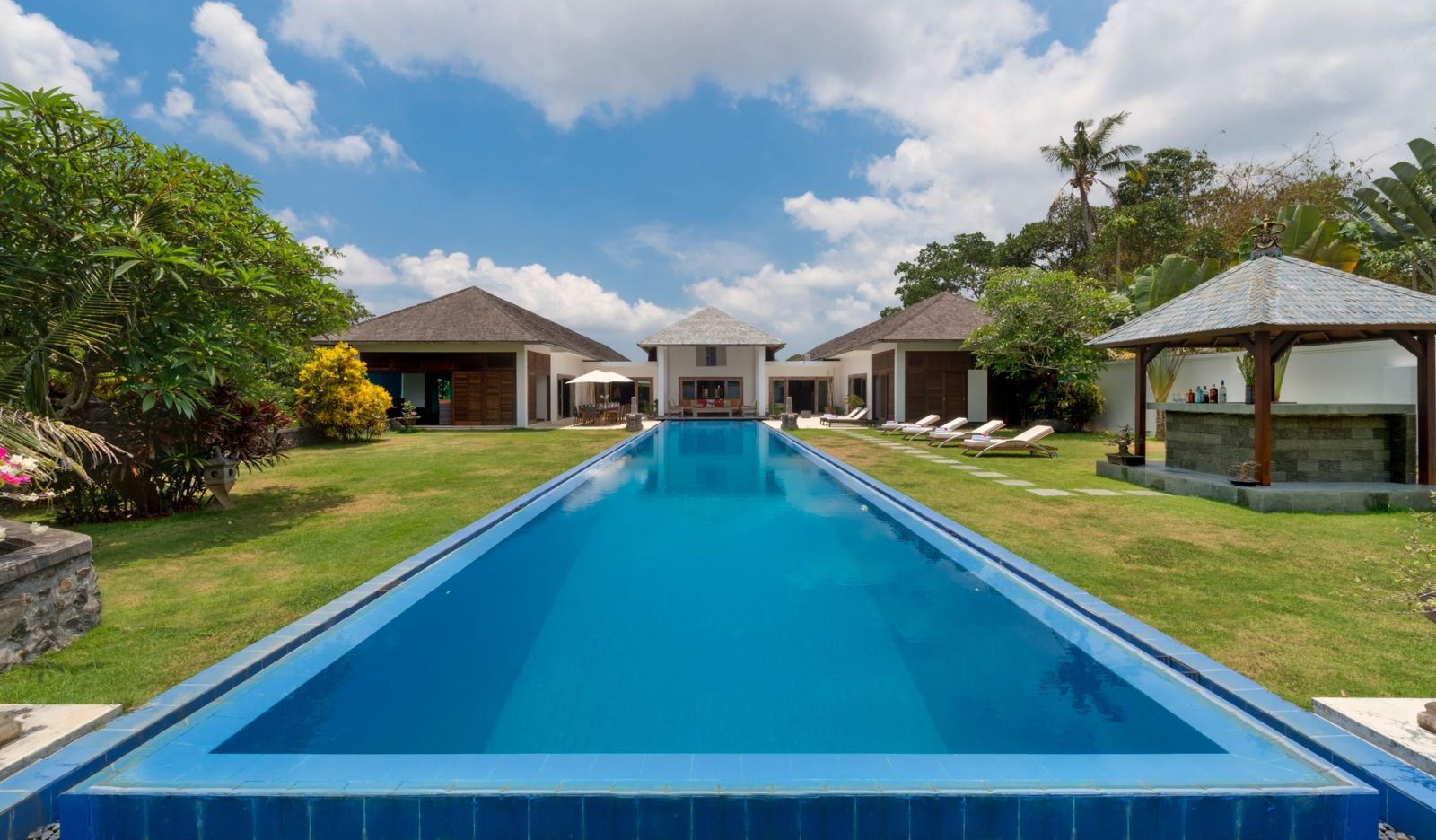 The single-level main villa is designed for both comfort and grandeur. It offers two master suites, five guest bedrooms, a large reception, a living area with antique Joglo pavilion, a cinema, and a chef’s kitchen with bar and 14-seater solid teak dining table. The master suites include walk-in wardrobes and spa-inspired bathrooms with Grohe Porsche Design fittings and Jacuzzi by Teuco, while the guest bedrooms come with balconies, dressing rooms, and ensuite bathrooms with Kohler Jacuzzis.