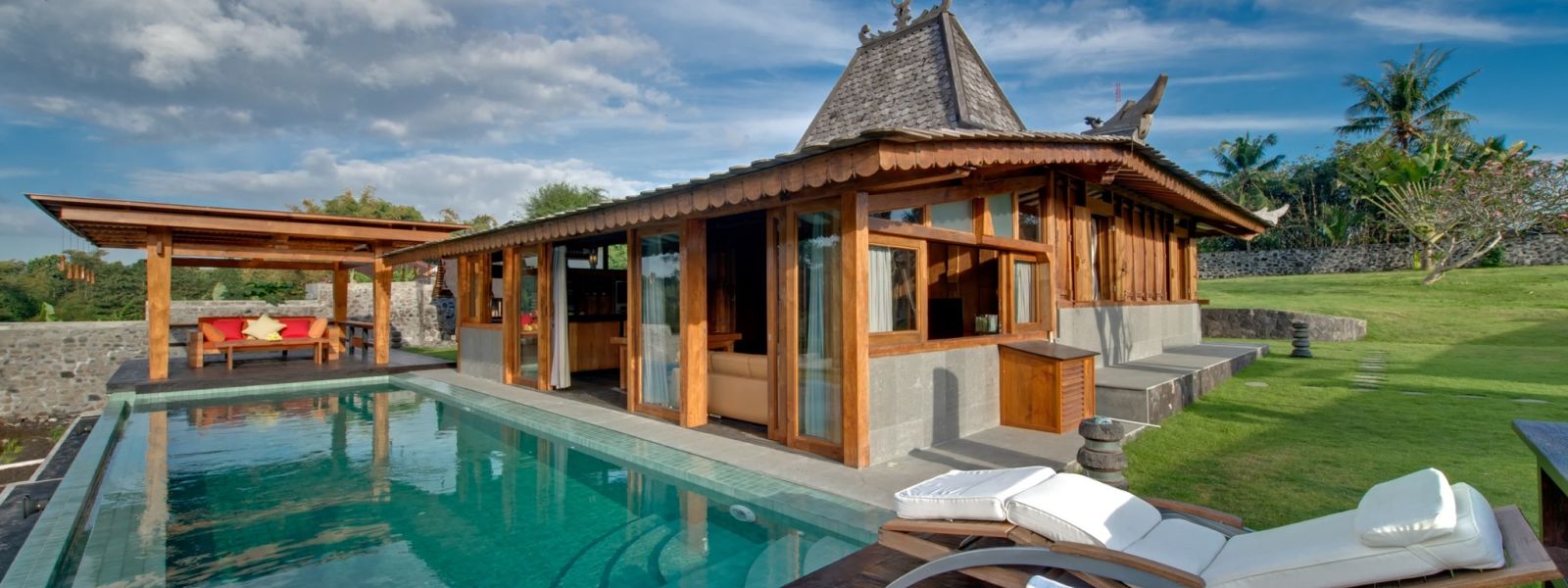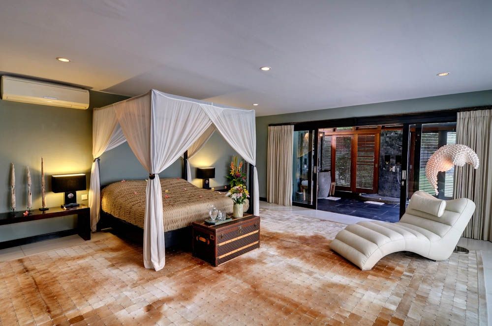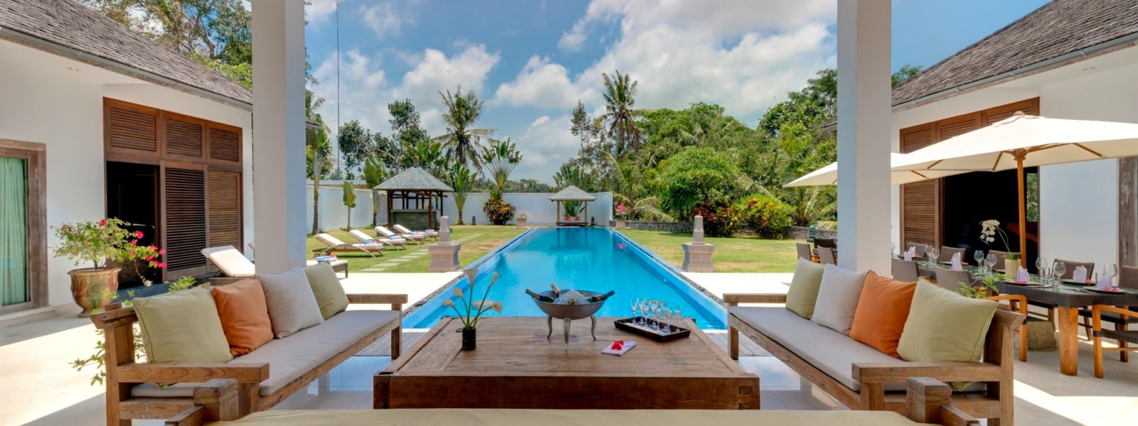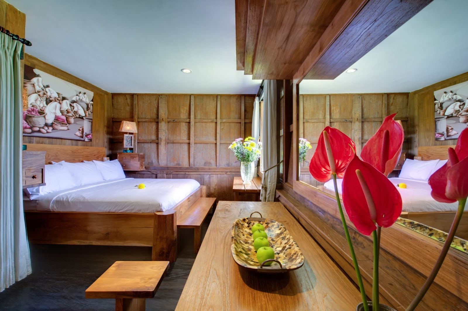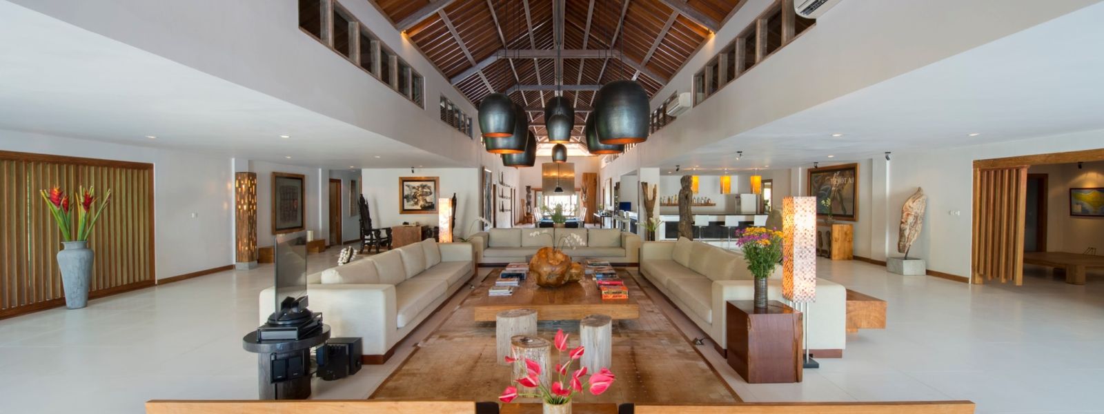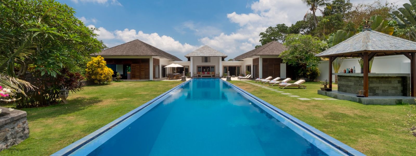 The single-level main villa is designed for both comfort and grandeur. It offers two master suites, five guest bedrooms, a large reception, a living area with antique Joglo pavilion, a cinema, and a chef’s kitchen with bar and 14-seater solid teak dining table. The master suites include walk-in wardrobes and spa-inspired bathrooms with Grohe Porsche Design fittings and Jacuzzi by Teuco, while the guest bedrooms come with balconies, dressing rooms, and ensuite bathrooms with Kohler Jacuzzis.