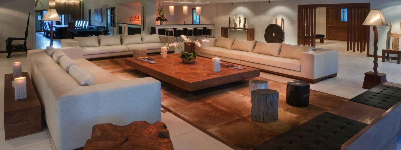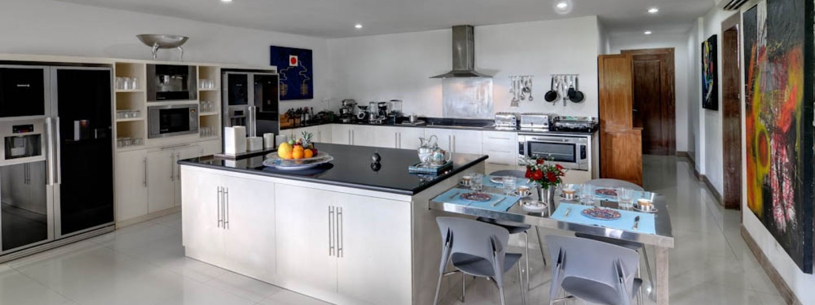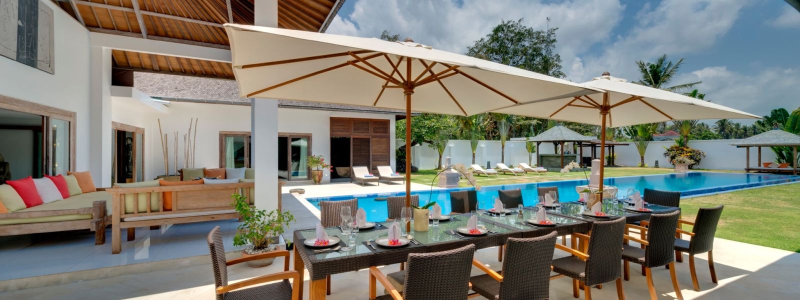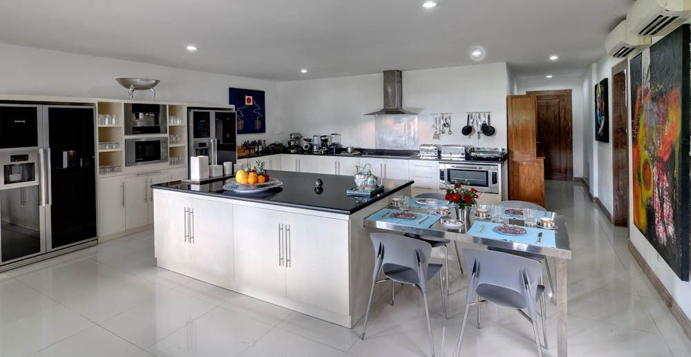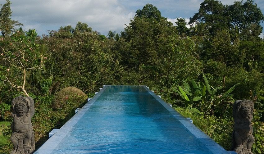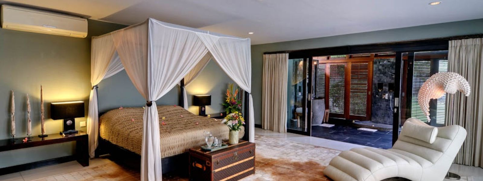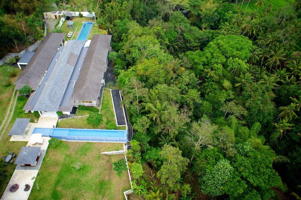 The single-level main villa is designed for both comfort and grandeur. It offers two master suites, five guest bedrooms, a large reception, a living area with antique Joglo pavilion, a cinema, and a chef’s kitchen with bar and 14-seater solid teak dining table. The master suites include walk-in wardrobes and spa-inspired bathrooms with Grohe Porsche Design fittings and Jacuzzi by Teuco, while the guest bedrooms come with balconies, dressing rooms, and ensuite bathrooms with Kohler Jacuzzis.