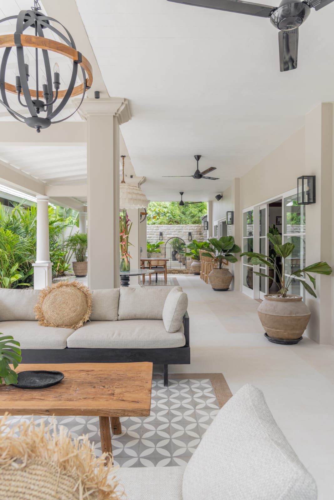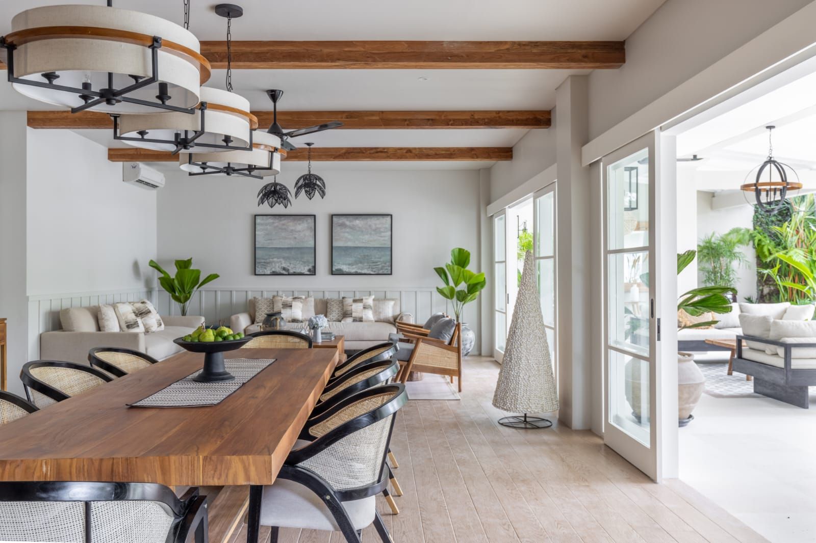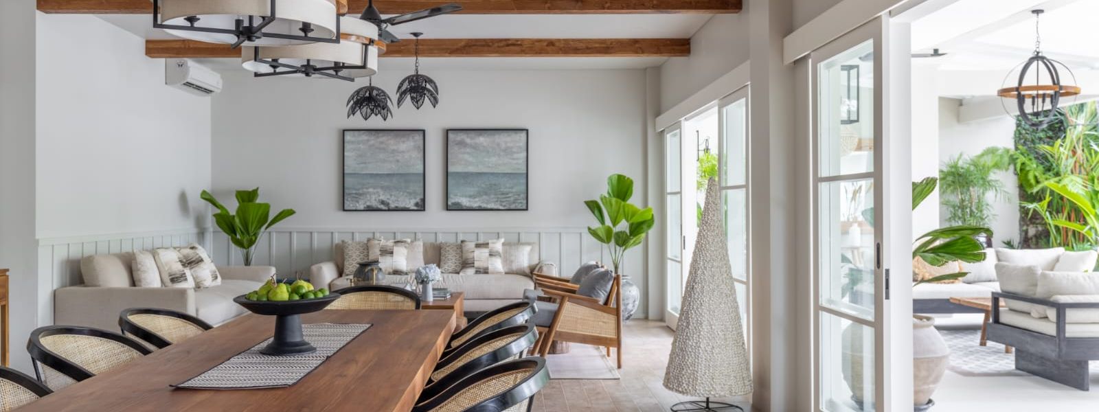 Upon entering, you'll find an open-air living area that connects you with nature. The air-conditioned kitchen and dining area are adjacent to the outdoor living. The design combines Coastal elements with modern comforts, allowing natural light to flow in. The enclosed living areas feature a fully-equipped kitchen, a rectangular dining table for 8, and a cozy entertainment area. Air conditioning and ceiling fans ensure comfort throughout. Outside, the pool area includes lounge seating and an alfresco living space with ceiling fans. The garden is small yet convenient, making this villa an ideal relaxing holiday retreat, including massages or yoga sessions outdoors.