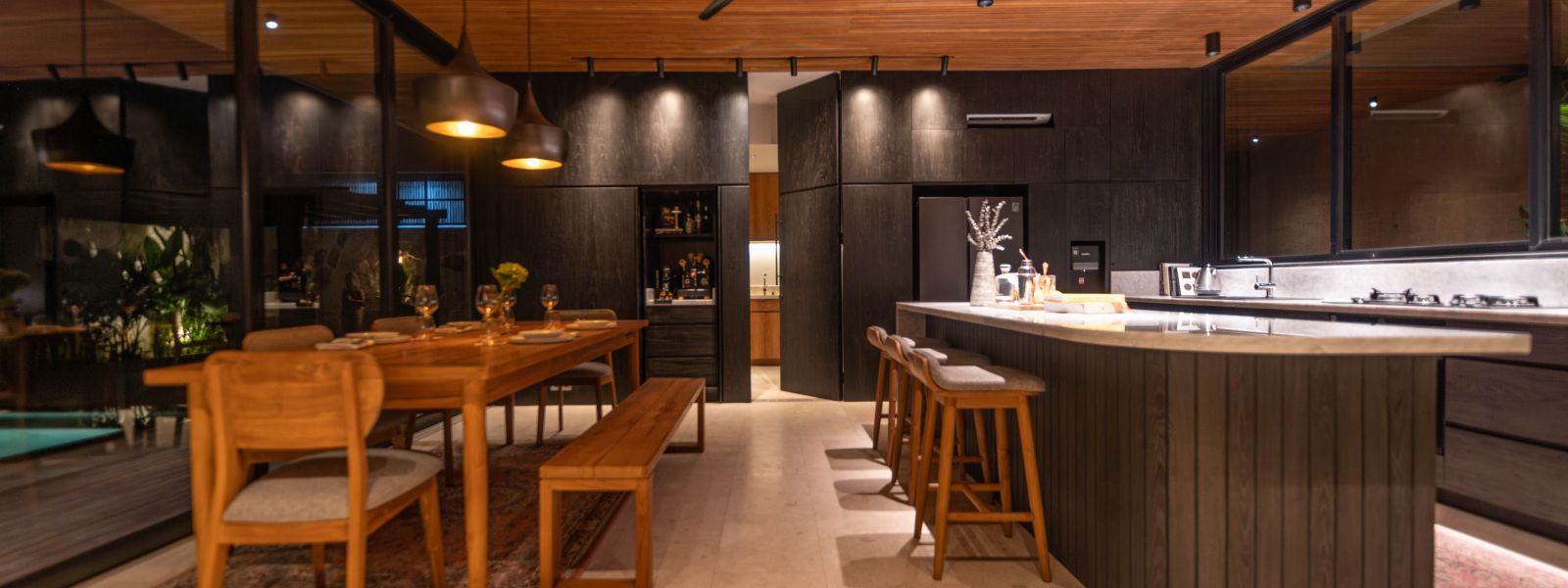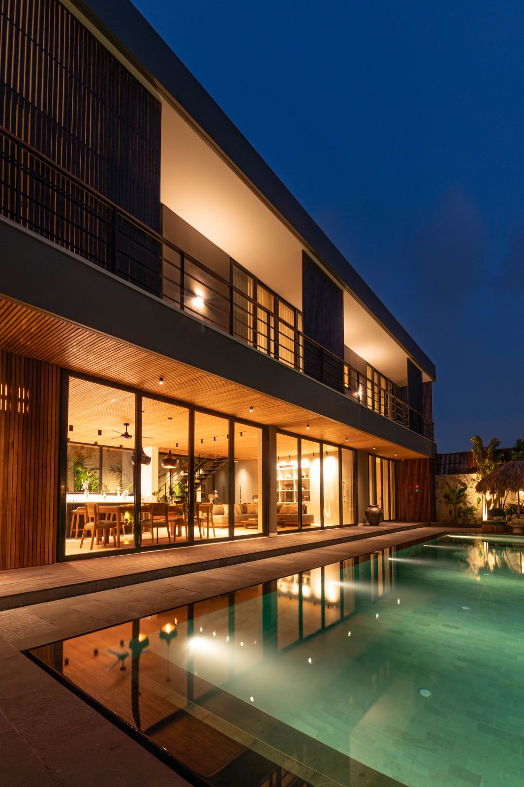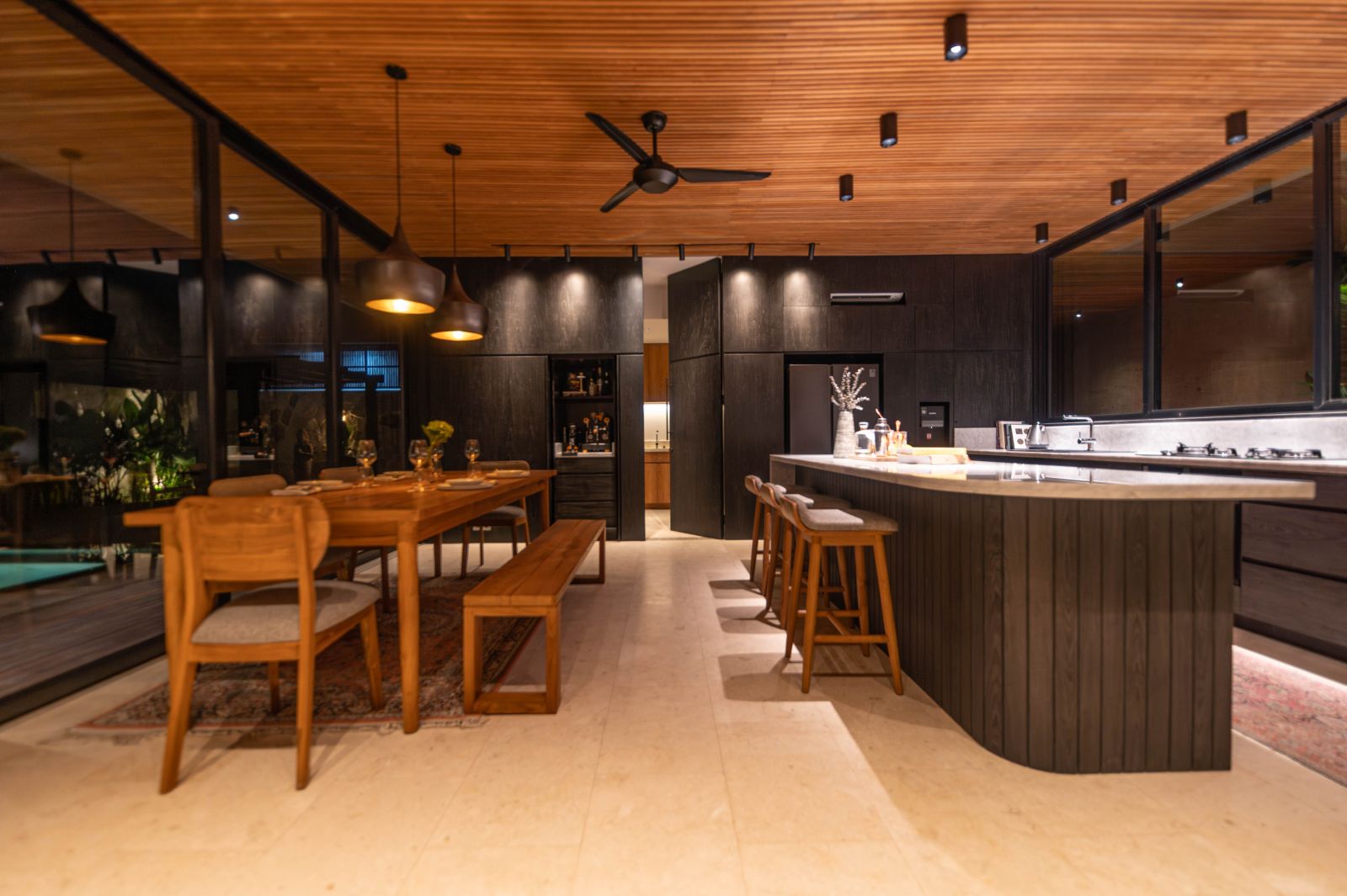 The ground floor offers spacious, fully air-conditioned living and dining areas, dry kitchen, a large butler’s pantry, a TV room, laundry, guest toilet, and a generous bedroom with ensuite facing the 12.5-meter saltwater pool. The pool features a striking 360° knife-edge design, complemented by an inviting outdoor dining area and parking for multiple cars.