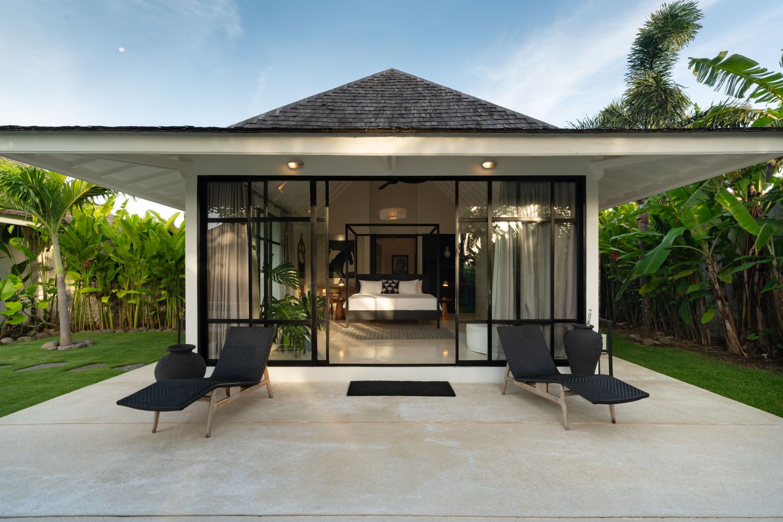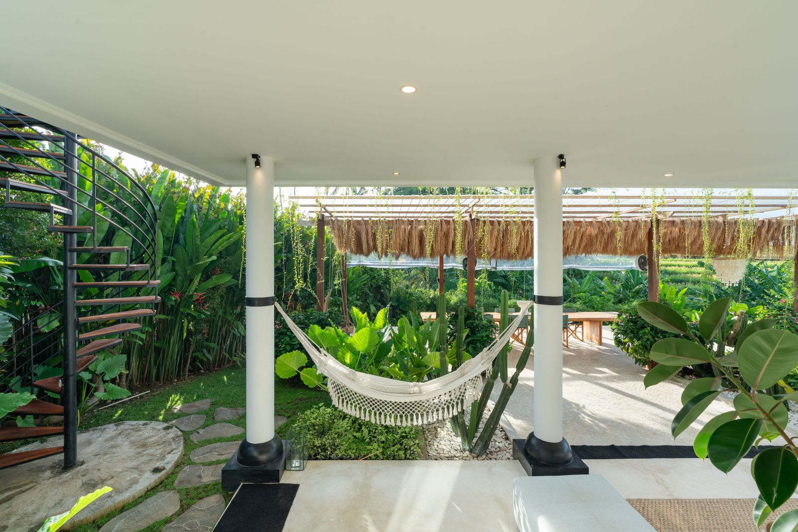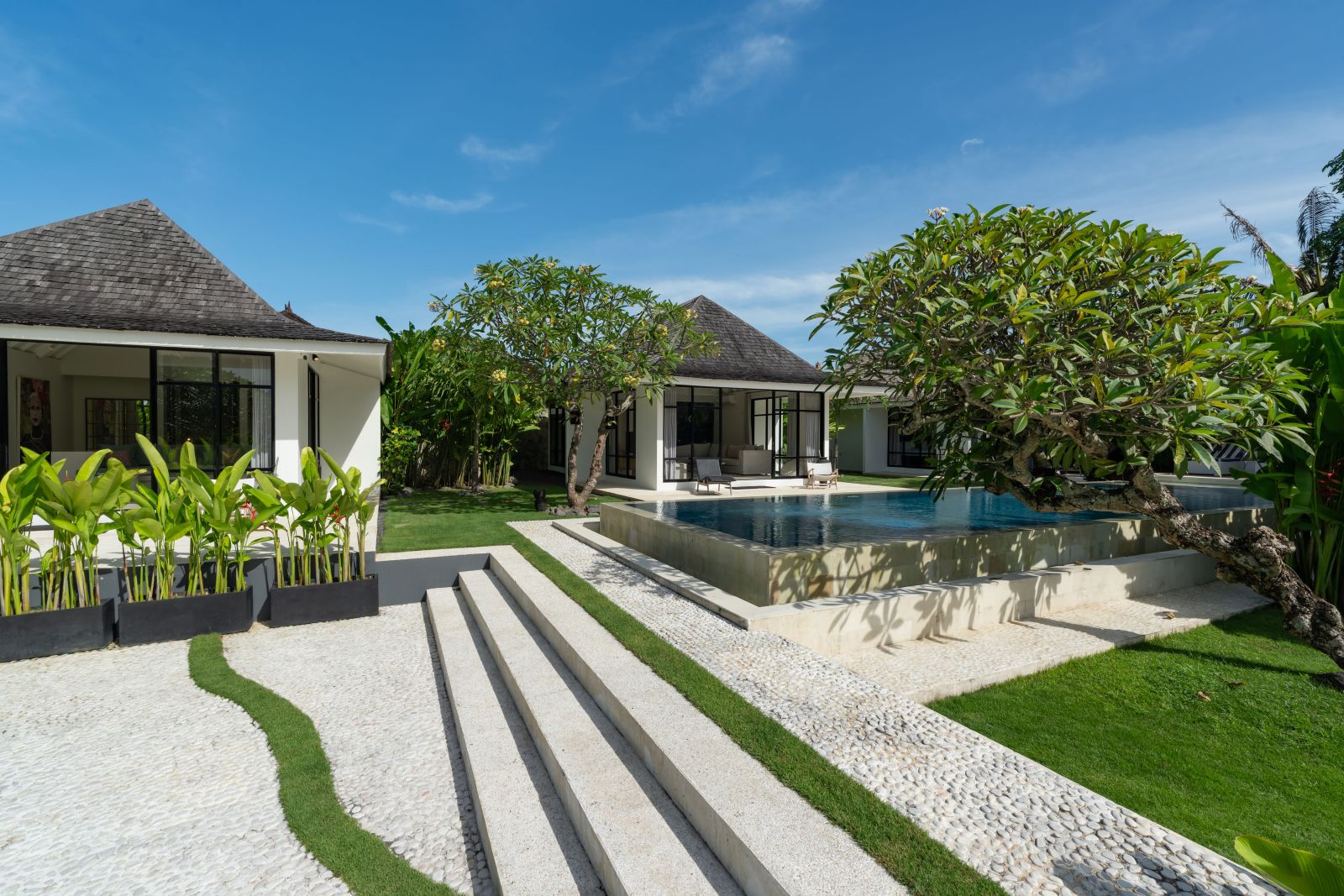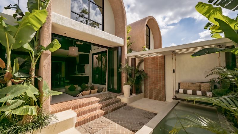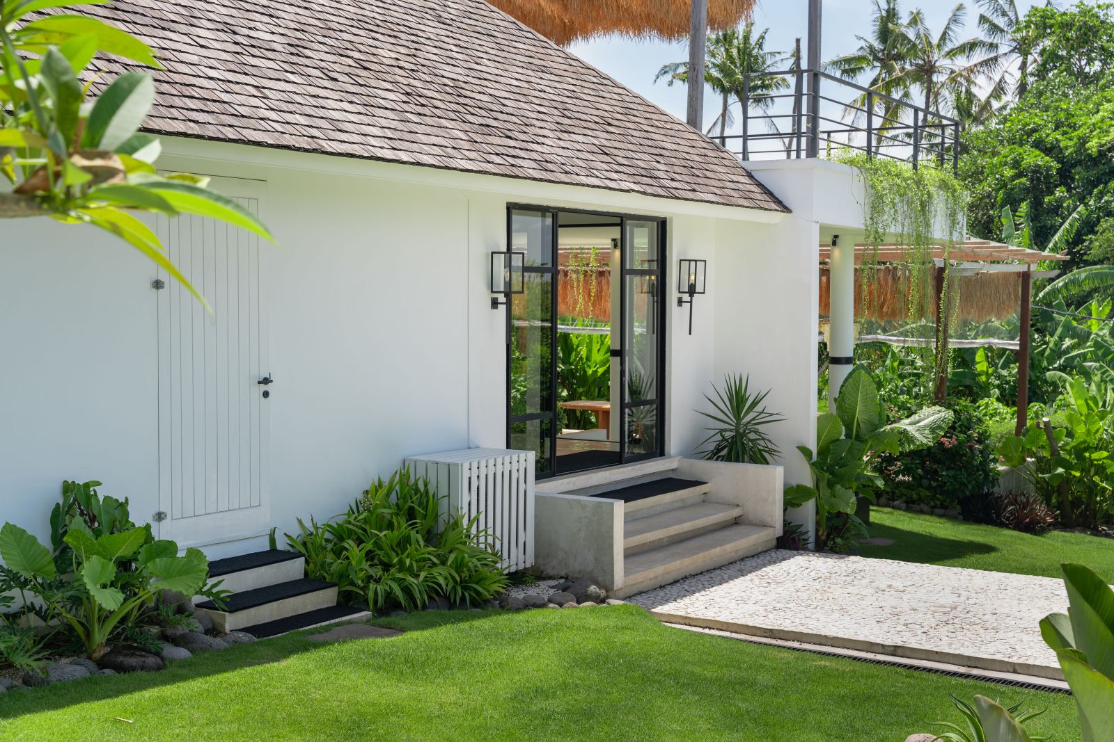 The property is thoughtfully composed with a main house featuring the living, dining, and kitchen areas, along with 2 bedrooms and a rooftop terrace designed to take in the lush surroundings and open views. Complementing the main residence are 3 expansive ensuite bedroom pavilions, each positioned independently to offer exceptional privacy and comfort, complete with a lounge area and mini bar or kitchenette, creating the feel of three private guest suites.