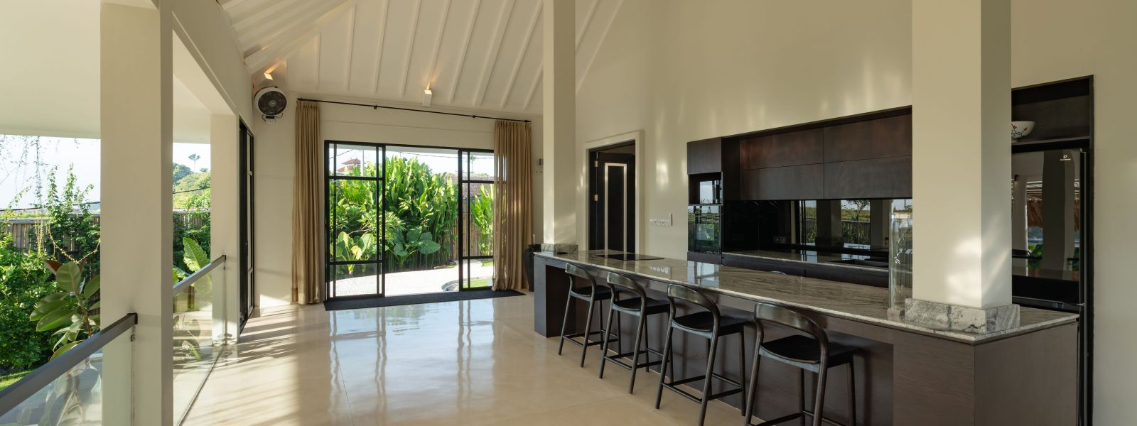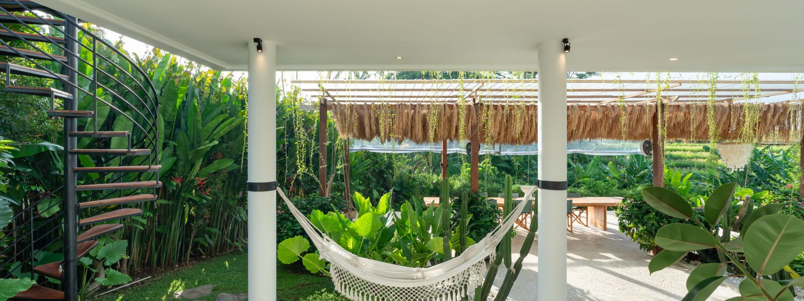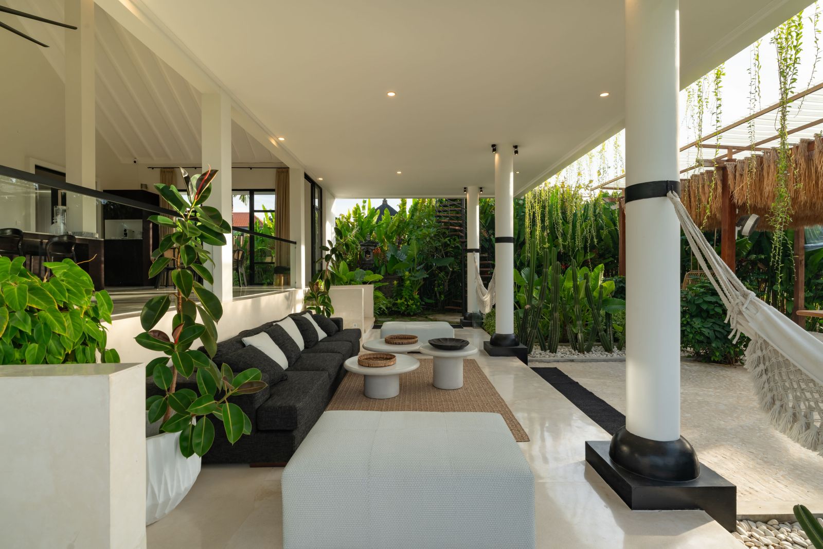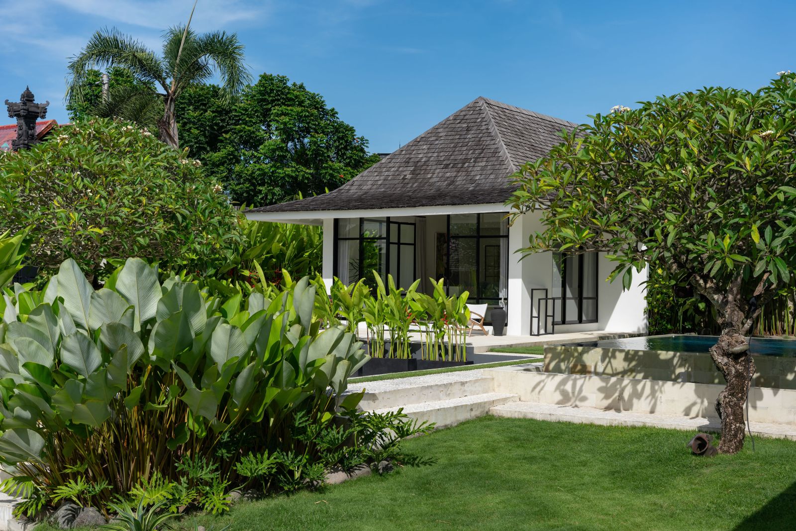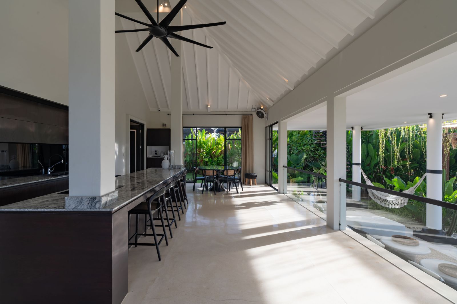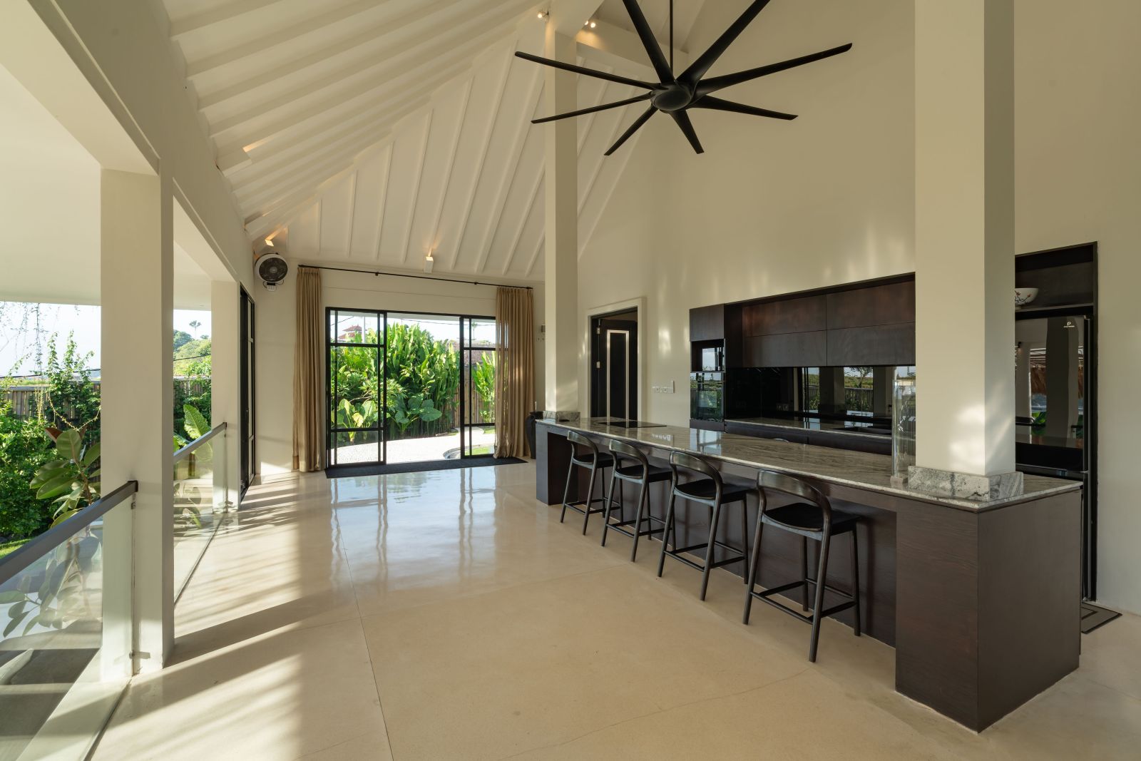 The property is thoughtfully composed with a main house featuring the living, dining, and kitchen areas, along with 2 bedrooms and a rooftop terrace designed to take in the lush surroundings and open views. Complementing the main residence are 3 expansive ensuite bedroom pavilions, each positioned independently to offer exceptional privacy and comfort, complete with a lounge area and mini bar or kitchenette, creating the feel of three private guest suites.