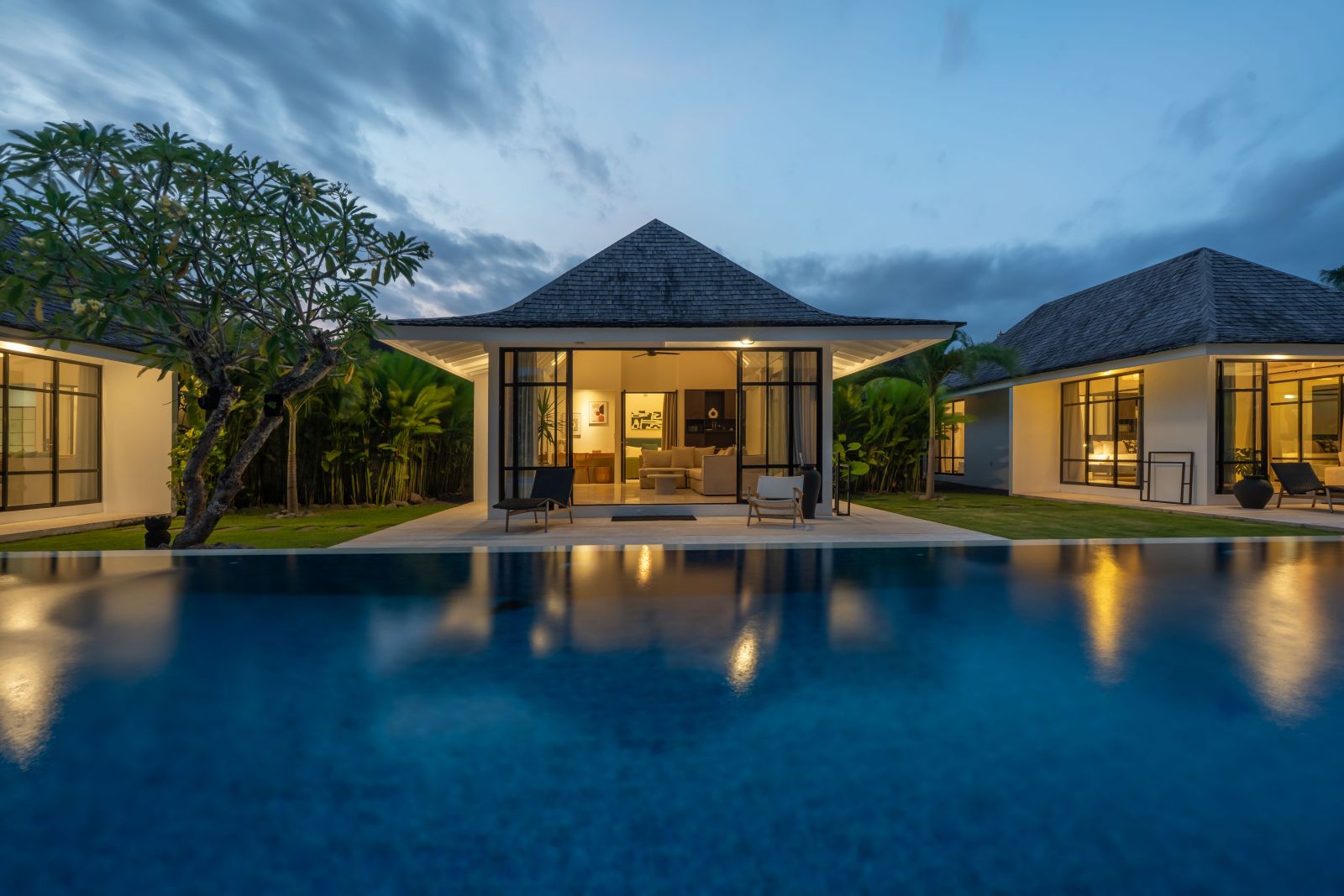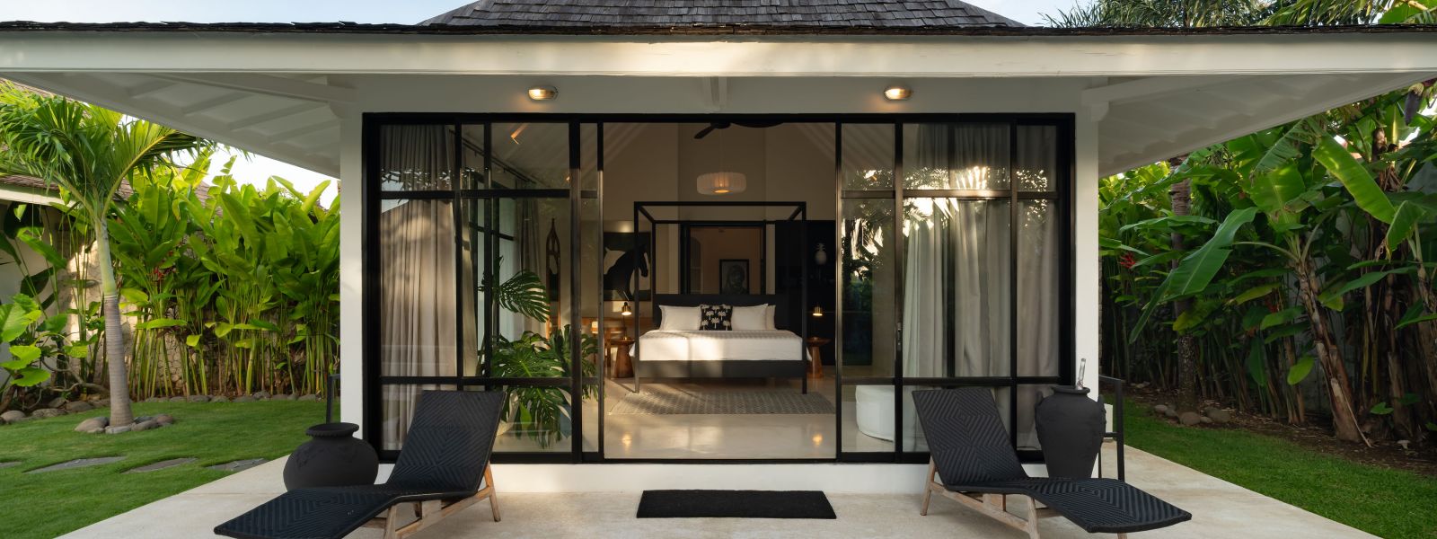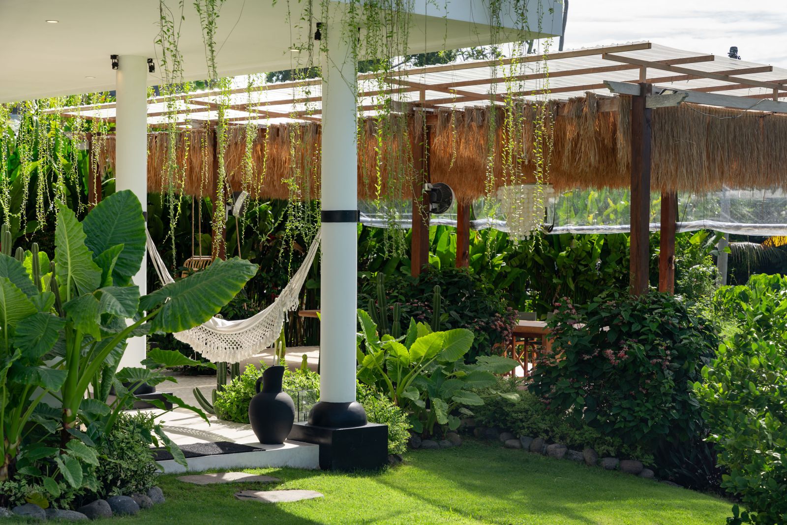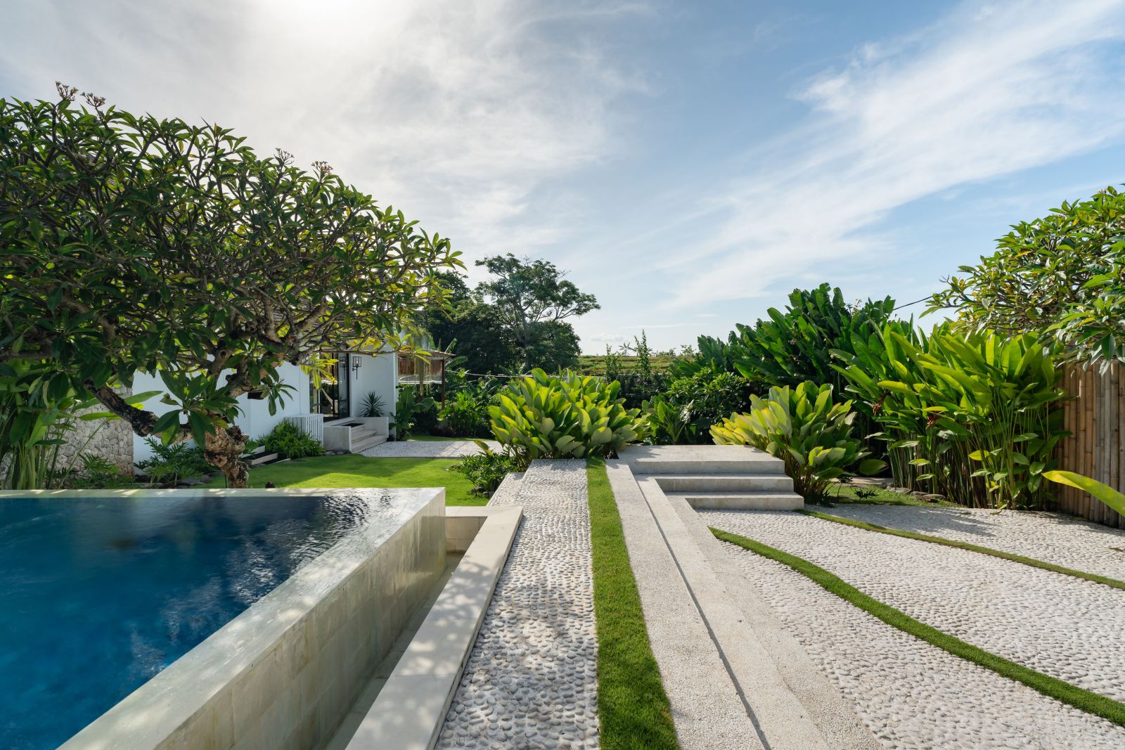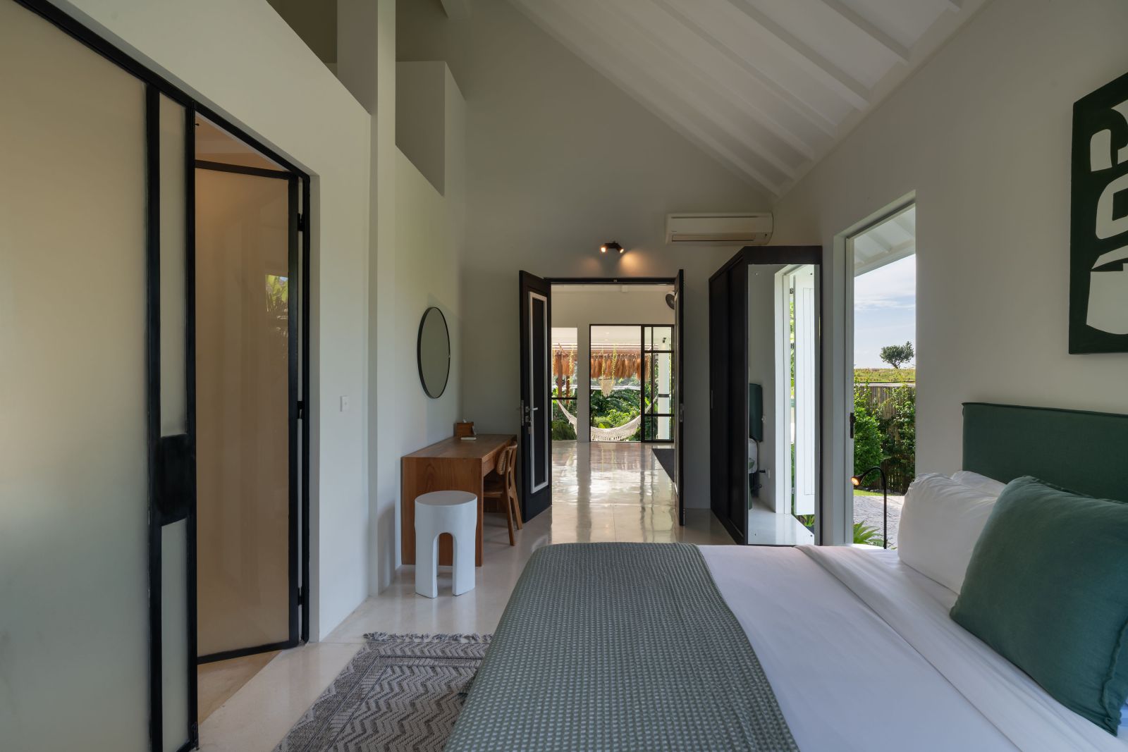 The property is thoughtfully composed with a main house featuring the living, dining, and kitchen areas, along with 2 bedrooms and a rooftop terrace designed to take in the lush surroundings and open views. Complementing the main residence are 3 expansive ensuite bedroom pavilions, each positioned independently to offer exceptional privacy and comfort, complete with a lounge area and mini bar or kitchenette, creating the feel of three private guest suites.