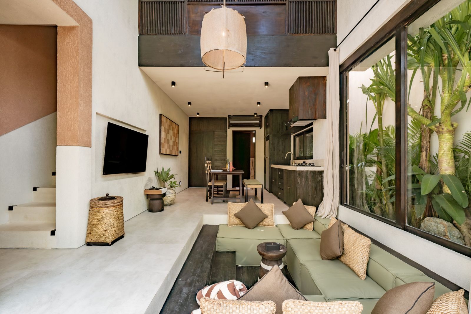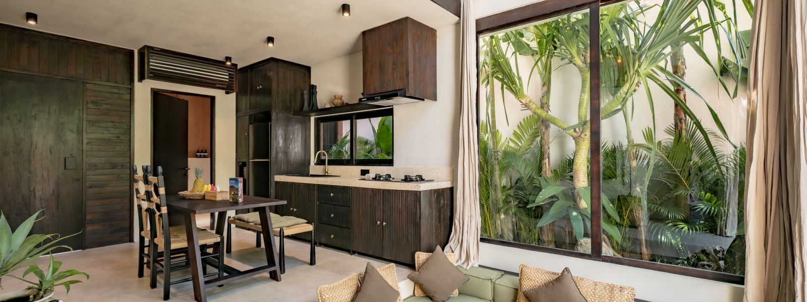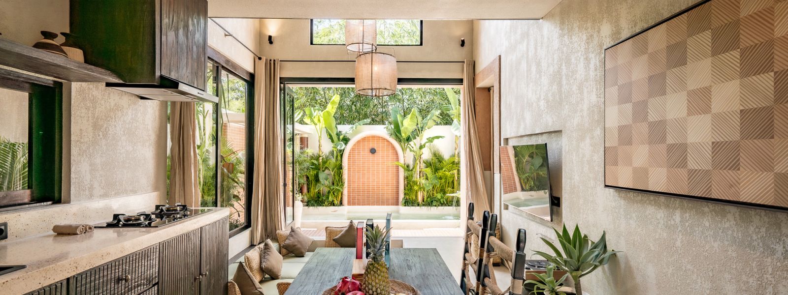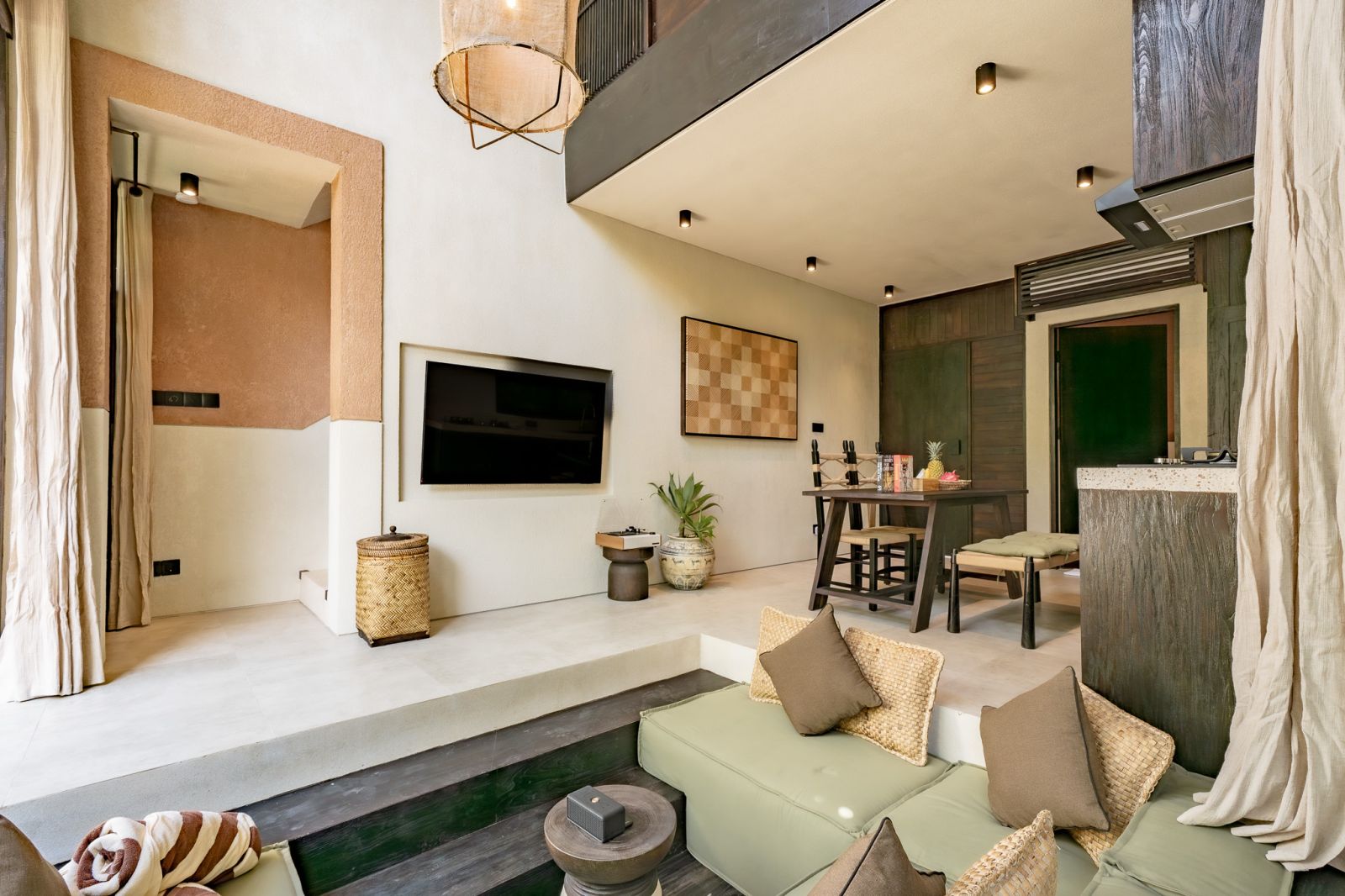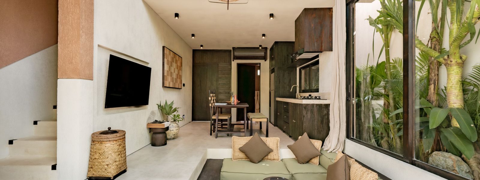 Designed in an Organic Mediterranean style, the loft showcases soft curves, earthy textures, and a calming tropical ambiance throughout. Inside, the space features 1 cozy bedroom, 1 stylish bathroom with a double rain shower, and a thoughtfully arranged kitchen, dining, and enclosed living area that flows seamlessly toward the swimming pool.