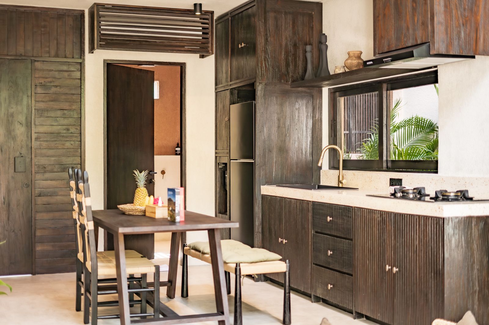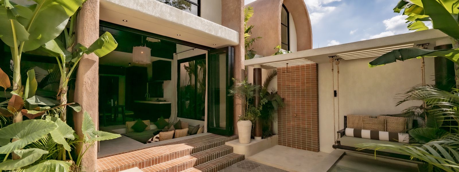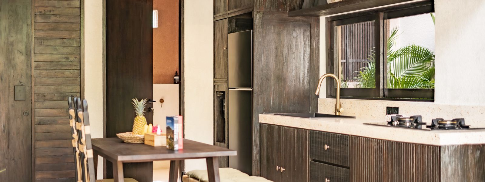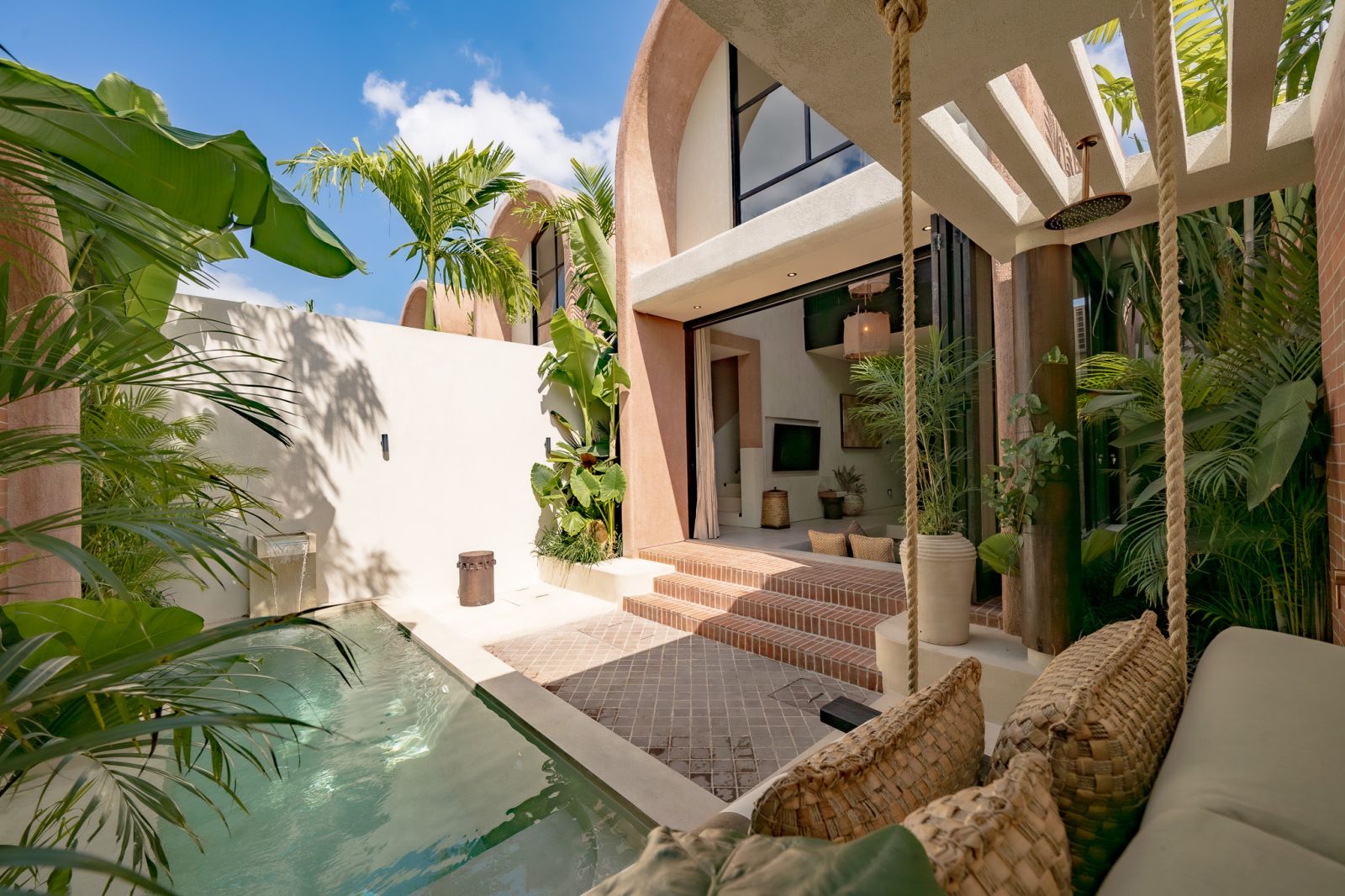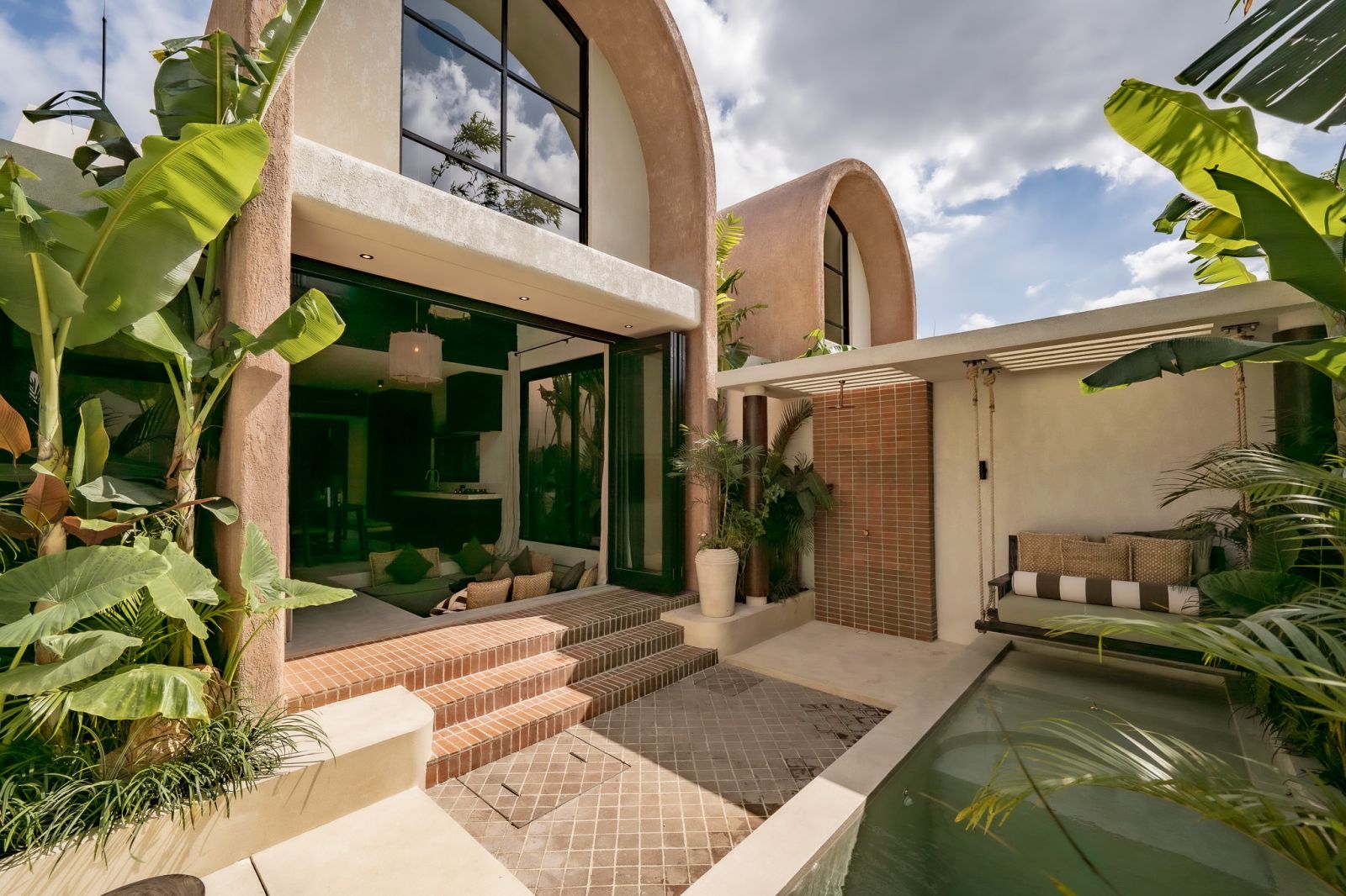 Designed in an Organic Mediterranean style, the loft showcases soft curves, earthy textures, and a calming tropical ambiance throughout. Inside, the space features 1 cozy bedroom, 1 stylish bathroom with a double rain shower, and a thoughtfully arranged kitchen, dining, and enclosed living area that flows seamlessly toward the swimming pool.