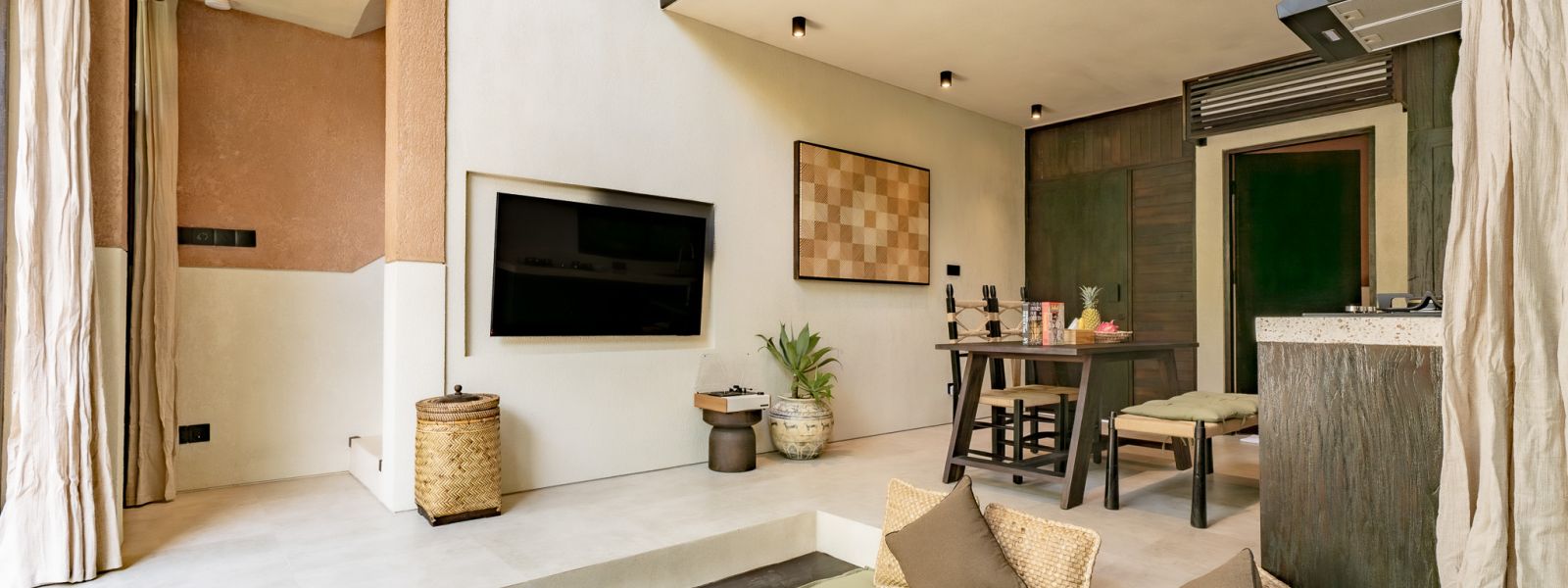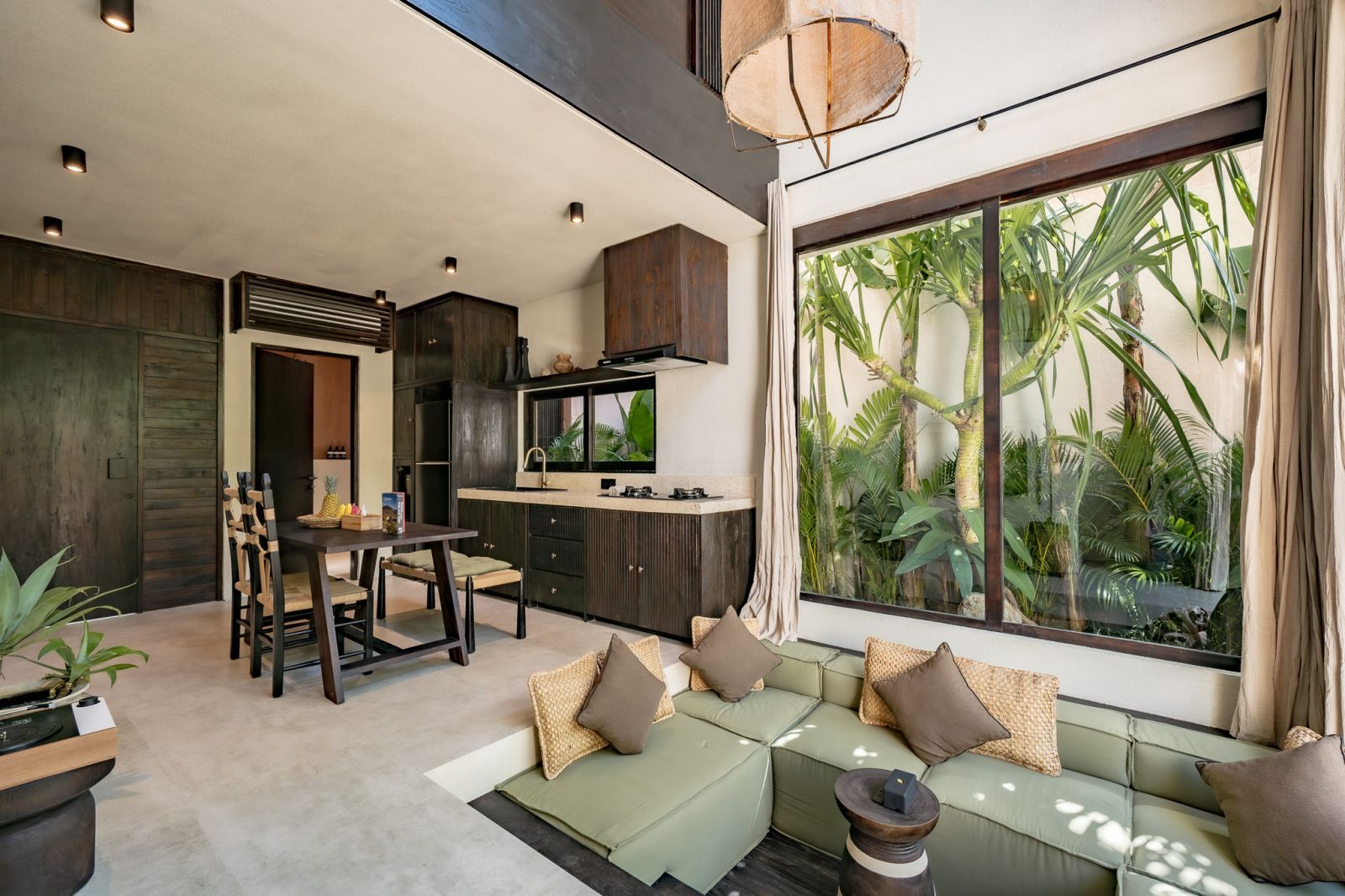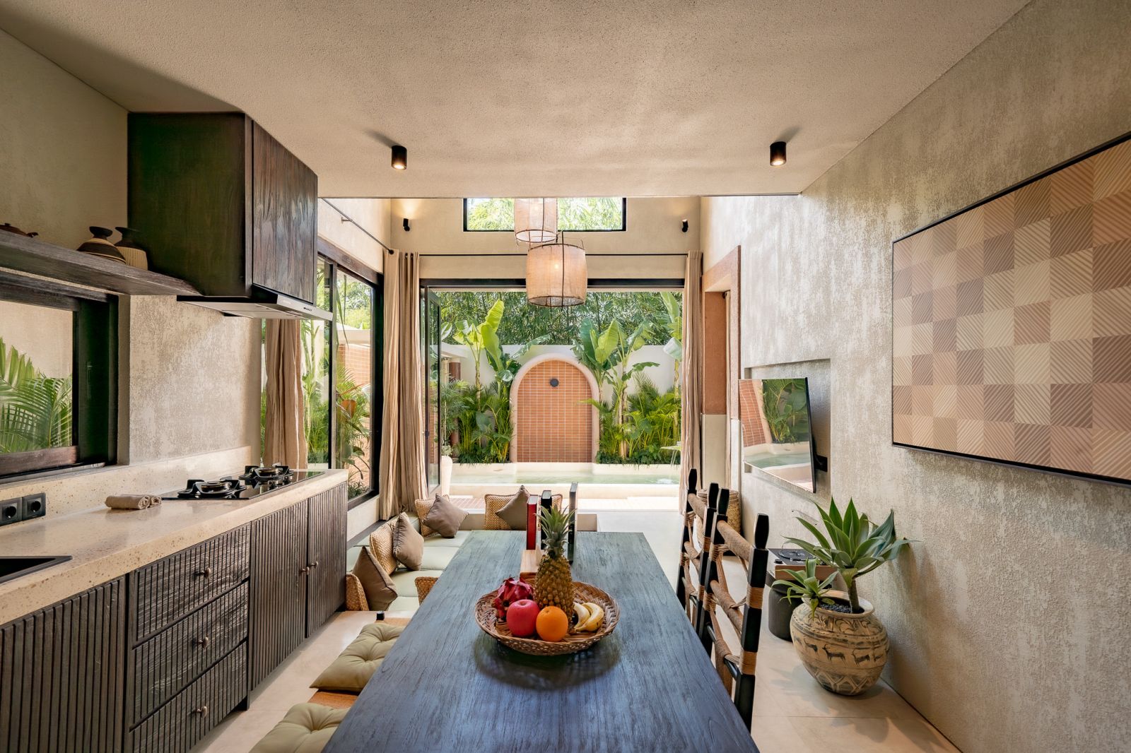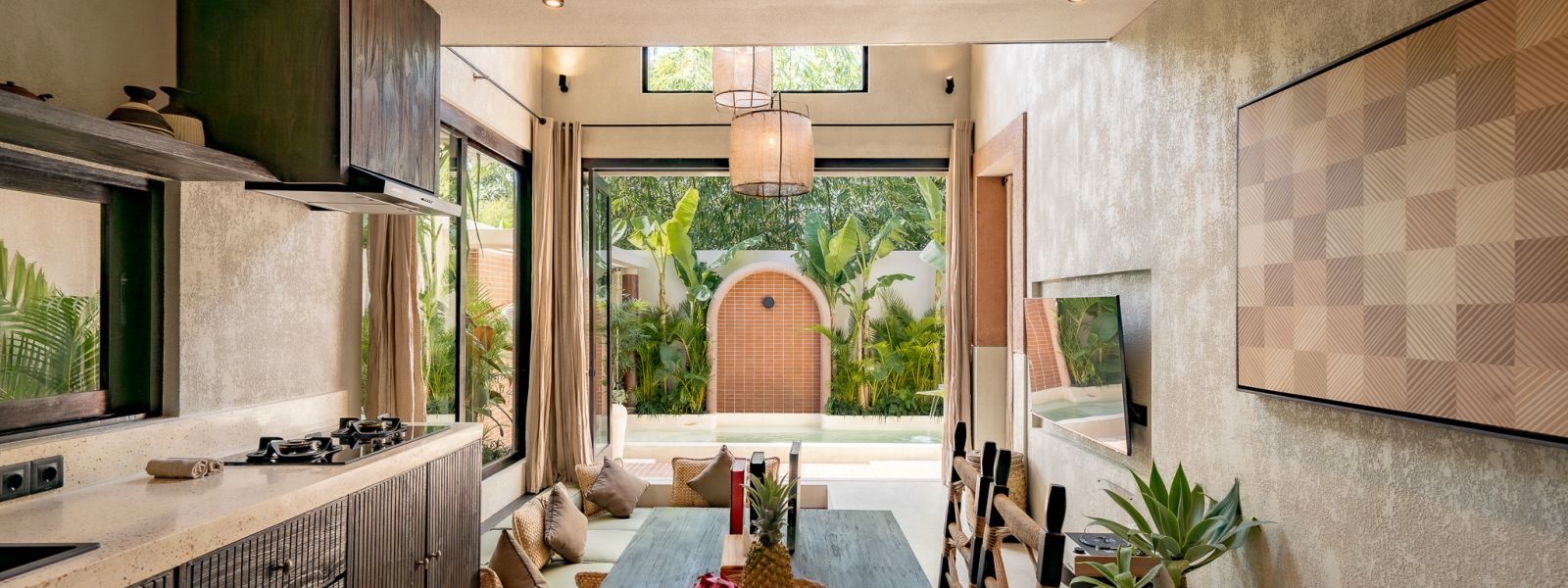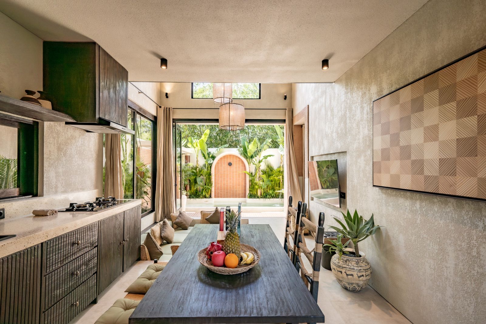 Designed in an Organic Mediterranean style, the loft showcases soft curves, earthy textures, and a calming tropical ambiance throughout. Inside, the space features 1 cozy bedroom, 1 stylish bathroom with a double rain shower, and a thoughtfully arranged kitchen, dining, and enclosed living area that flows seamlessly toward the swimming pool.
