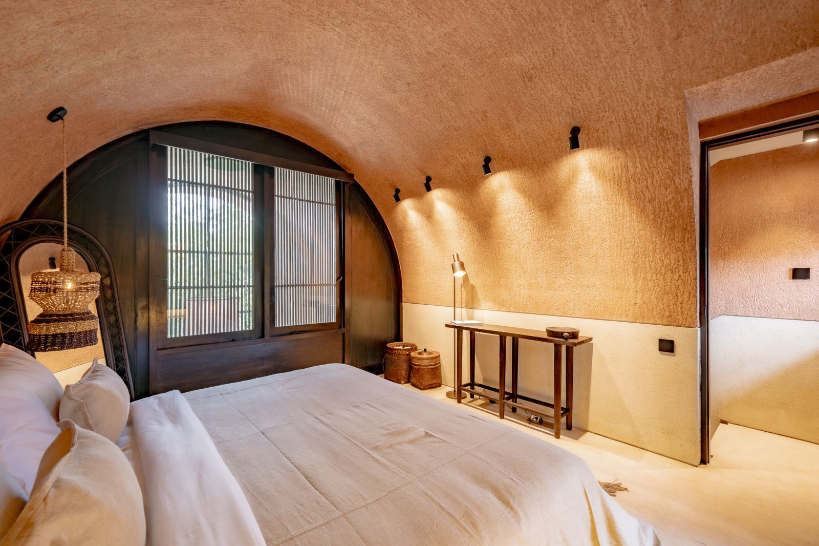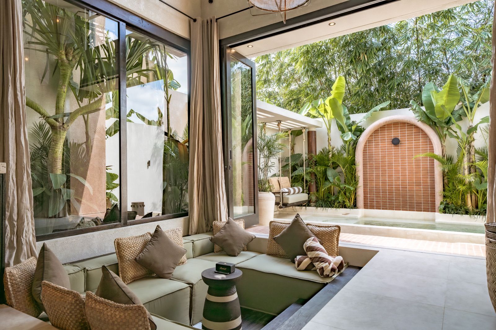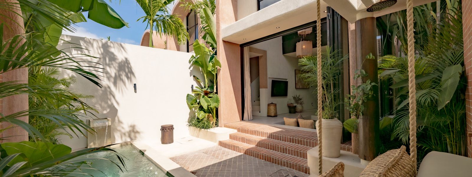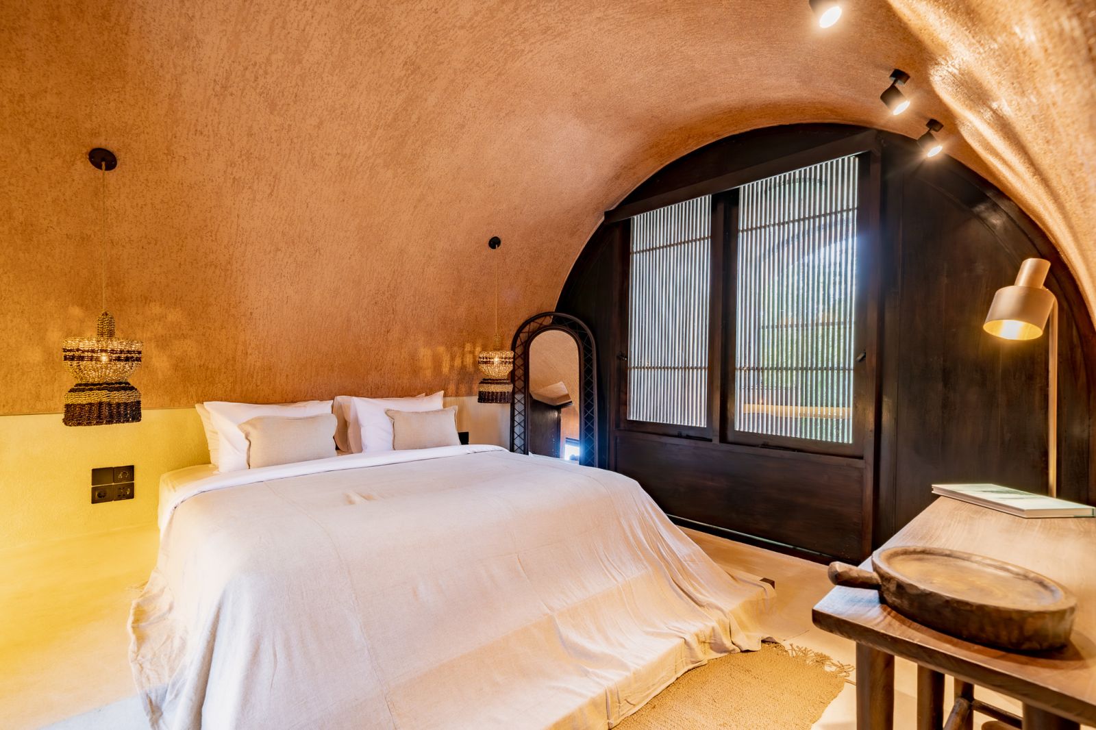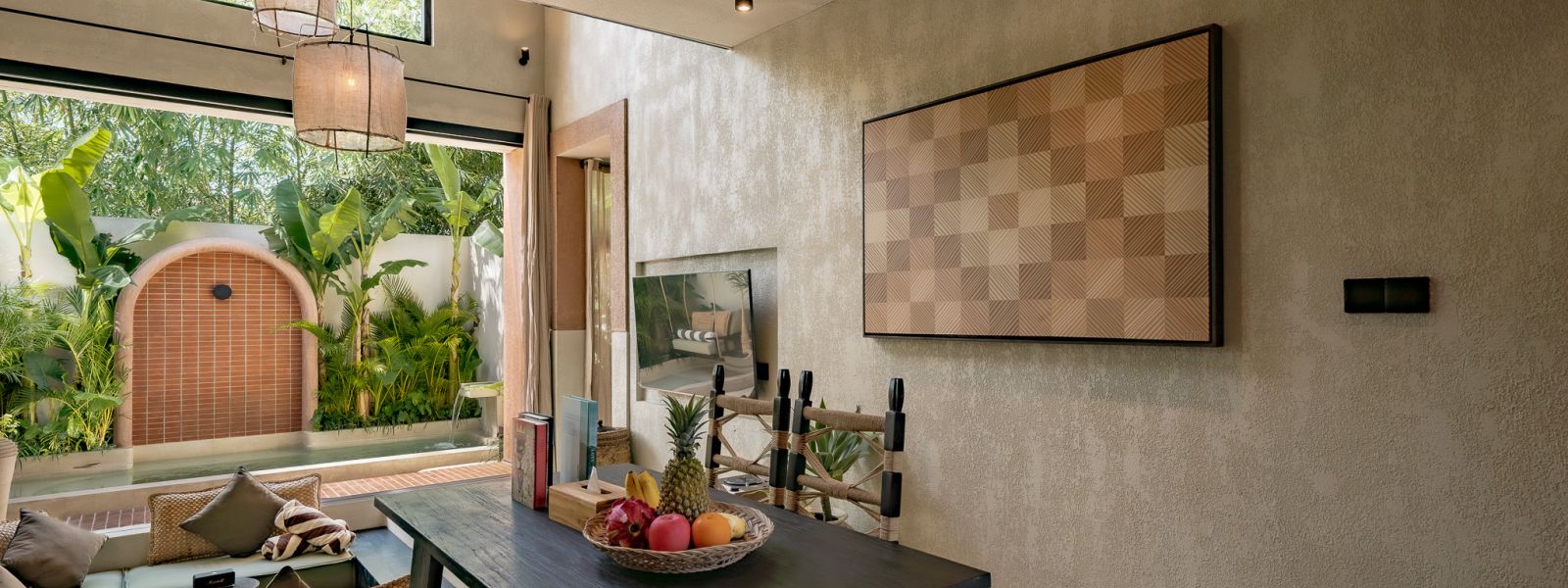 Designed in an Organic Mediterranean style, the loft showcases soft curves, earthy textures, and a calming tropical ambiance throughout. Inside, the space features 1 cozy bedroom, 1 stylish bathroom with a double rain shower, and a thoughtfully arranged kitchen, dining, and enclosed living area that flows seamlessly toward the swimming pool.