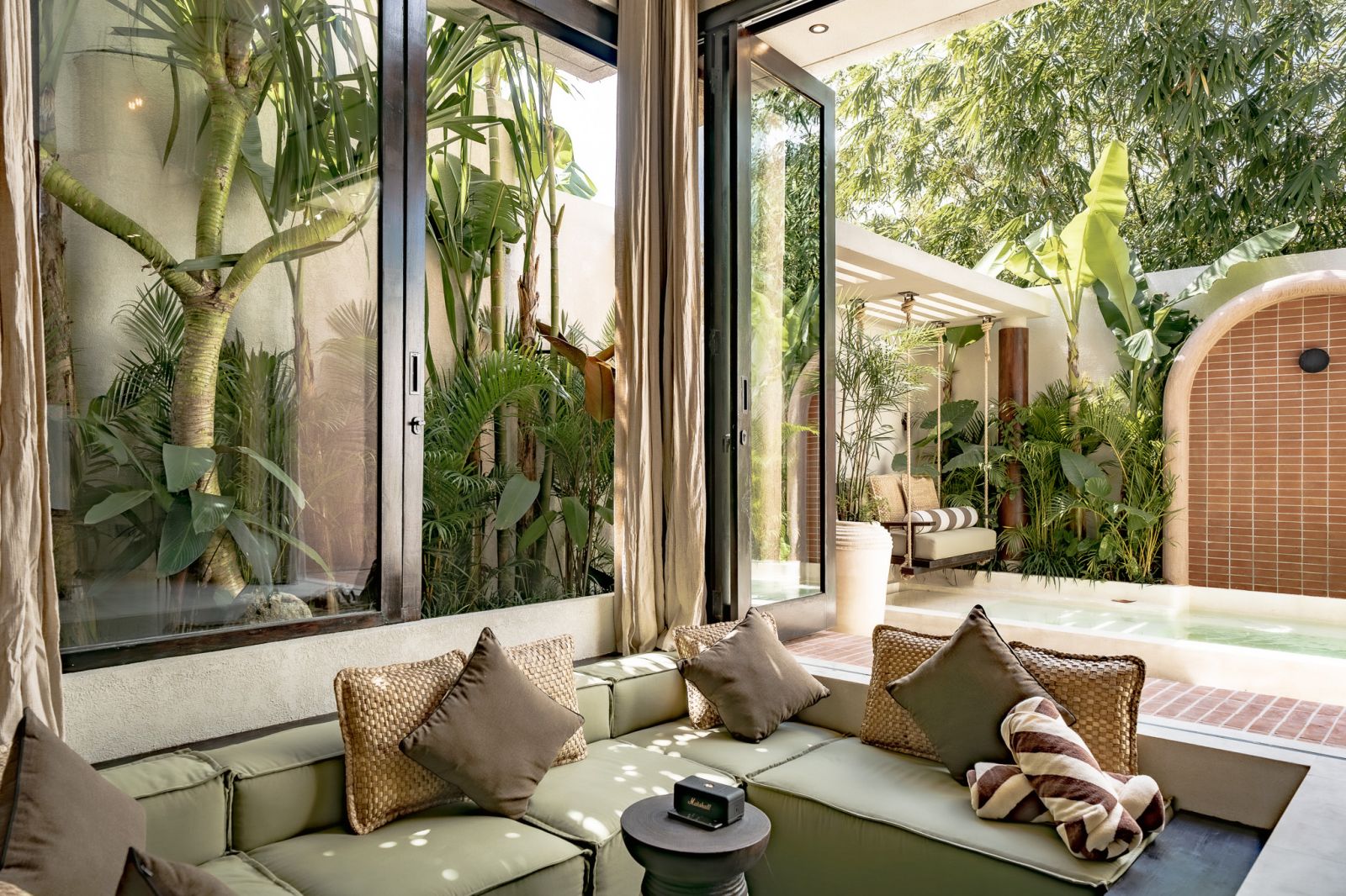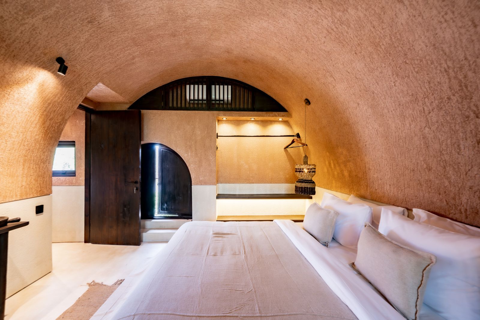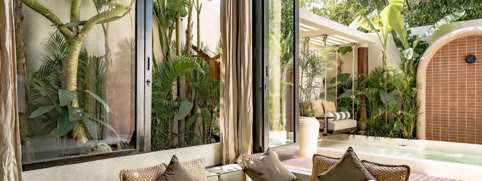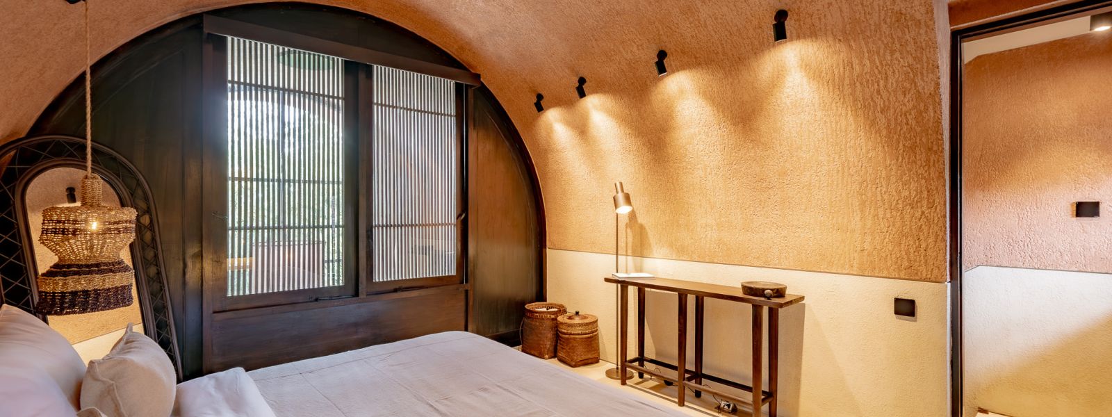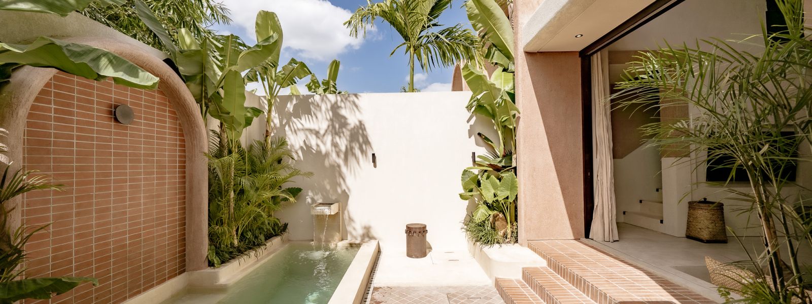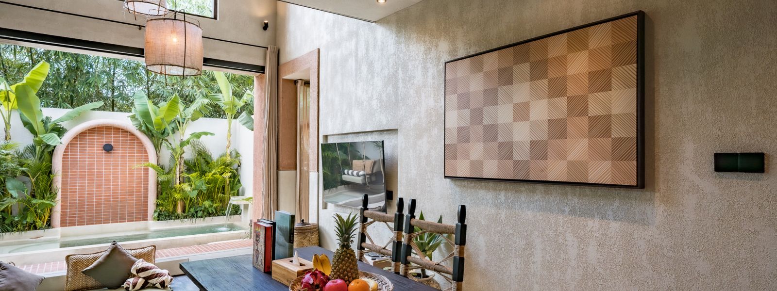 Designed in an Organic Mediterranean style, the loft showcases soft curves, earthy textures, and a calming tropical ambiance throughout. Inside, the space features 1 cozy bedroom, 1 stylish bathroom with a double rain shower, and a thoughtfully arranged kitchen, dining, and enclosed living area that flows seamlessly toward the swimming pool.