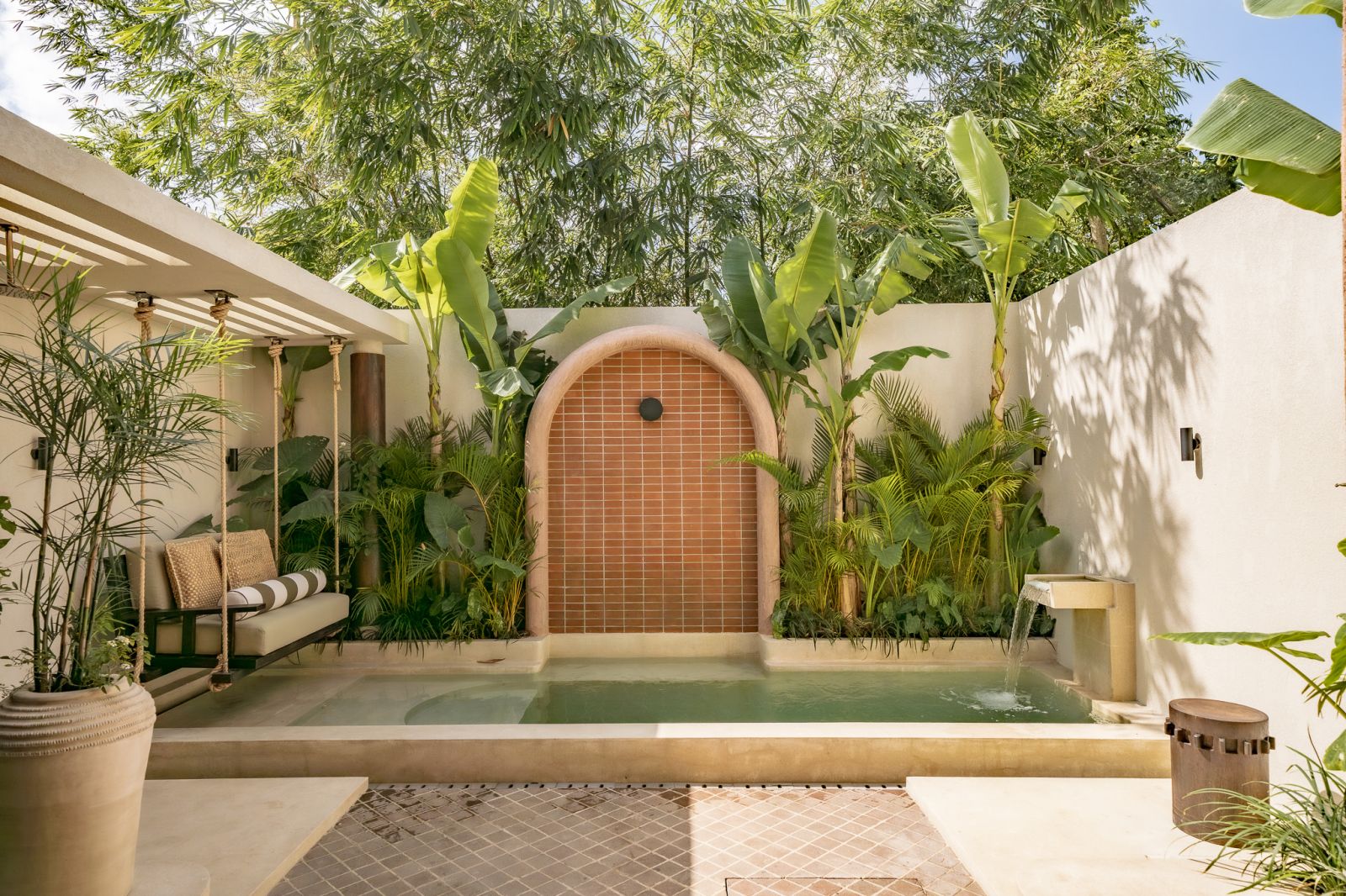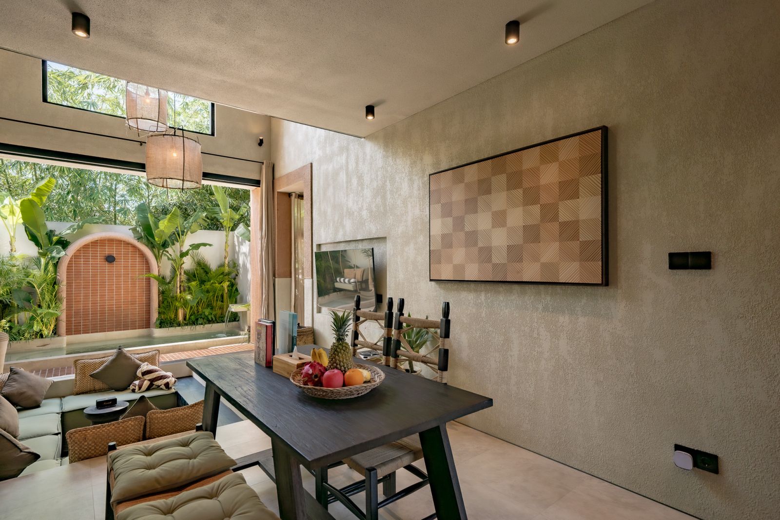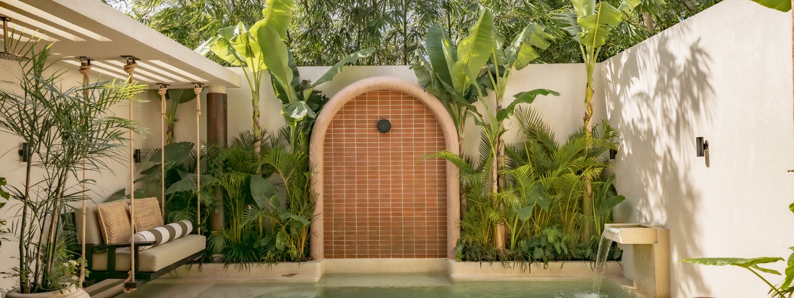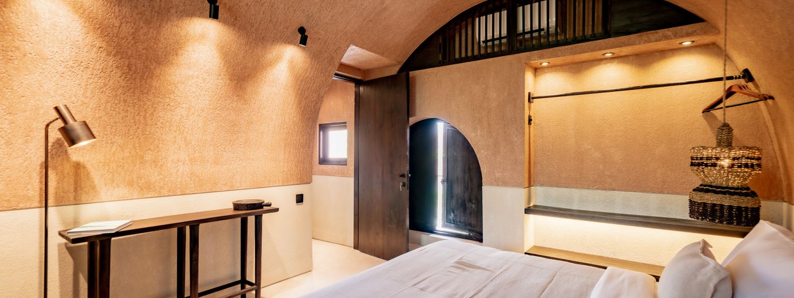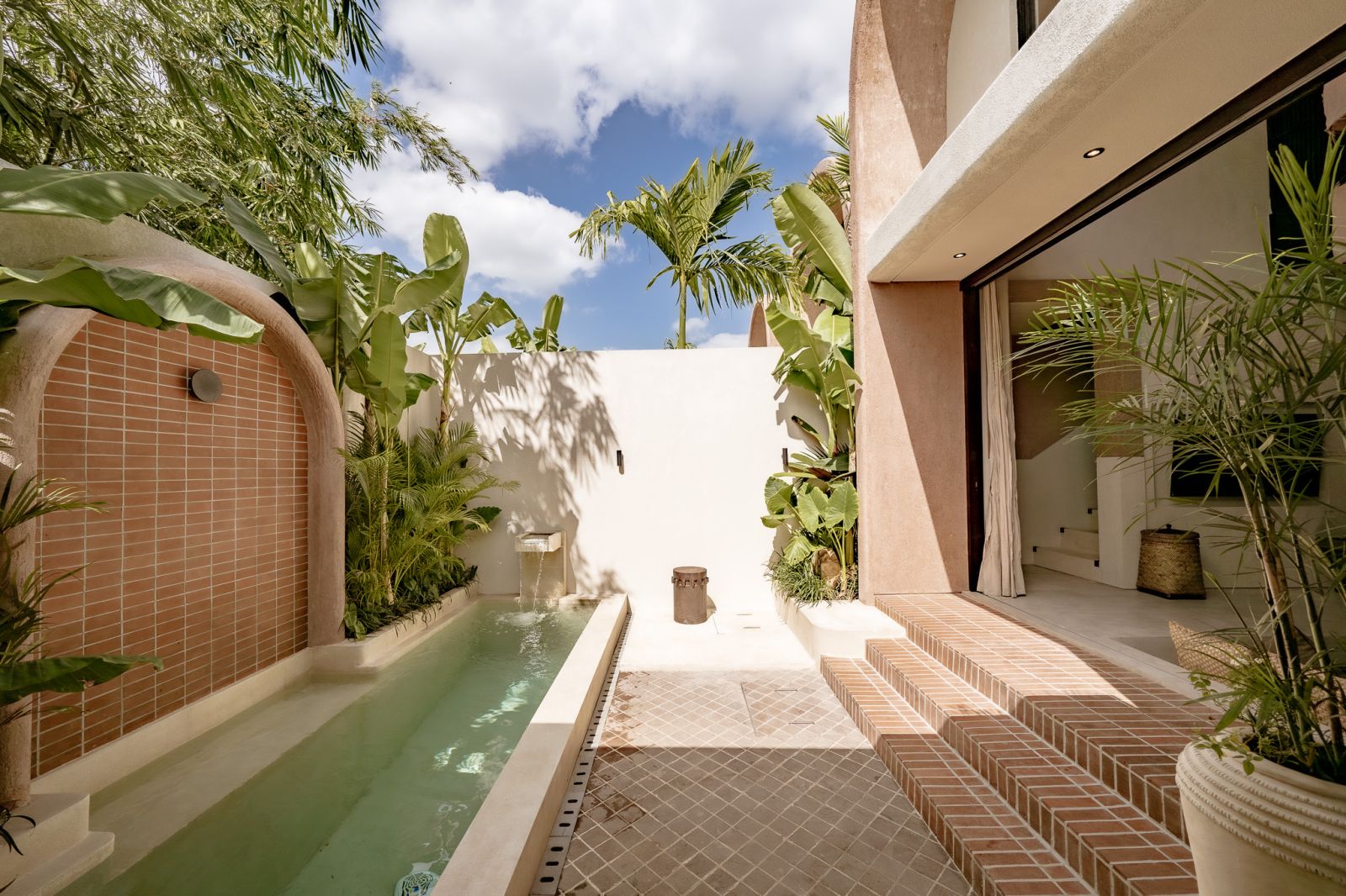 Designed in an Organic Mediterranean style, the loft showcases soft curves, earthy textures, and a calming tropical ambiance throughout. Inside, the space features 1 cozy bedroom, 1 stylish bathroom with a double rain shower, and a thoughtfully arranged kitchen, dining, and enclosed living area that flows seamlessly toward the swimming pool.