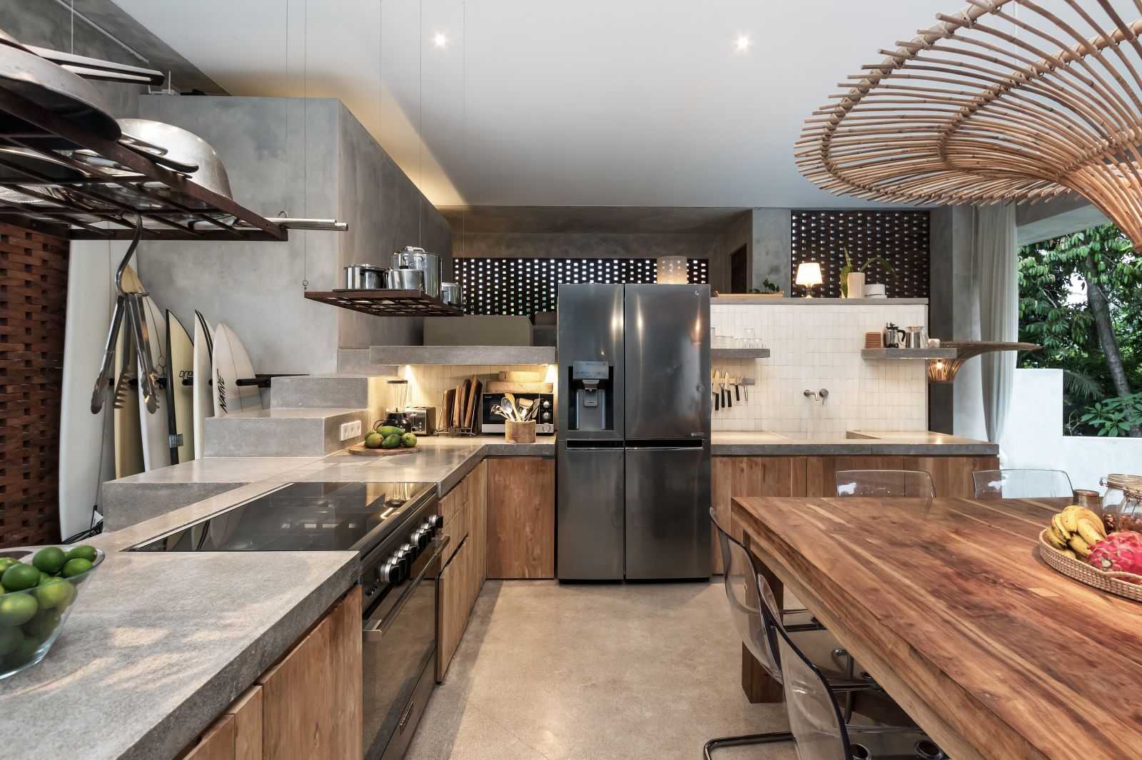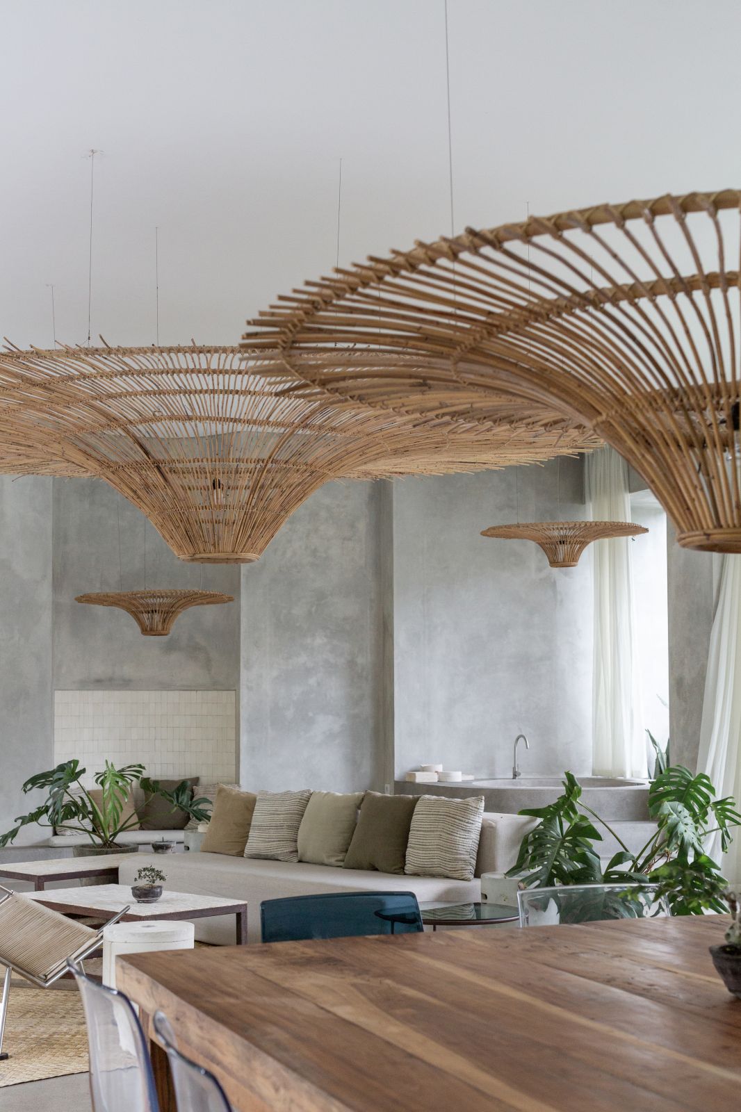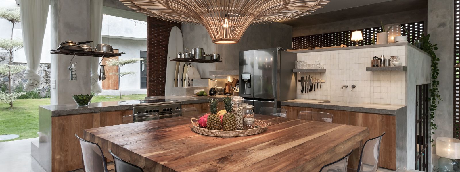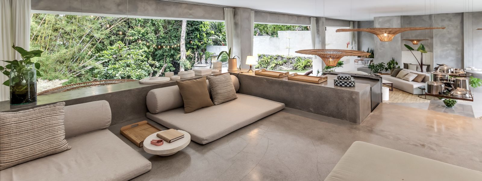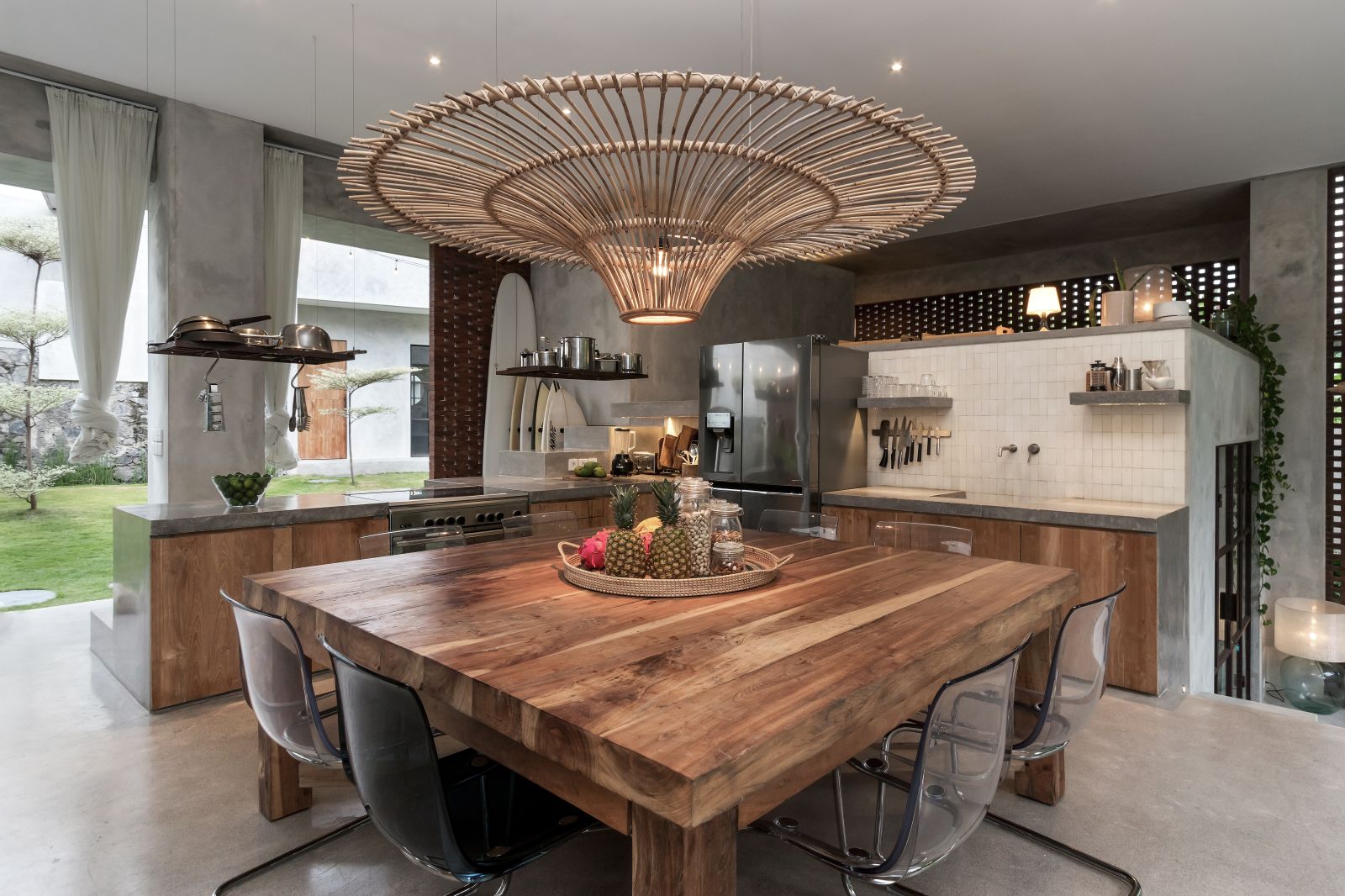 This villa showcases a refined blend of raw architectural elements and natural warmth, highlighted by its use of exposed concrete, wood accents, and lush greenery. The design feels grounded yet inviting, with handcrafted details such as the statement bamboo chandelier adding a unique artistic touch. Natural light fills the open-plan space, enhancing the textures and creating a calm, airy atmosphere throughout.