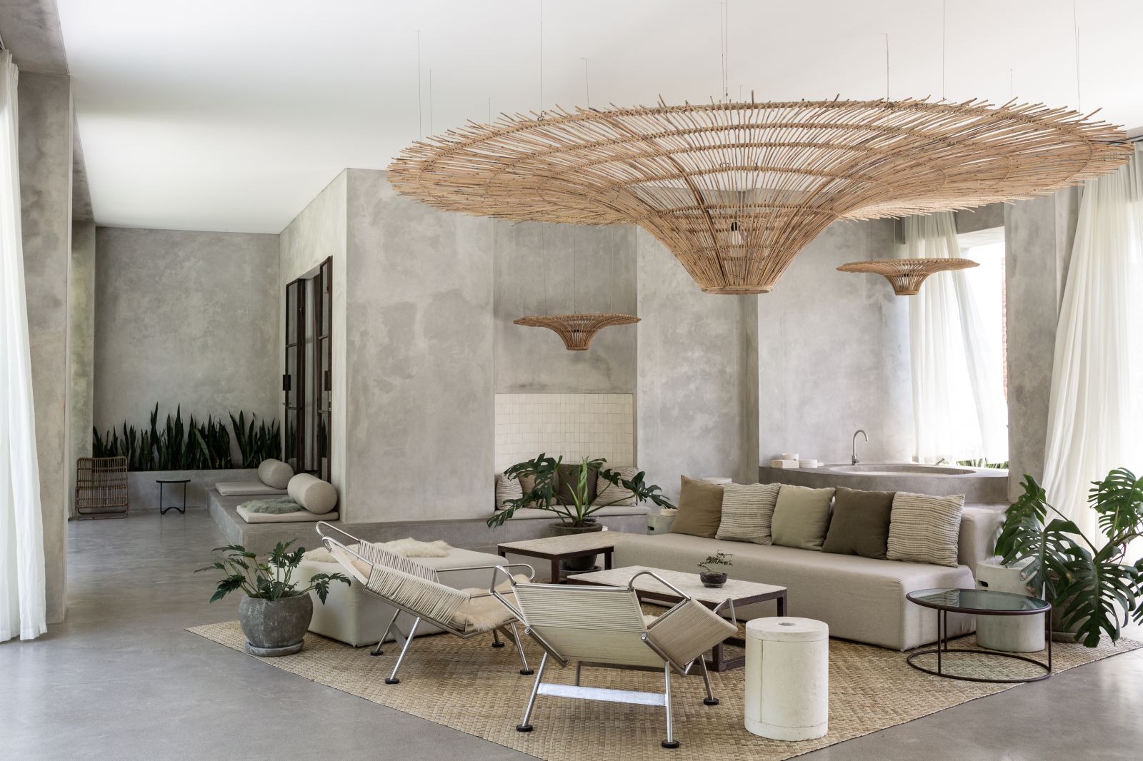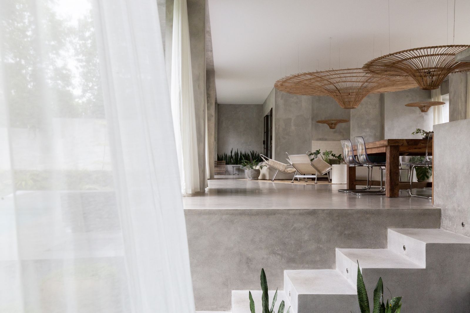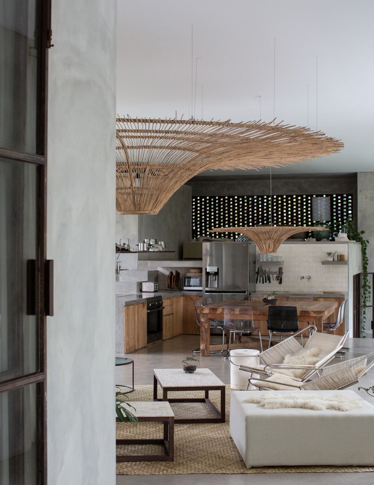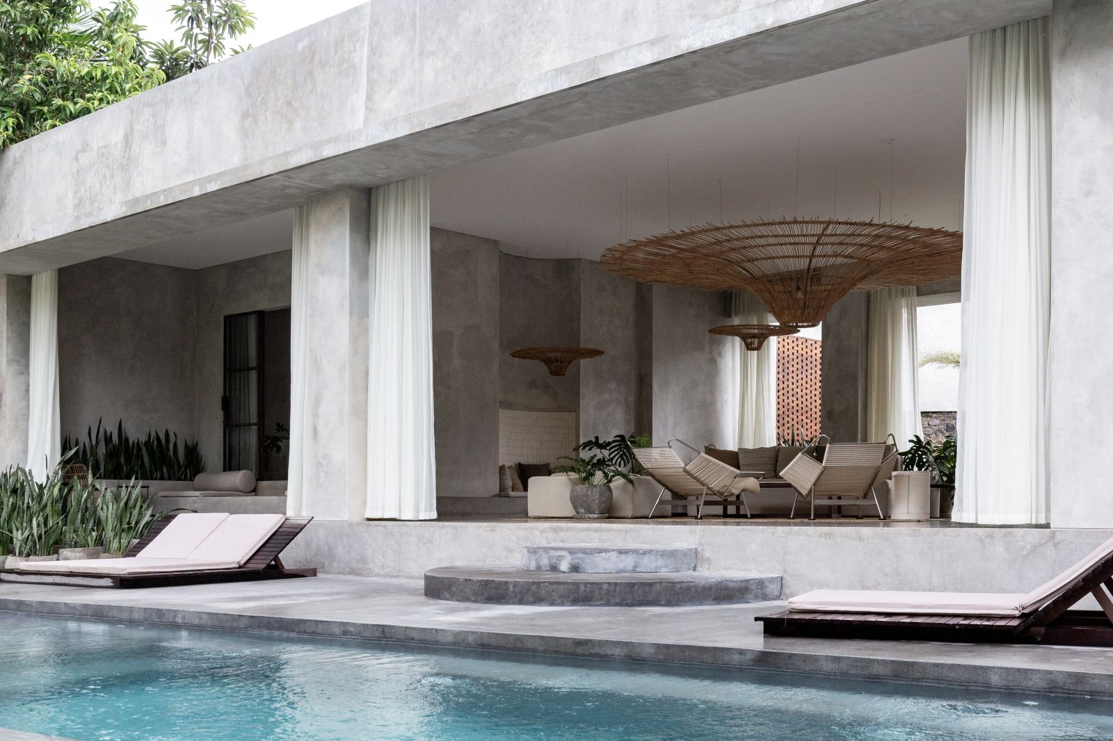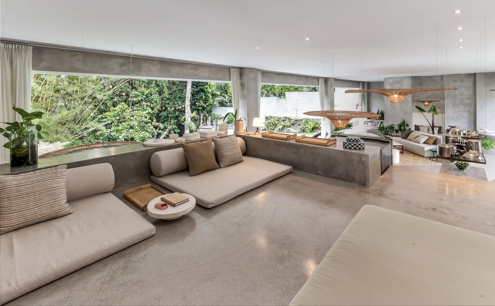 This villa showcases a refined blend of raw architectural elements and natural warmth, highlighted by its use of exposed concrete, wood accents, and lush greenery. The design feels grounded yet inviting, with handcrafted details such as the statement bamboo chandelier adding a unique artistic touch. Natural light fills the open-plan space, enhancing the textures and creating a calm, airy atmosphere throughout.