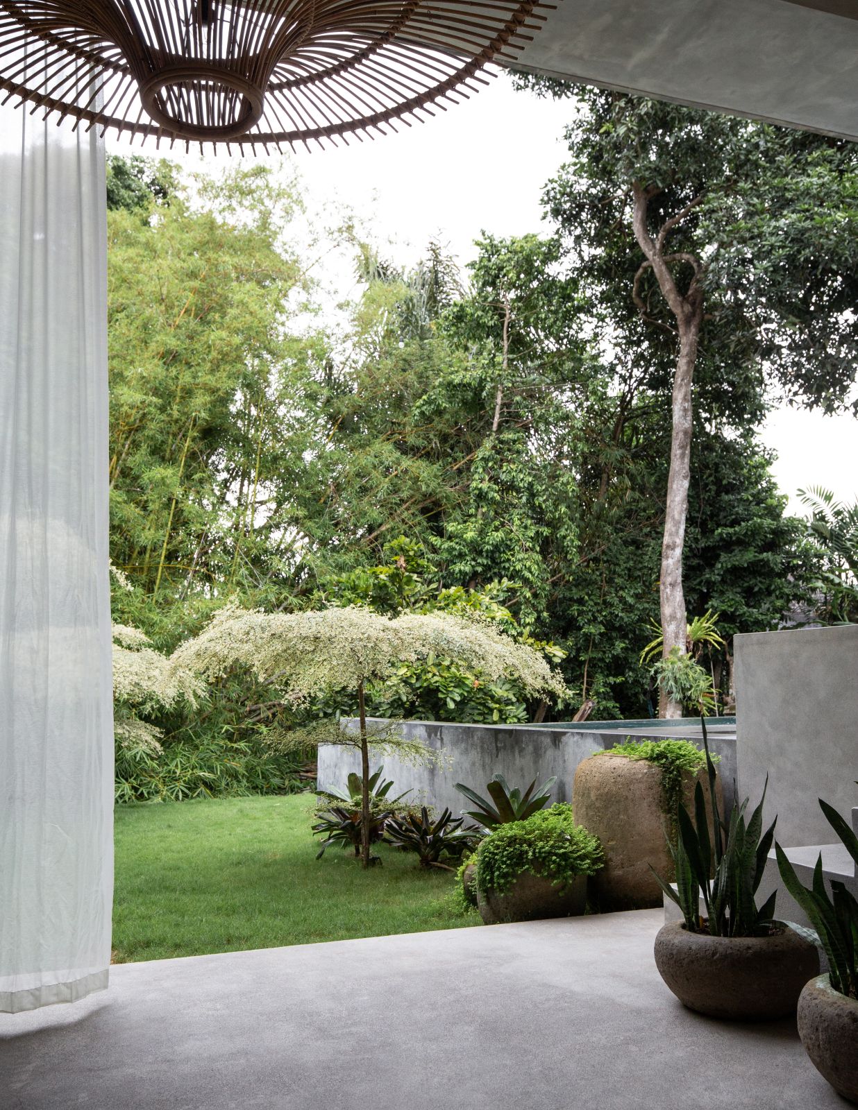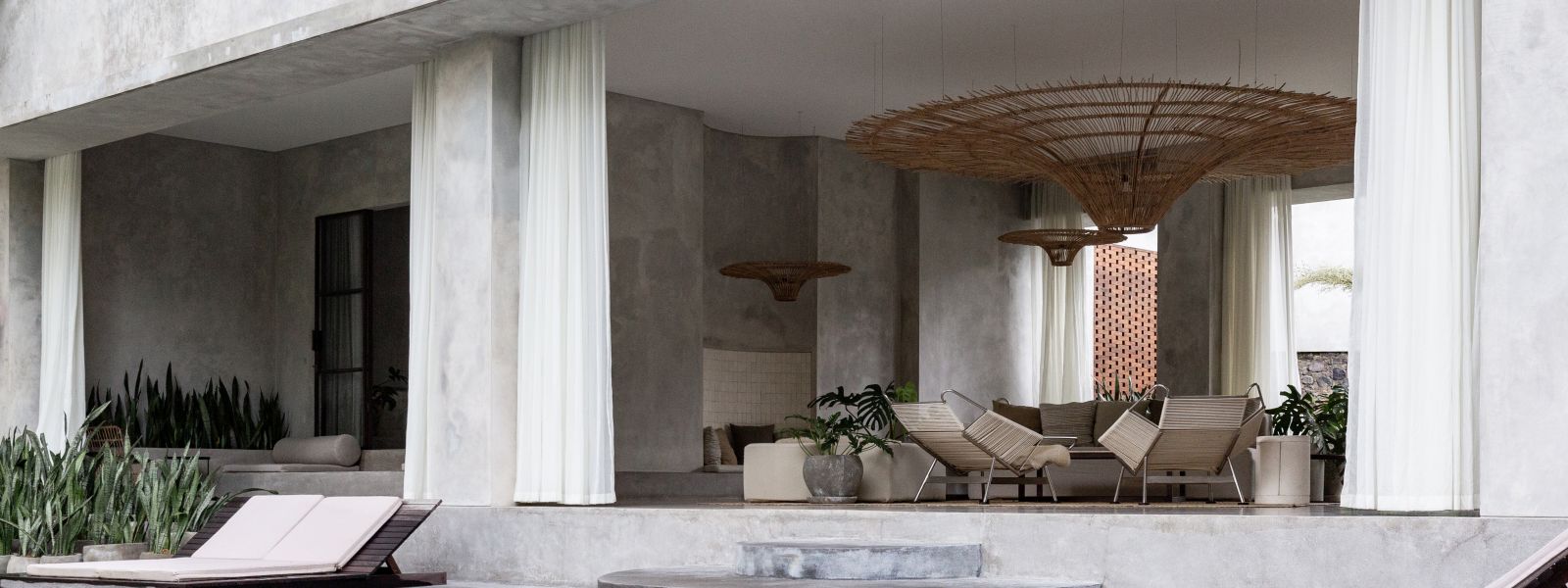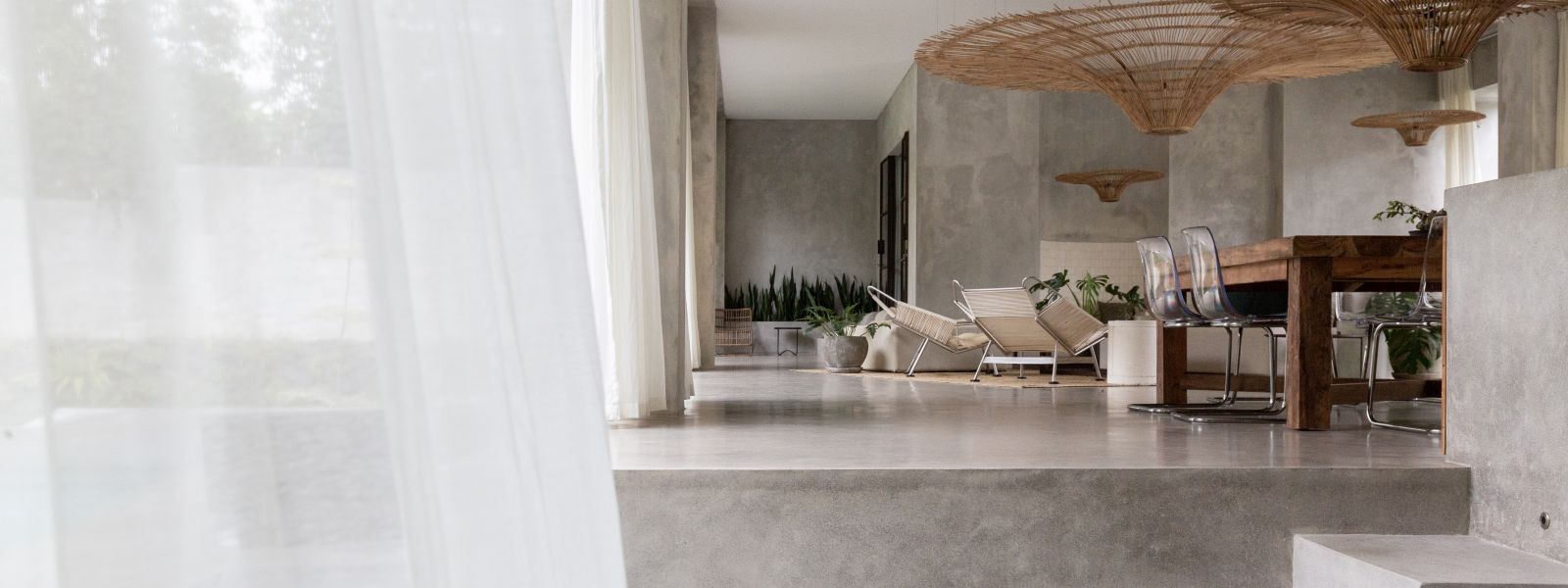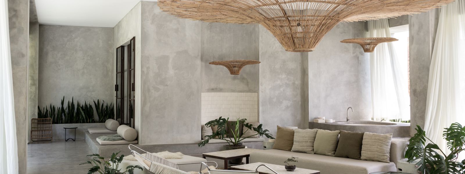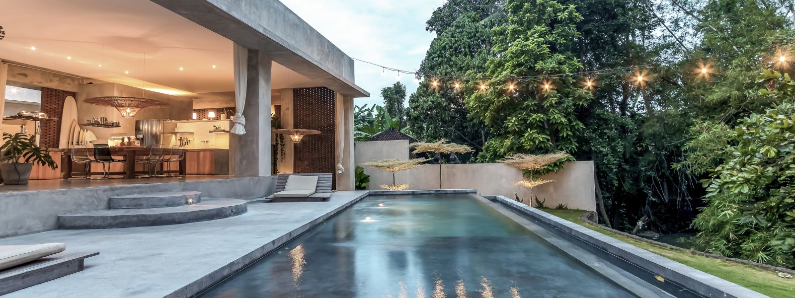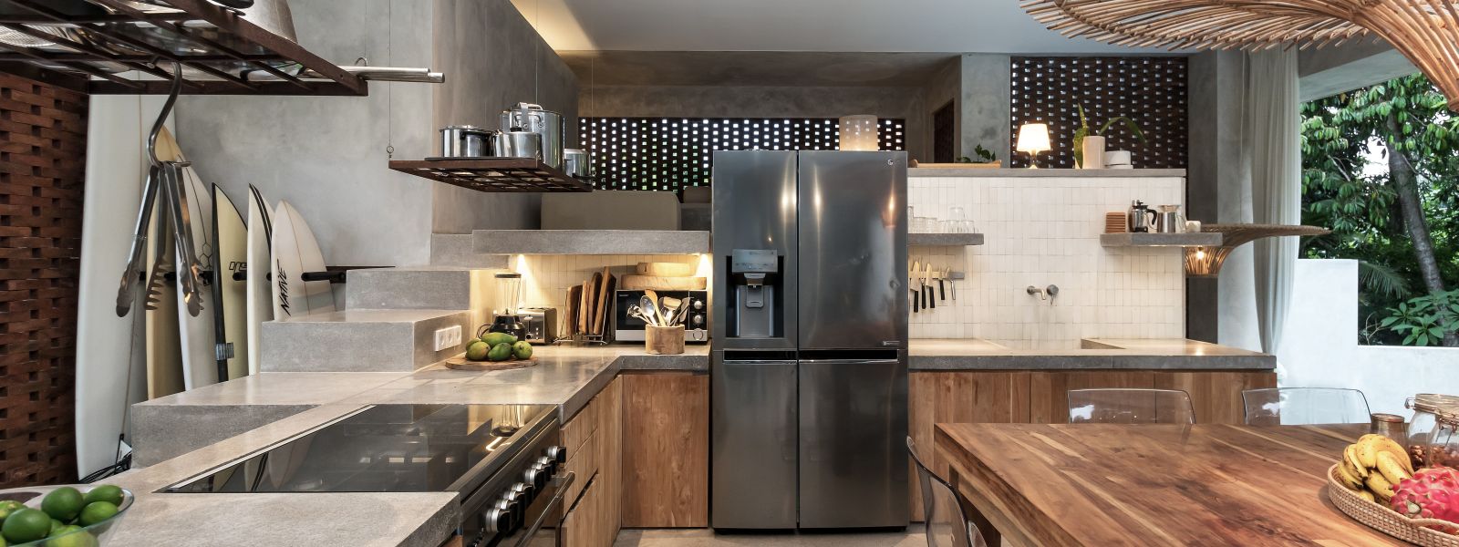 This villa showcases a refined blend of raw architectural elements and natural warmth, highlighted by its use of exposed concrete, wood accents, and lush greenery. The design feels grounded yet inviting, with handcrafted details such as the statement bamboo chandelier adding a unique artistic touch. Natural light fills the open-plan space, enhancing the textures and creating a calm, airy atmosphere throughout.