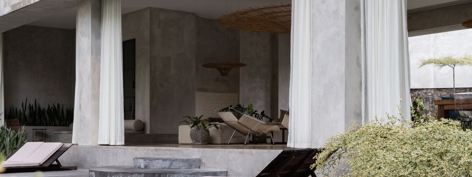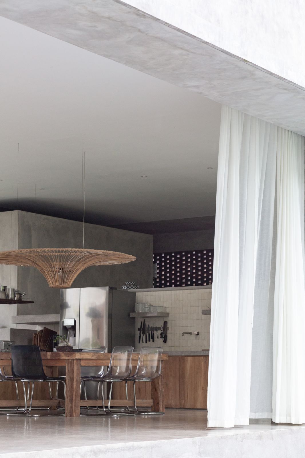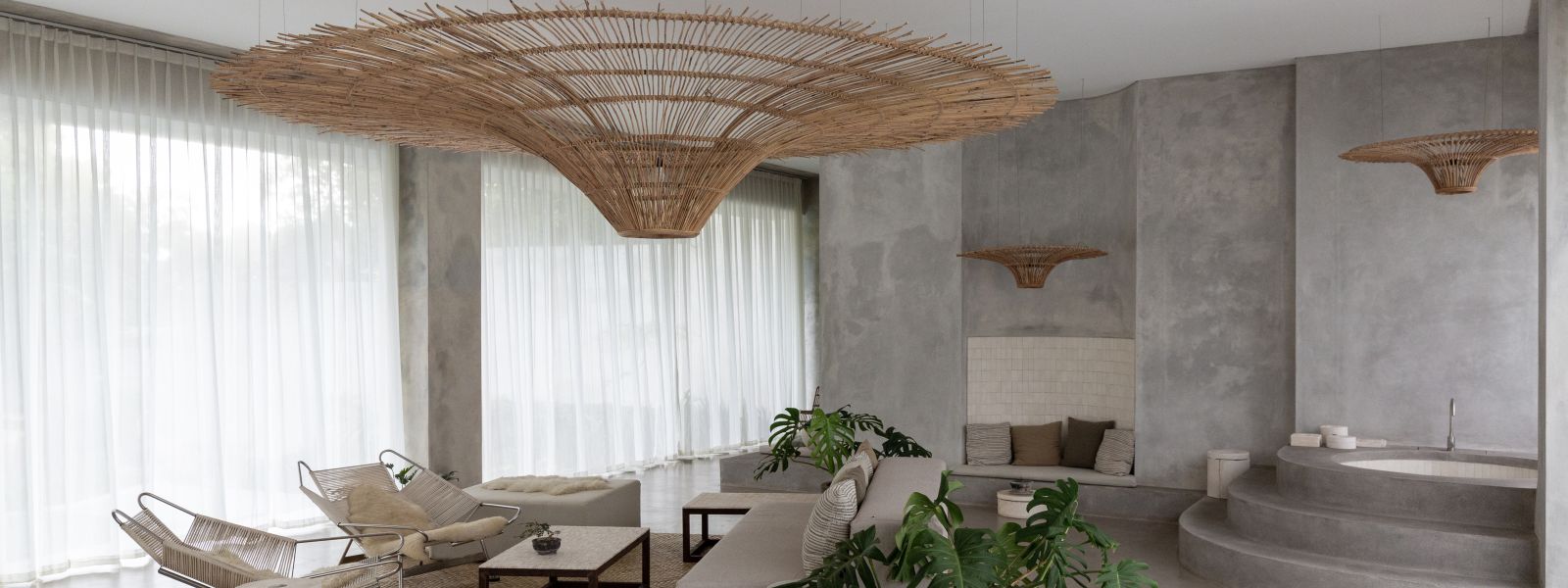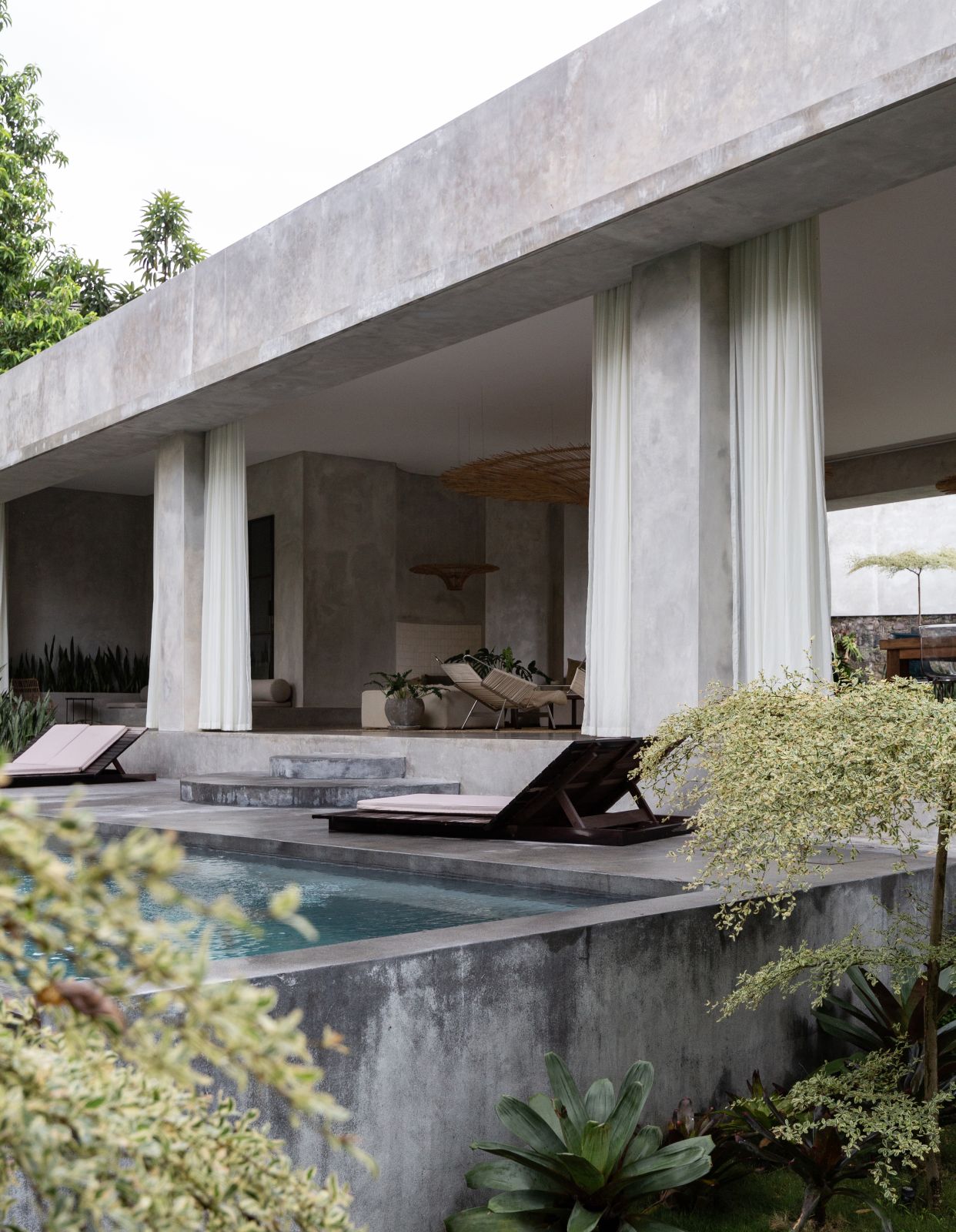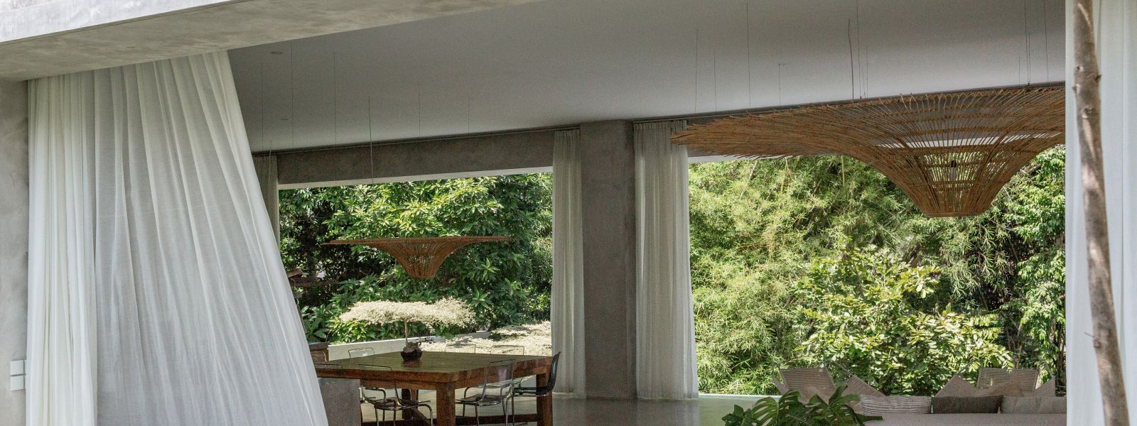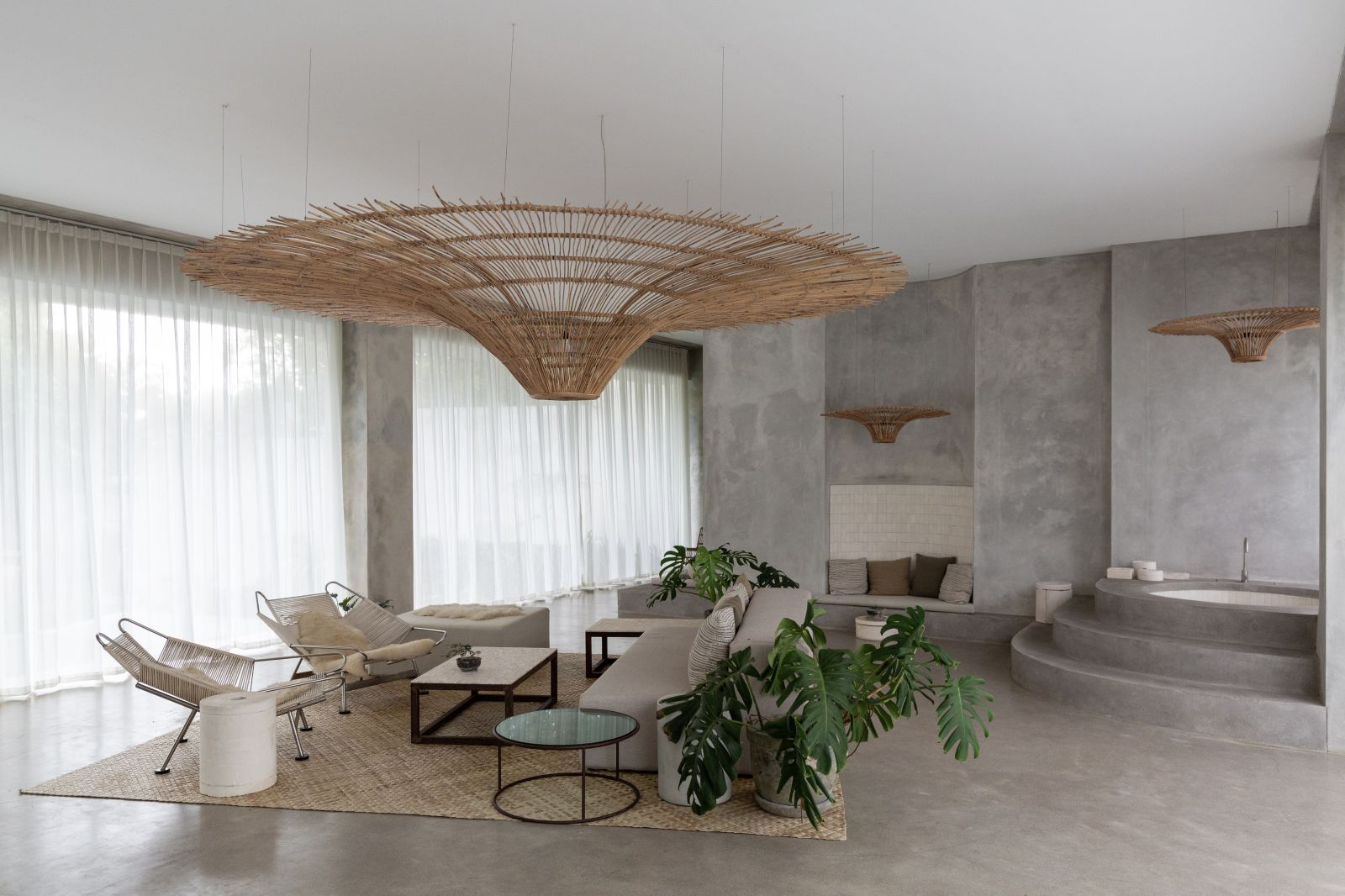 This villa showcases a refined blend of raw architectural elements and natural warmth, highlighted by its use of exposed concrete, wood accents, and lush greenery. The design feels grounded yet inviting, with handcrafted details such as the statement bamboo chandelier adding a unique artistic touch. Natural light fills the open-plan space, enhancing the textures and creating a calm, airy atmosphere throughout.
