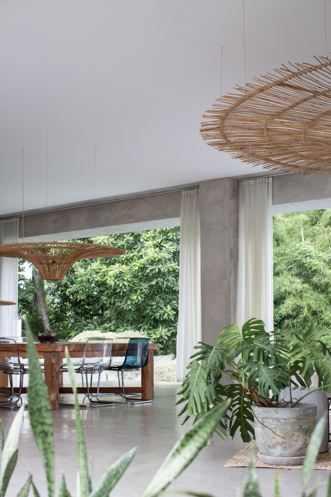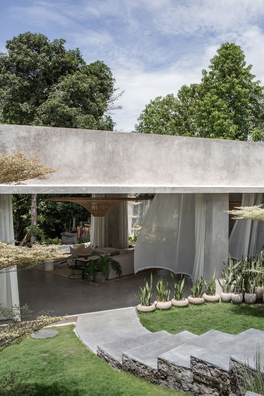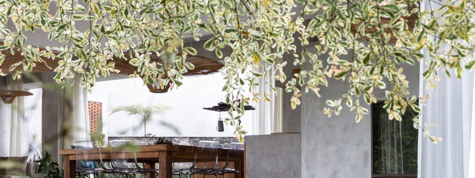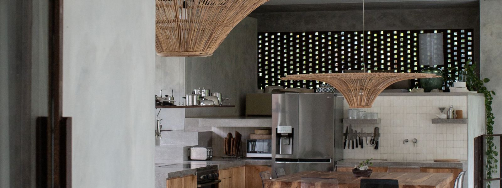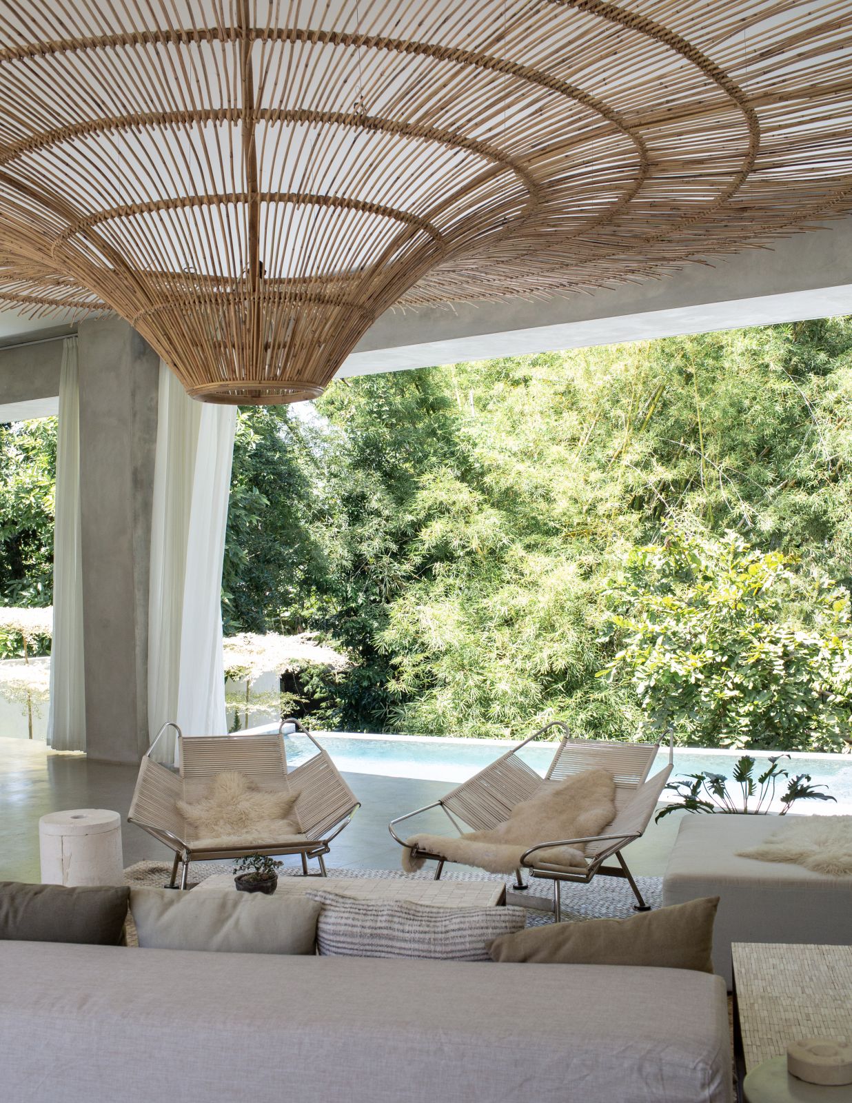 This villa showcases a refined blend of raw architectural elements and natural warmth, highlighted by its use of exposed concrete, wood accents, and lush greenery. The design feels grounded yet inviting, with handcrafted details such as the statement bamboo chandelier adding a unique artistic touch. Natural light fills the open-plan space, enhancing the textures and creating a calm, airy atmosphere throughout.