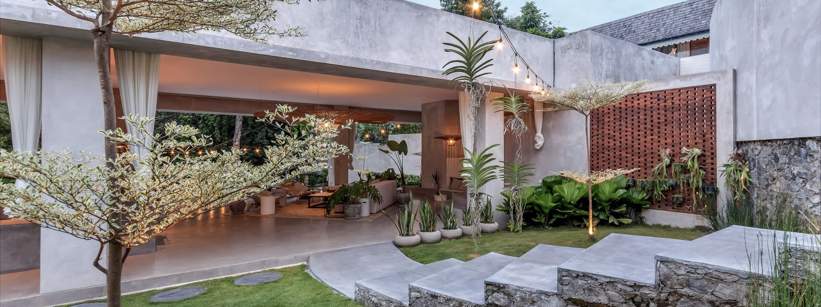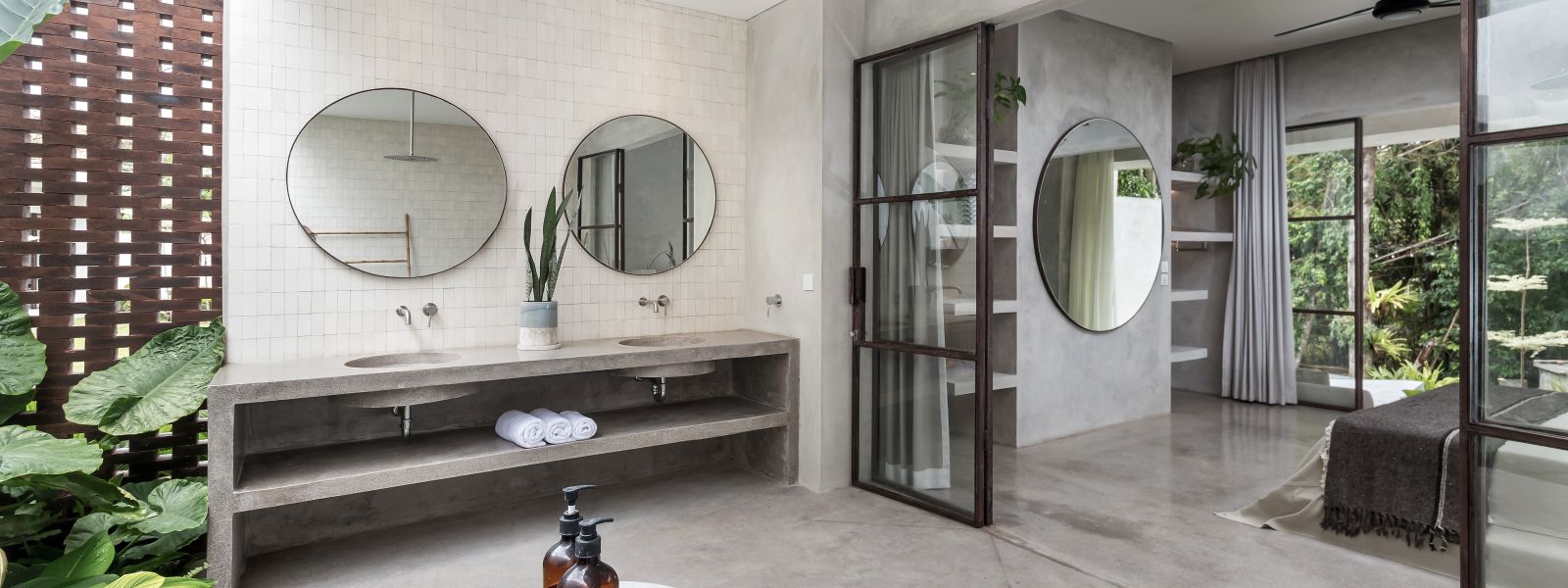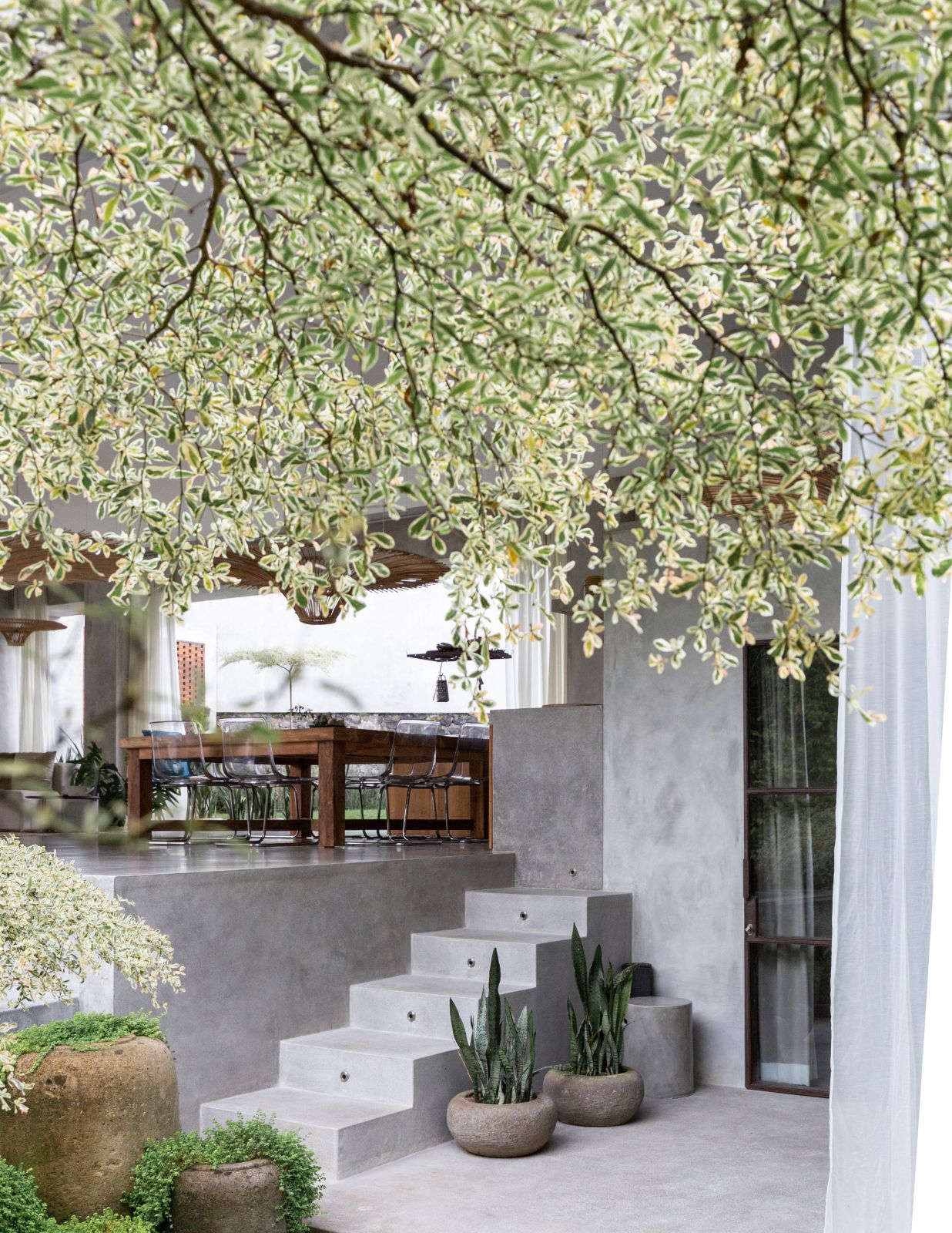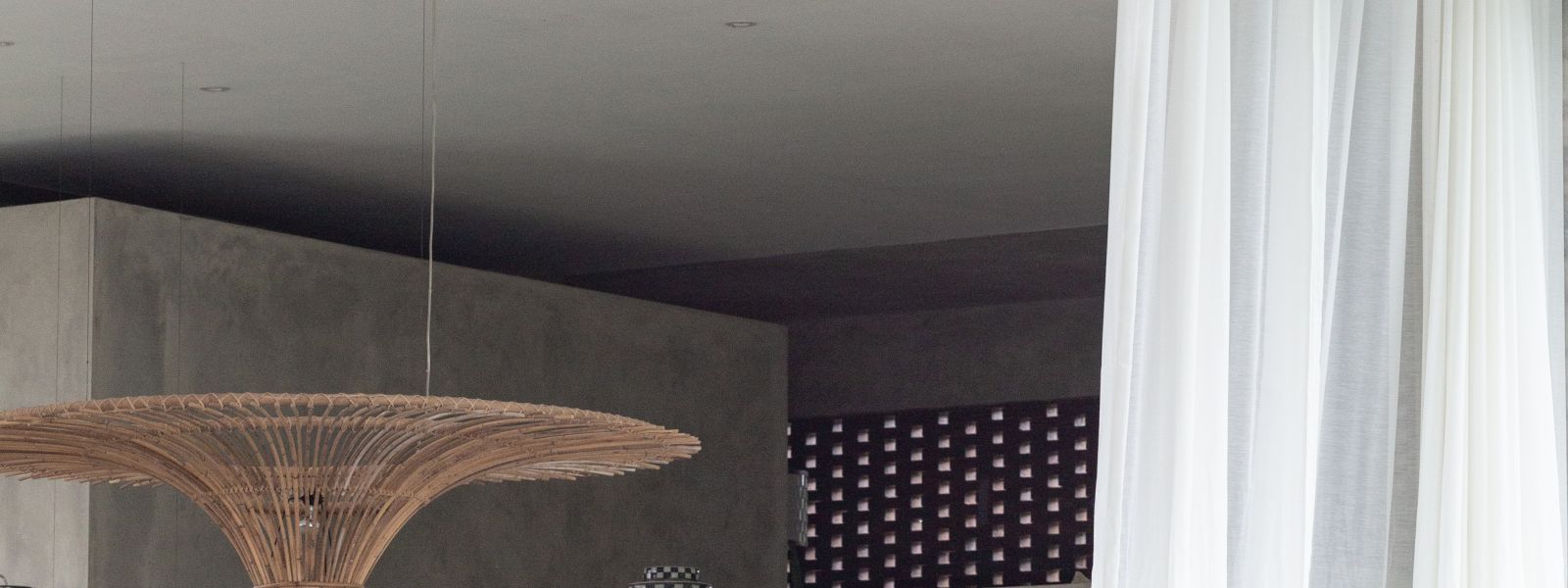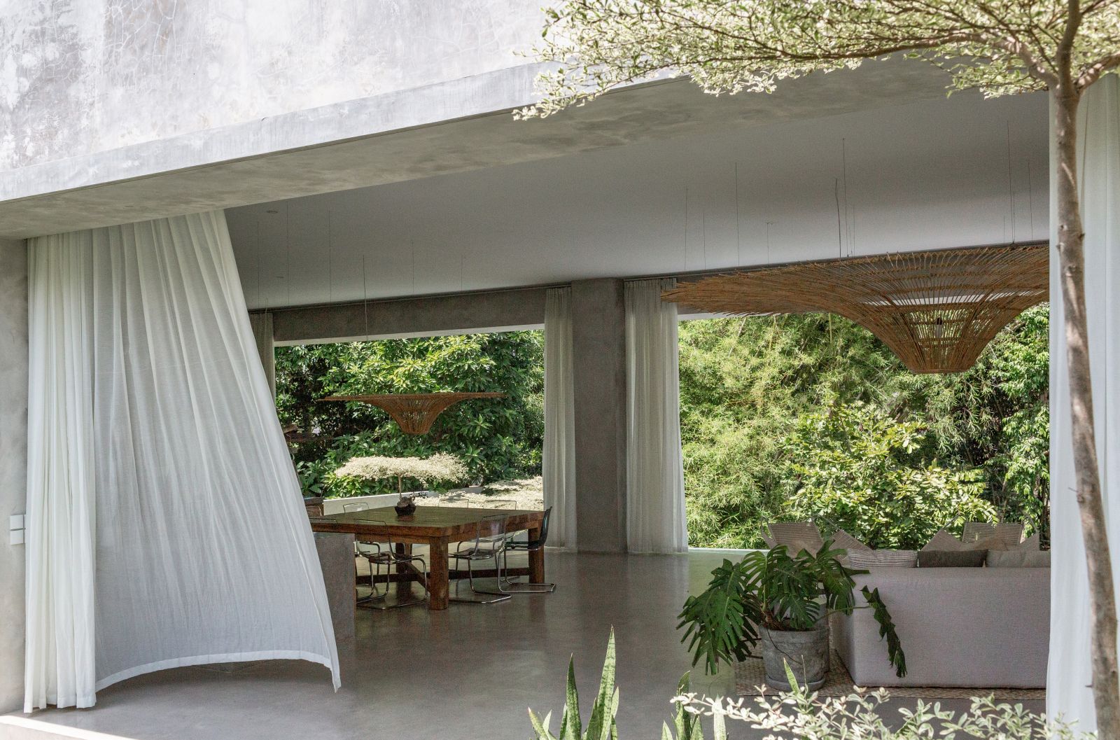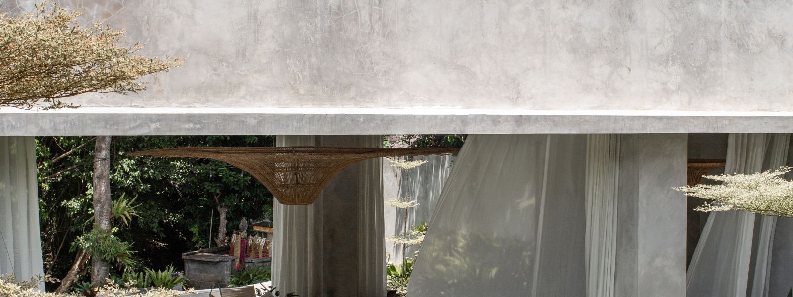 This villa showcases a refined blend of raw architectural elements and natural warmth, highlighted by its use of exposed concrete, wood accents, and lush greenery. The design feels grounded yet inviting, with handcrafted details such as the statement bamboo chandelier adding a unique artistic touch. Natural light fills the open-plan space, enhancing the textures and creating a calm, airy atmosphere throughout.